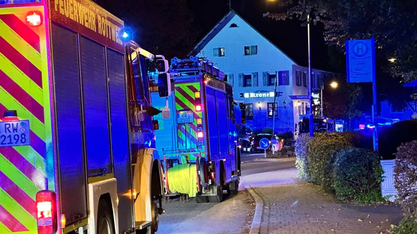 Mit großem Aufgebot sind die Retter am Freitagabend nach Villingendorf ausgerückt. Allein seitens der Feuerwehr waren 47 Kräfte mit zehn Fahrzeugen am Einsatz beteiligt, informierte Kreis-Feuerwehrsprecher Felix Kramer gemeinsam mit dem Rottweiler stellvertretenden Stadtbrandmeister Markus Württemberger, der mit seinem Team die Einsatzleitung unterstützte. Das DRK stellte 14 ehrenamtliche Kräfte mit fünf Fahrzeugen, einer davon das Team eines Rettungswagens mit weiteren DRK-Rettern, so DRK-Kreisbereitschaftsleiter Michael Häring. Die Polizei war mit zwei Streifen am Einsatzort. Gemeldet worden war ein Gebäudebrand. Das Feuer in der „Krone“ forderte einen Verletzten: Der 52-jährige angestellte Koch habe Verbrennungen an den Händen und im Gesicht erlitten, heißt es im Bericht des Polizeipräsidiums Konstanz.