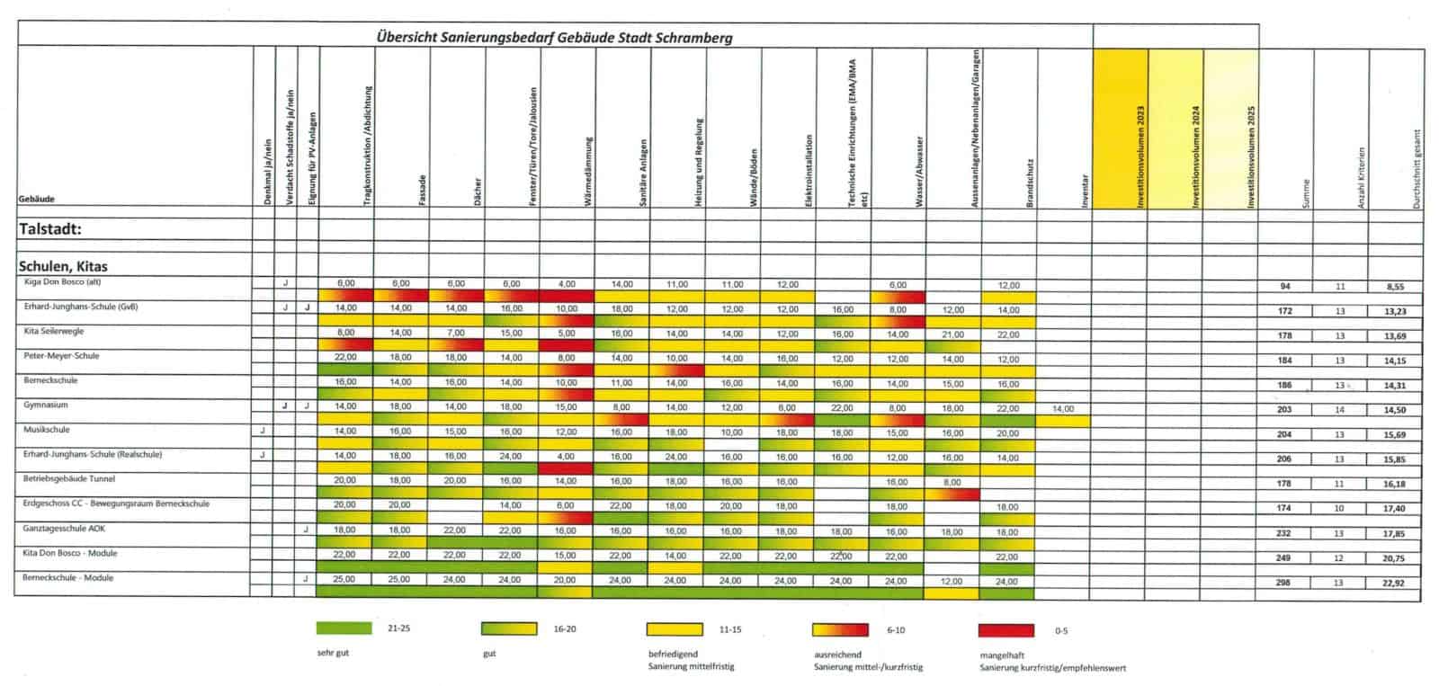 Die Listen sind dann dieser Bewertungsskala entsprechend sortiert, die schlechtesten Gebäude oben, die besten unten. Ebenfalls angefügt sind drei Spalten für mögliche Investitionssummen in den nächsten Jahren. Diese müssten aber noch geschätzt werden.
