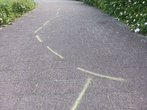 Gelbe Markierungen auf einer Zufahrt zu einer Gaststätte, dann weitere Striche auf dem Gehweg beim Pfaff-und-Schlauder-Wehr. Dort auch eine größere Markierung – ähnlich wie bei einem Verkehrsunfall – aber wieso…