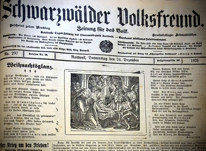 An Weihnachten 1925 war in Rottweil und der Region von den später sprichwörtlichen „goldenen Zwanzigerjahren“ noch nichts zu spüren. Zwar herrschten frühlingshafte Temperaturen, die Stimmung aber war frostig. Das zeigt…