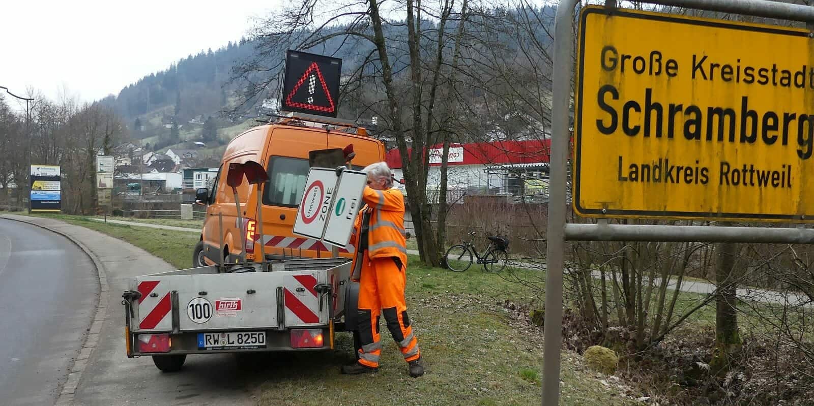 Schramberg. Eine Eisenkette liegt um den Metallpfahl geschlungen. Ein Knopfdruck und der Hydraulikarm am Fahrzeug der Straßenmeisterei zieht den Pfahl samt Betonsockel und Schild aus dem weichen Boden. Am Stadteingang…