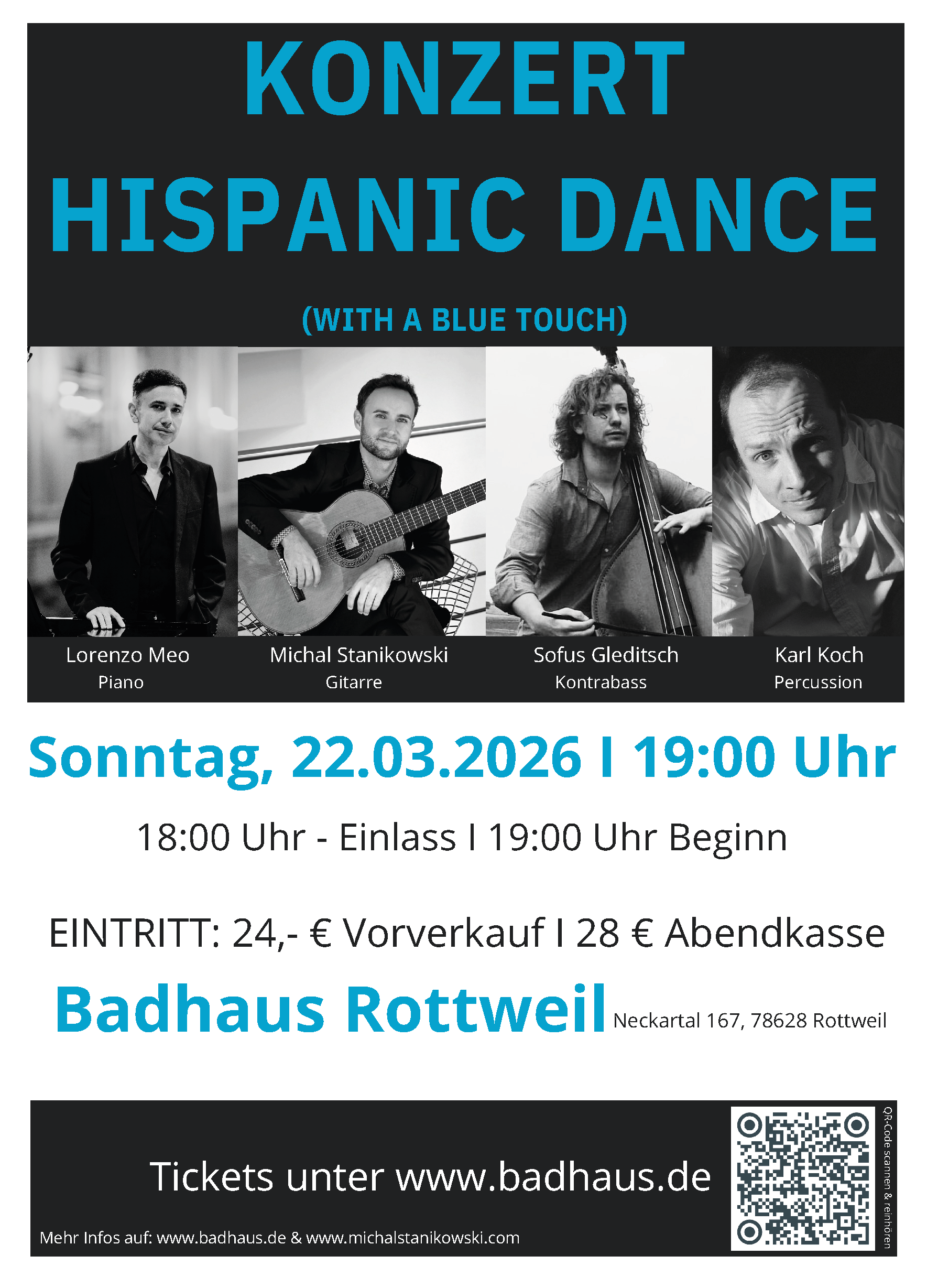 Rottweil. Ein Abend voller Farben, Rhythmus und Emotionen: Unter dem Titel „Hispanic Dance (with a Blue Touch)” lädt eine hochkarätig besetzte Jazz-Combo am Sonntag, 22. März 2026, ins Badhaus Rottweil ein. Ab 19 Uhr verschmelzen dort spanische, lateinamerikanische und weltmusikalische Klangwelten zu einem Konzert, das Klassik und Jazz auf besondere Weise zusammenführt.