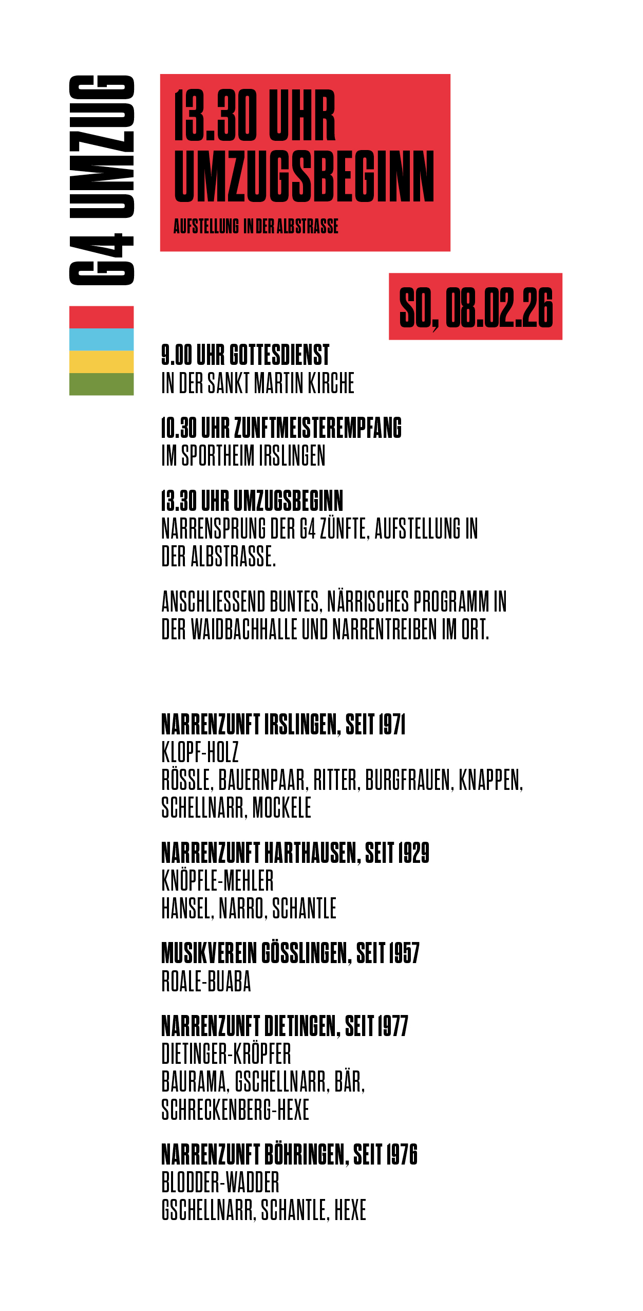Irslingen bereitet sich auf ein besonders stimmungsvolles Fasnet-Wochenende vor: Am Freitag, 6. Februar, und Sonntag, 8. Februar 2026, lädt die Narrenzunft Irslingen e. V. zum G4-Treffen mit Nachtumzug ein. Der kleine Dietinger Ortsteil wird damit erneut zum Treffpunkt der Narrenzünfte aus der Region und zum Anziehungspunkt für zahlreiche Besucherinnen und Besucher.