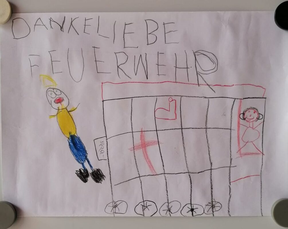 Durch die automatische Brandmeldung außerhalb der Arbeitszeiten des Unternehmens, konnte Schaden am Gebäude verhindert werden. Eine nette Überraschung stellte sich beim Abrüsten der eingesetzten Atemschutzgeräteträger ein: Während die eingesetzten Kräfte ihre mit Brandrauch kontaminierte und stark verschmutzte Einsatzkleidung ablegen und mit sauberer Einsatzkleidung aus dem entsprechenden Rollcontainer ausgestattet wurden, wurde zwischen der Ausrüstung ein selbstgemaltes Bild eines Kindes gefunden. Das Bild entstand offensichtlich beim Besuch der Kindergartenkinder des Dunninger Waldkindergartens, die sich herzlich bei der Feuerwehr bedankten.
