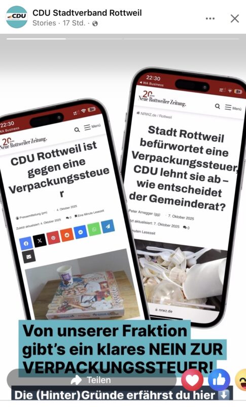 ❌ widersprüchlich zum Ziel, wirtschaftliche Freiräume zu schaffen – wir müssen Bürokratie abbauen, nicht neue schaffenrottweil #verpackungssteuer #cdu #cdurottweil #ausdermitte