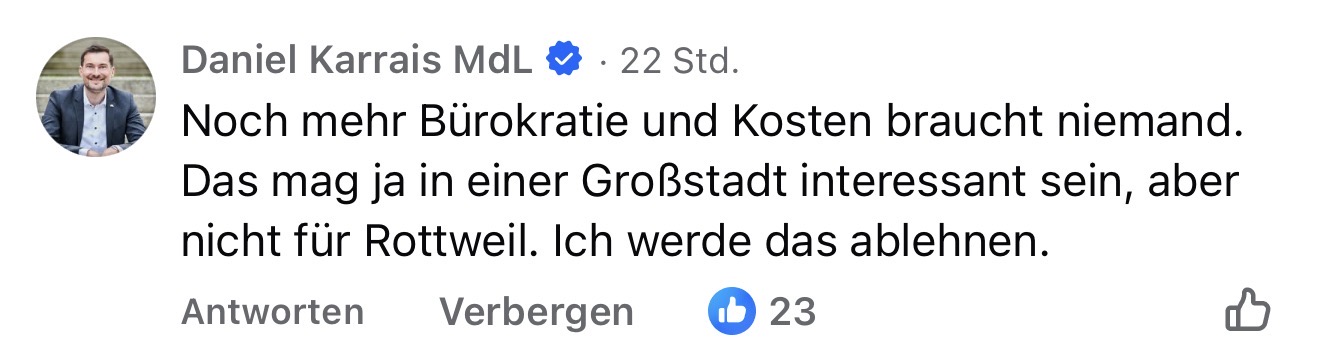 Auch der Gemeinderat und Landtagsabgeordnete der FDP, Daniel Karrais, hat sich im Vorfeld festgelegt. Hier etwa auf der Facebook-Seite der NRWZ: