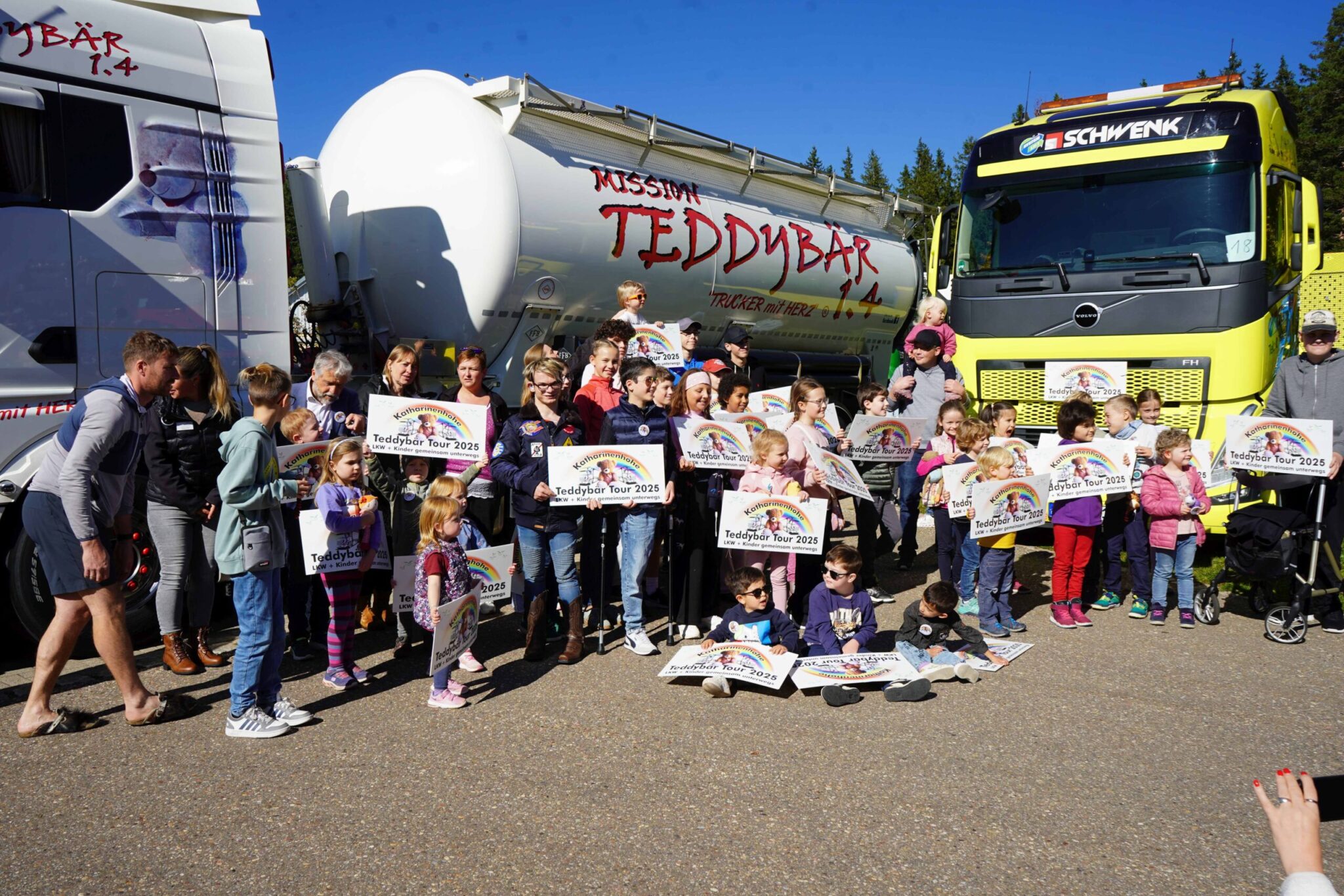 Ein laut den Initiatoren riesiger Erfolg wurde die sechste Auflage der Teddybär-Tour für die Kinder und Jugendlichen der Rehaklinik Katharinenhöhe: Mit 69 LKWs machten sich 74 Patienten als Beifahrer auf die Tour und wurden überall groß gefeiert. Ein Highlight war dabei ein Gast aus Österreich: Ein großer Silo-Zug der dortigen „Mission Teddybär 1.4 – Trucker mit Herz“ war ganz an der Spitze der drei Kolonnen mit dabei und machte deutlich, worum es dabei ging.