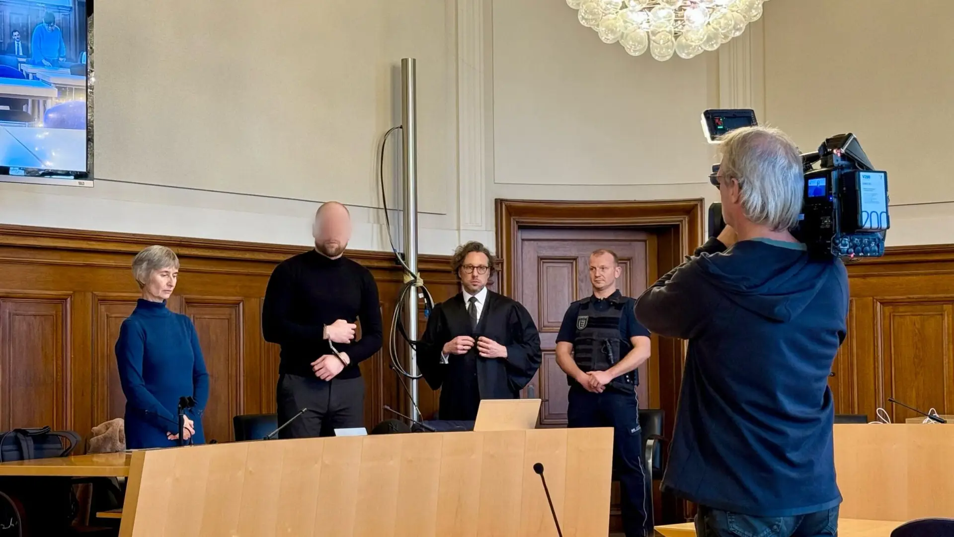 Mit gesenktem Blick, einem Tetra-Pak Wasser in den gefesselten Händen, einem schwarzen Rollkragenpulli und zunächst mit einer falsch herum getragenen schwarzen Baseball-Cap auf dem Kopf, betritt der Mann den Saal. So betritt der gut 1,90 Meter hochgewachsene, breitschultrige und muskulöse Mann den Saal. Er ist ein Deutscher mit russischem Vornamen, stammt aus der Sowjetunion und war zuletzt Bauarbeiter. Die Anklage hat er auch in russischer Sprache vorliegen. Doch er spricht nach Möglichkeit Deutsch, bemüht sich sehr, am Prozess mitzuwirken, will auf- und erklären, ohne auszuweichen, bereut offensichtlich. Nennen wir ihn Andrej B. Die Handfesseln werden ihm zu Prozessbeginn abgenommen. Die Fußfesseln nicht. Rechts und links von ihm setzen sich Justizbeamte. Beobachten ihn aufmerksam.
