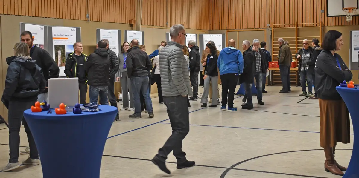 Geschäftiges Treiben in der Zepfenhaner Halle: Die Energie-Konzerne EnBW und RWE informierten im „Bürgerdialog“ über die geplanten Windparks…