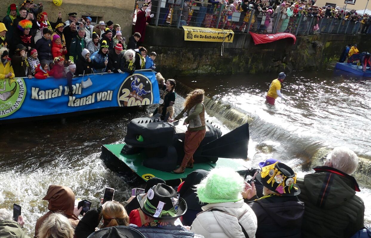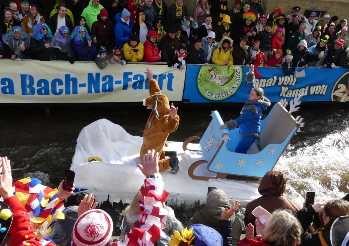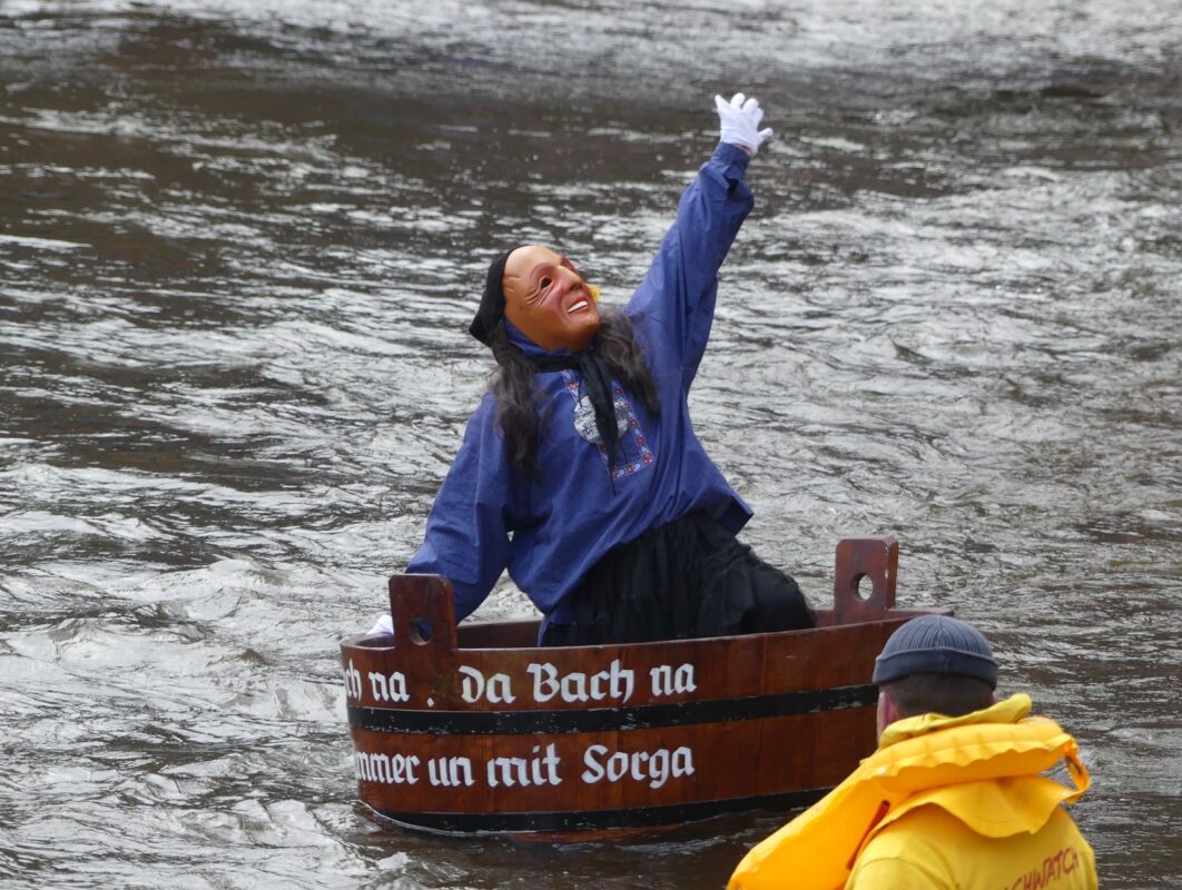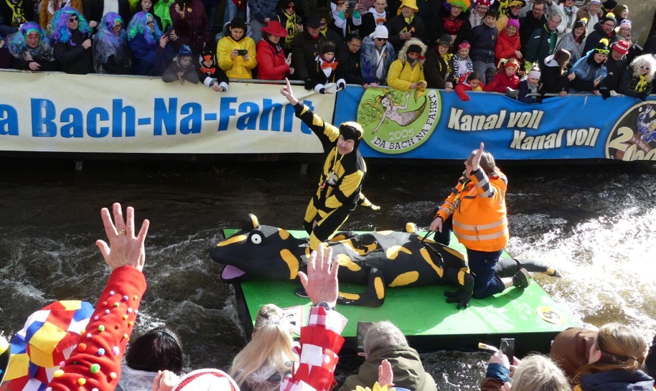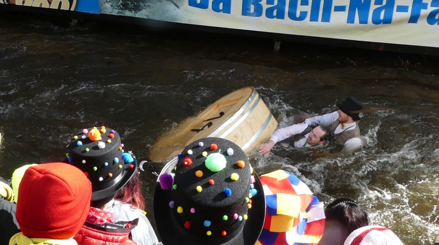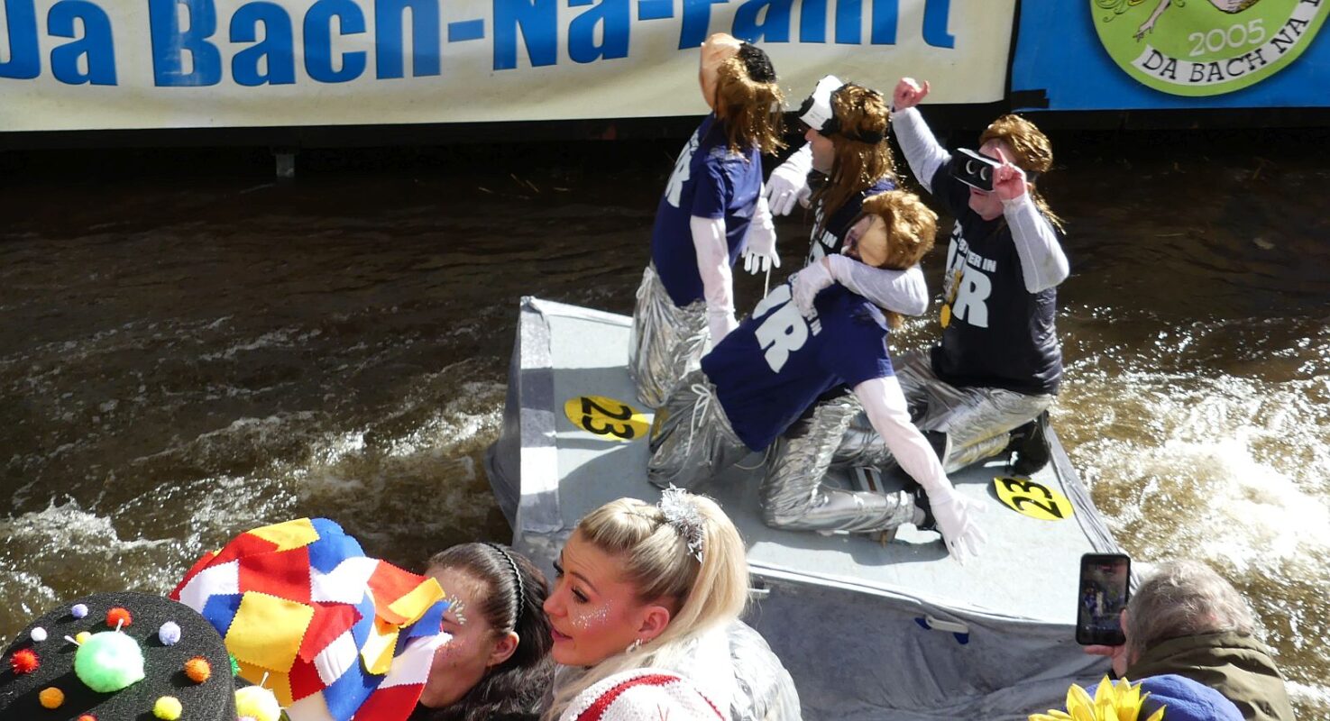 Vor dem eigentlichen Ereignis findet der Zuberumzug statt. Da sind die Zuber alle noch heil. In diesem Jahr gab es auch eine Reihe historischer Zuber, um an die 90-jährige Geschichte der Da-Bach-na-Fahrt zu erinnern.