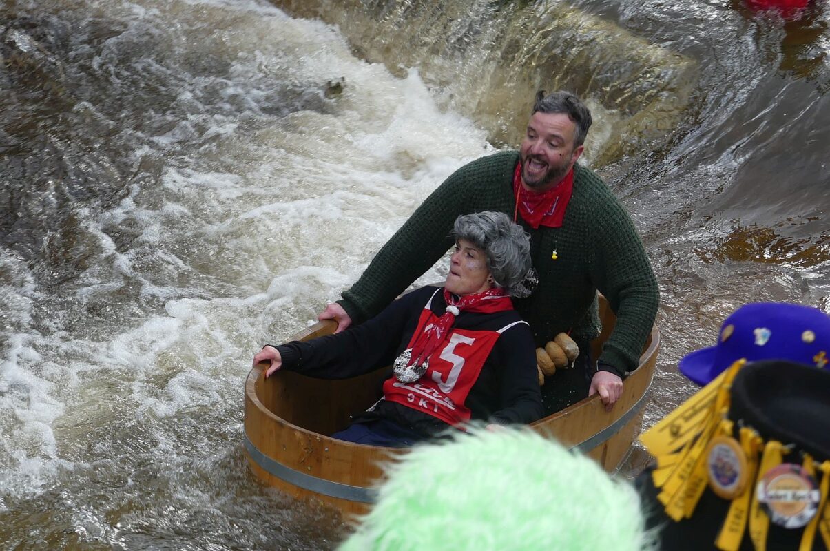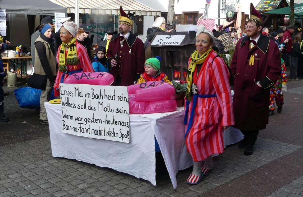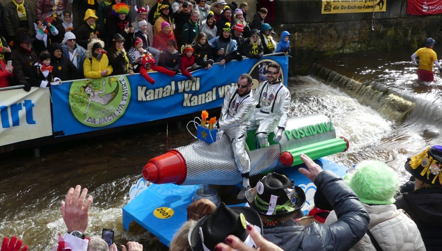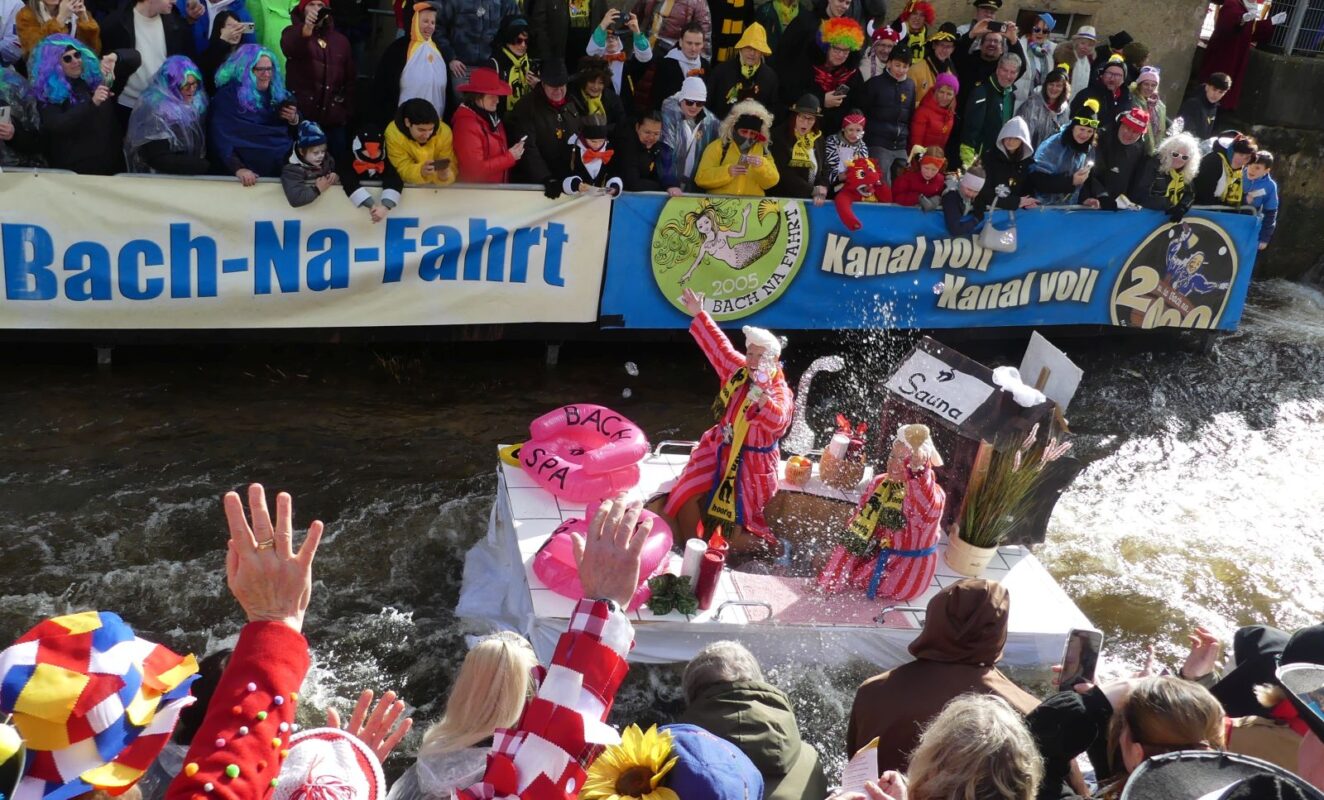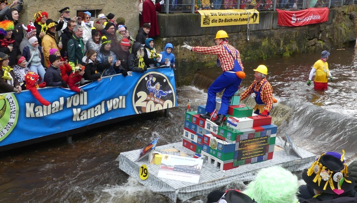 Vor dem eigentlichen Ereignis findet der Zuberumzug statt. Da sind die Zuber alle noch heil. In diesem Jahr gab es auch eine Reihe historischer Zuber, um an die 90-jährige Geschichte der Da-Bach-na-Fahrt zu erinnern.