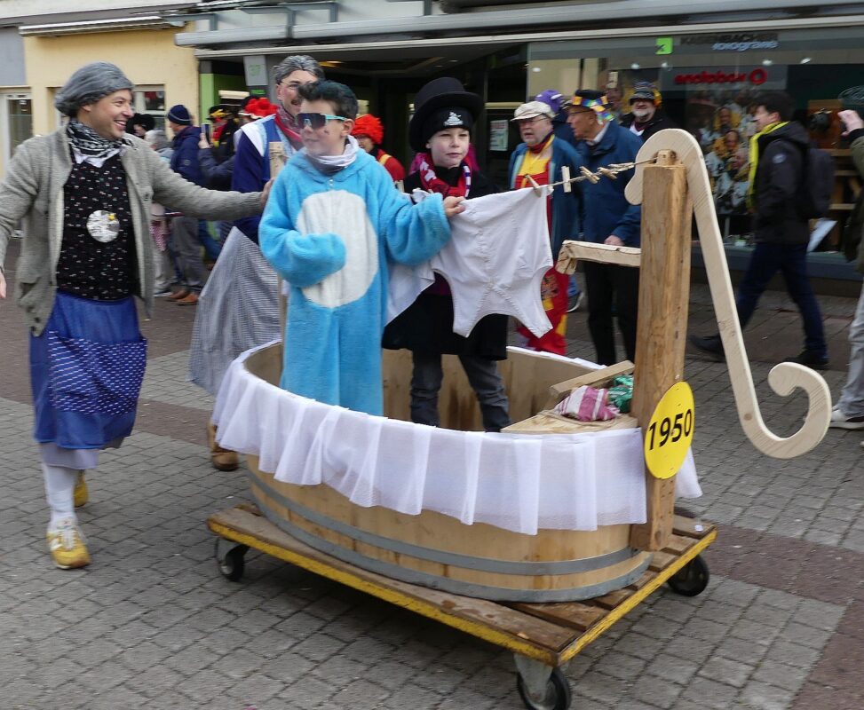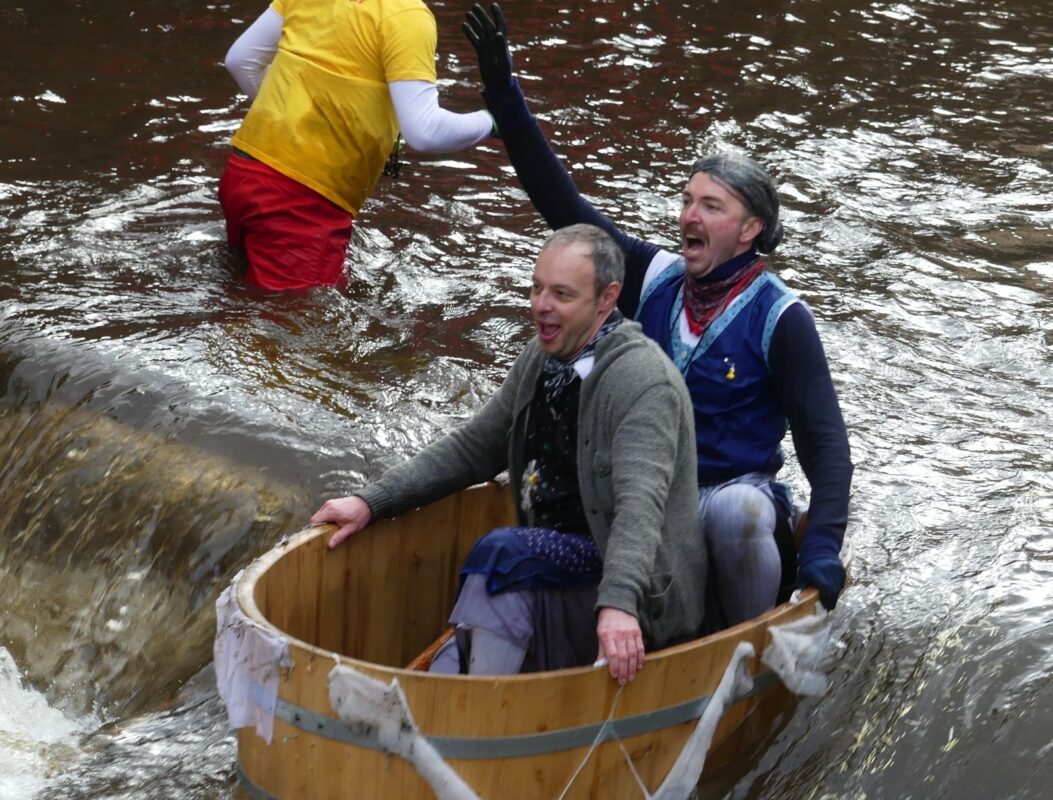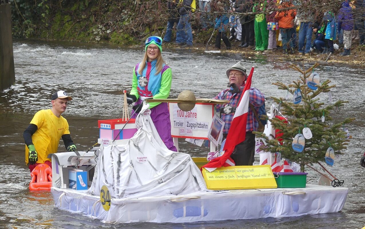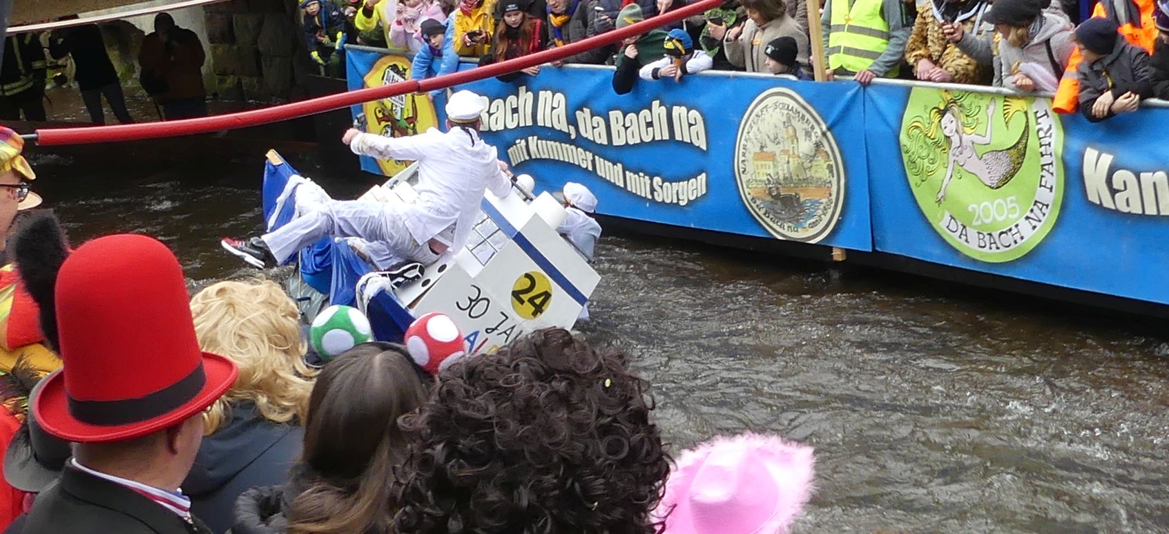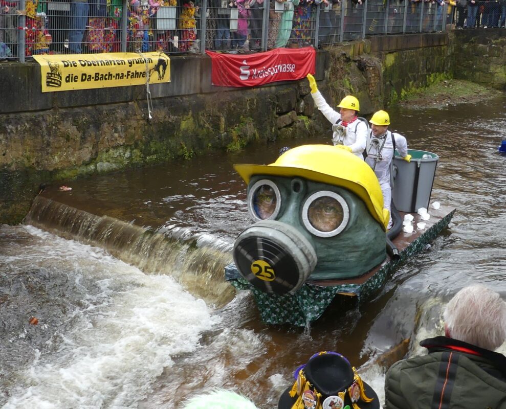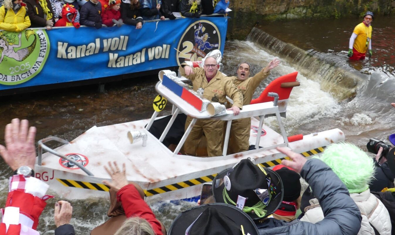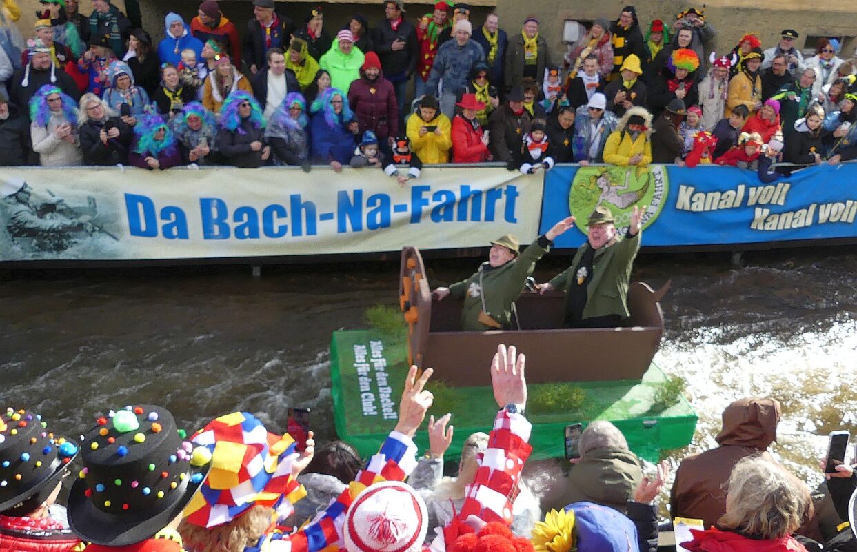 Vor dem eigentlichen Ereignis findet der Zuberumzug statt. Da sind die Zuber alle noch heil. In diesem Jahr gab es auch eine Reihe historischer Zuber, um an die 90-jährige Geschichte der Da-Bach-na-Fahrt zu erinnern.