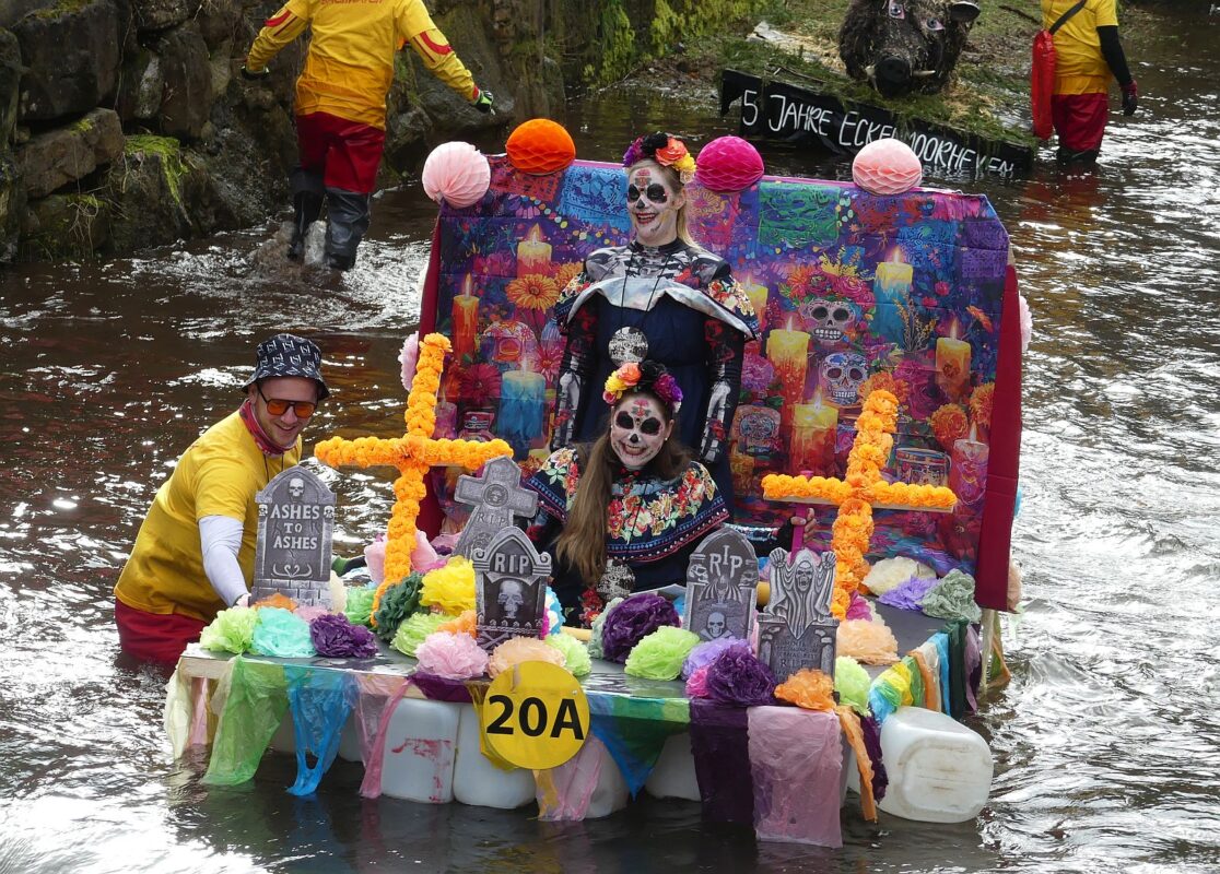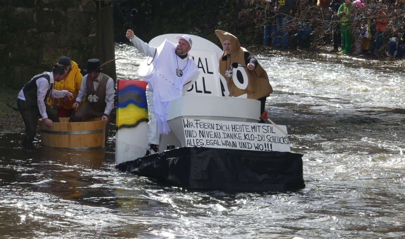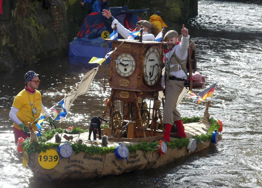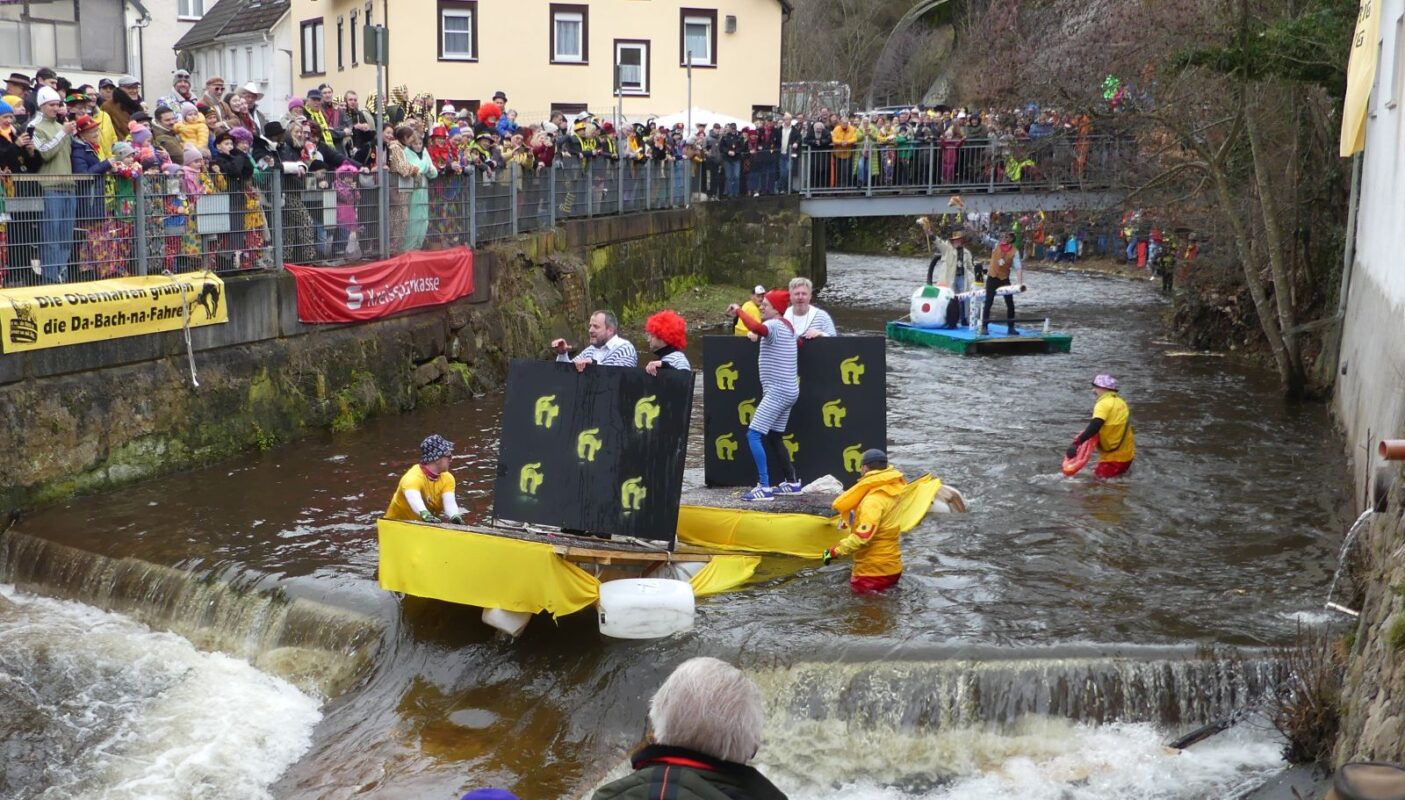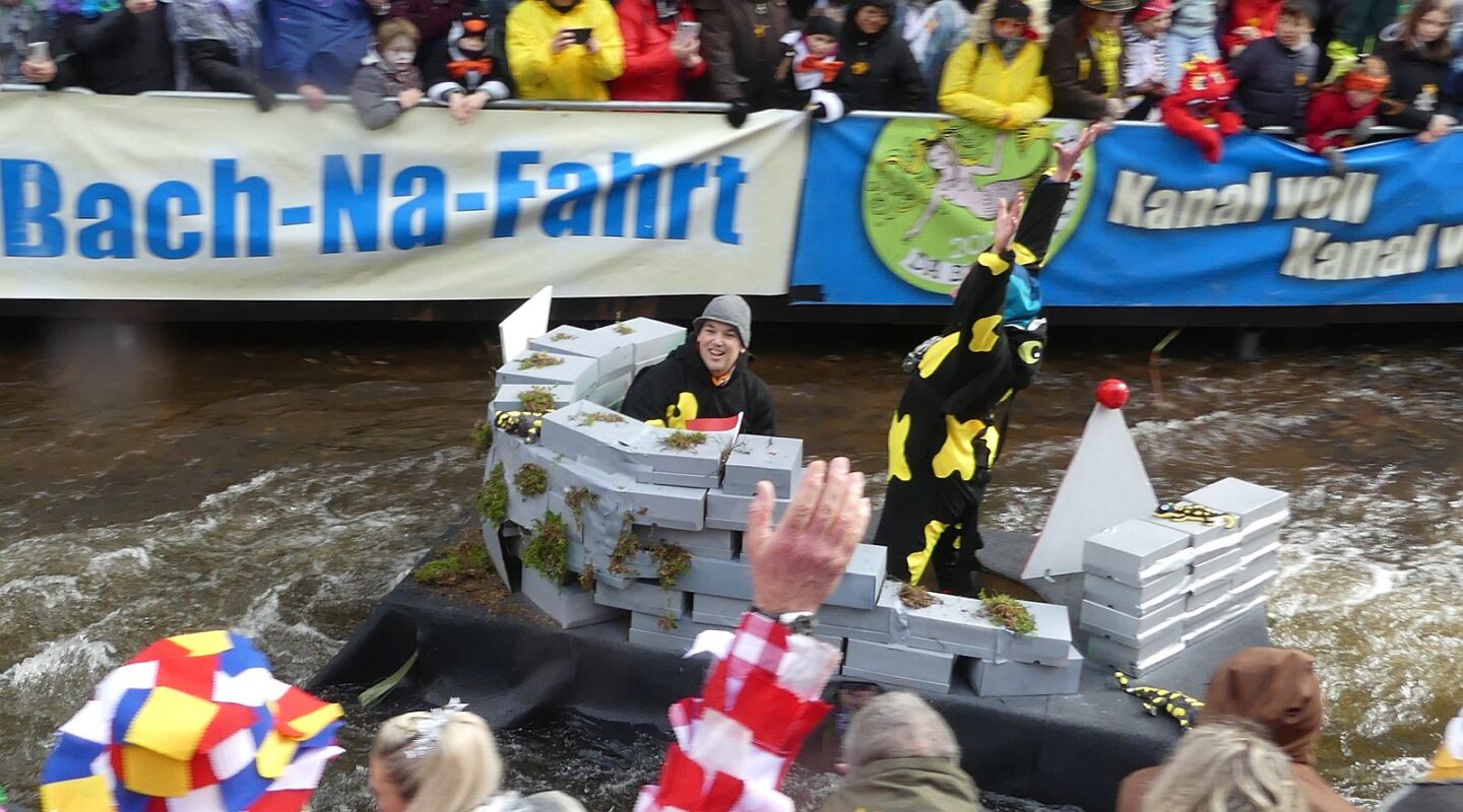 Vor dem eigentlichen Ereignis findet der Zuberumzug statt. Da sind die Zuber alle noch heil. In diesem Jahr gab es auch eine Reihe historischer Zuber, um an die 90-jährige Geschichte der Da-Bach-na-Fahrt zu erinnern.