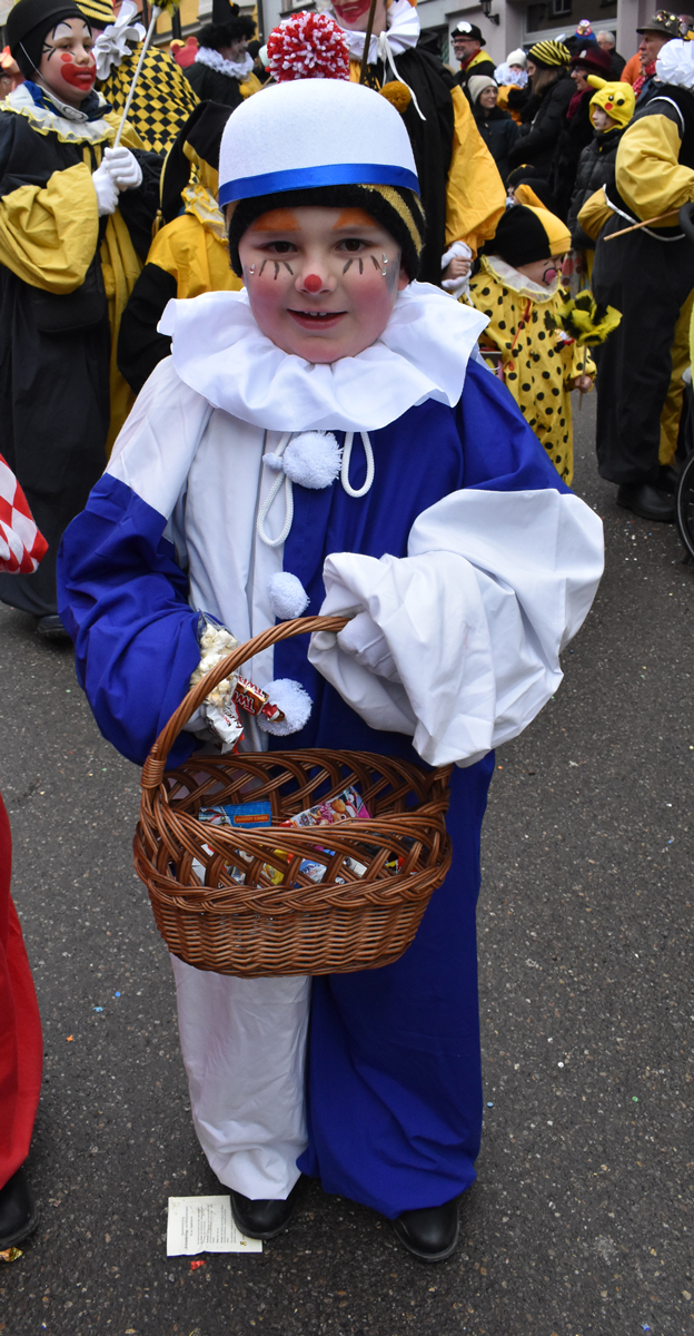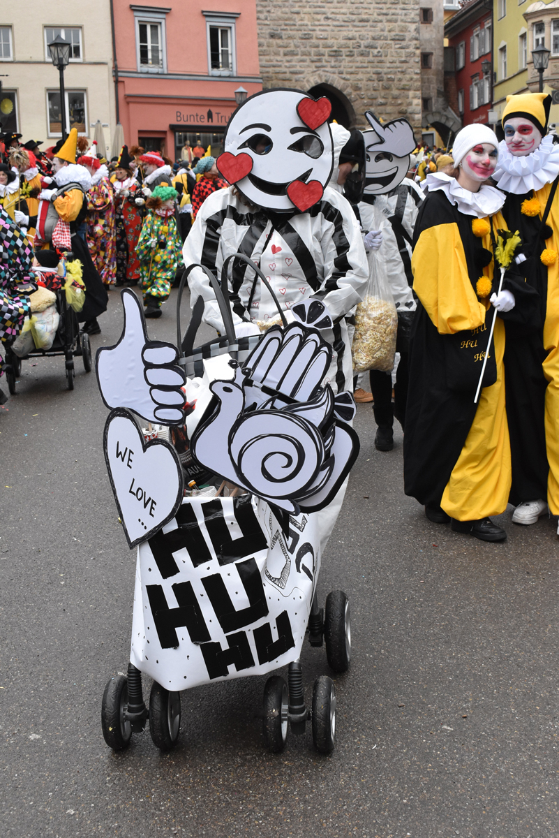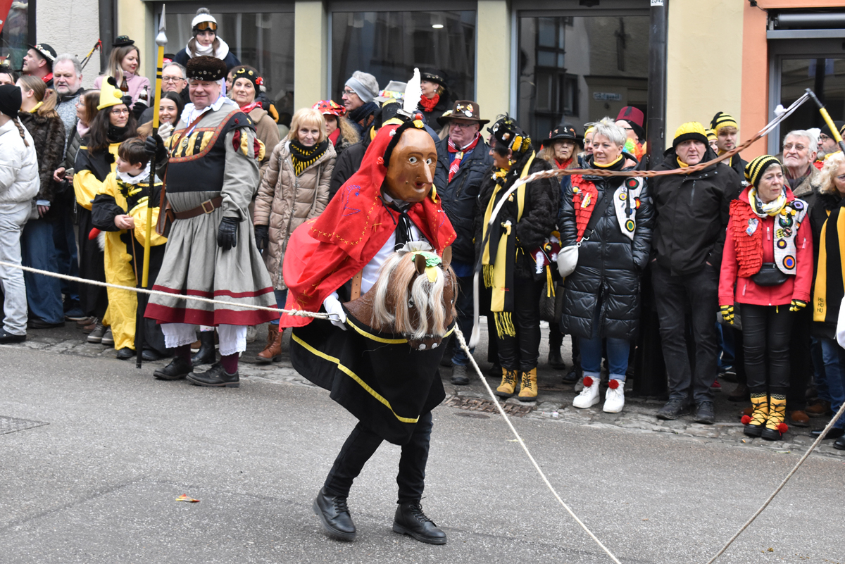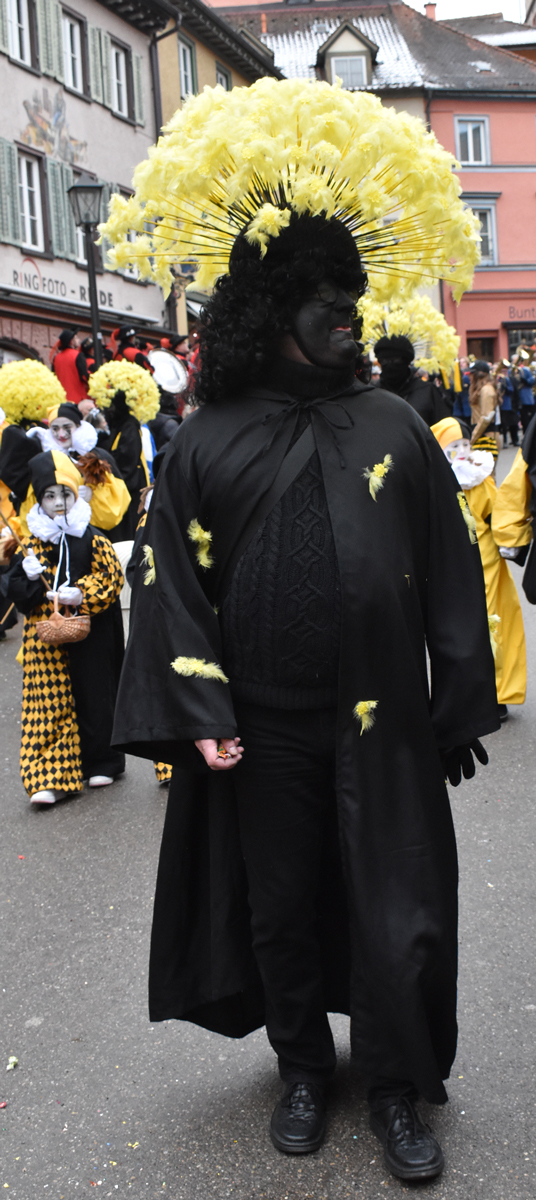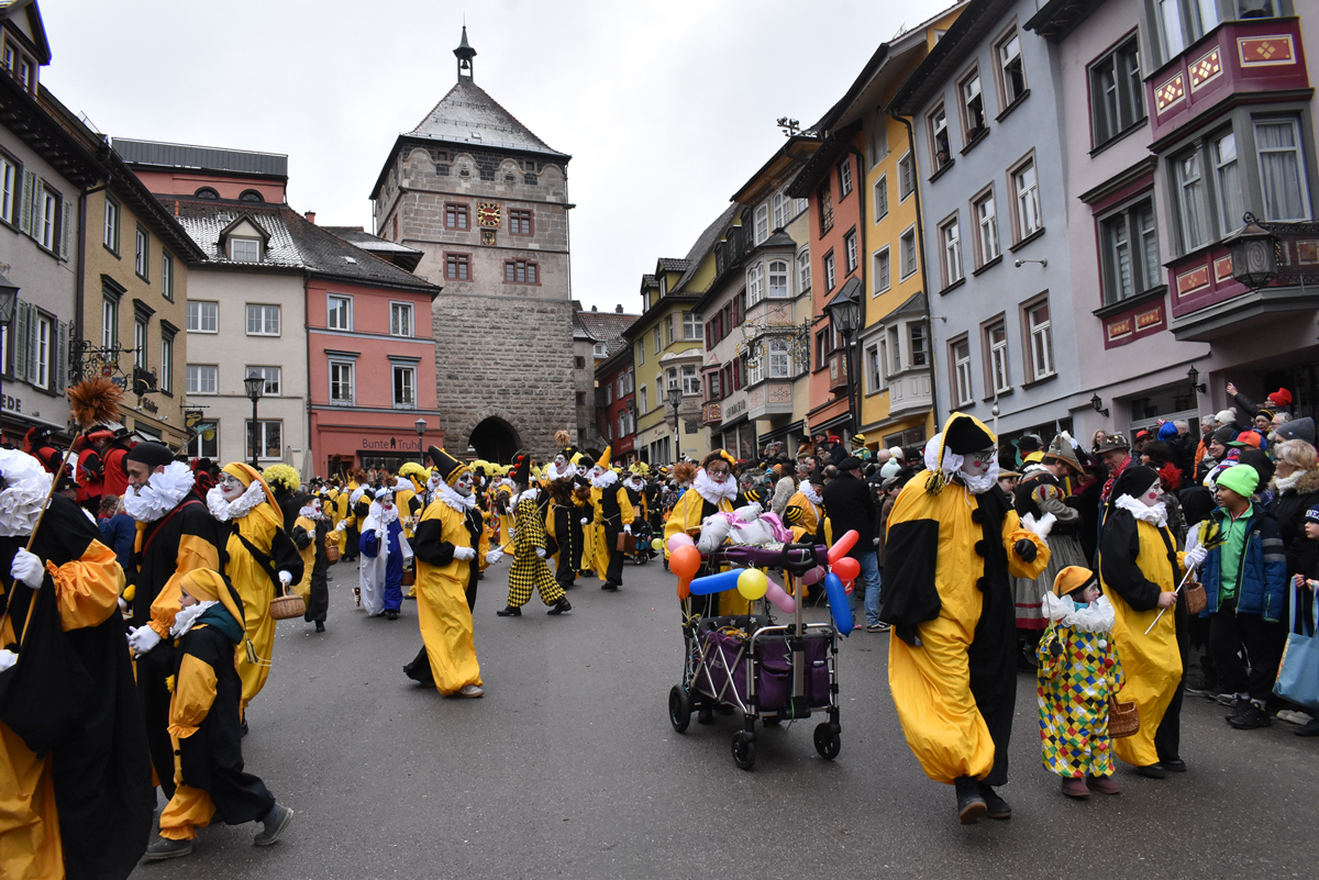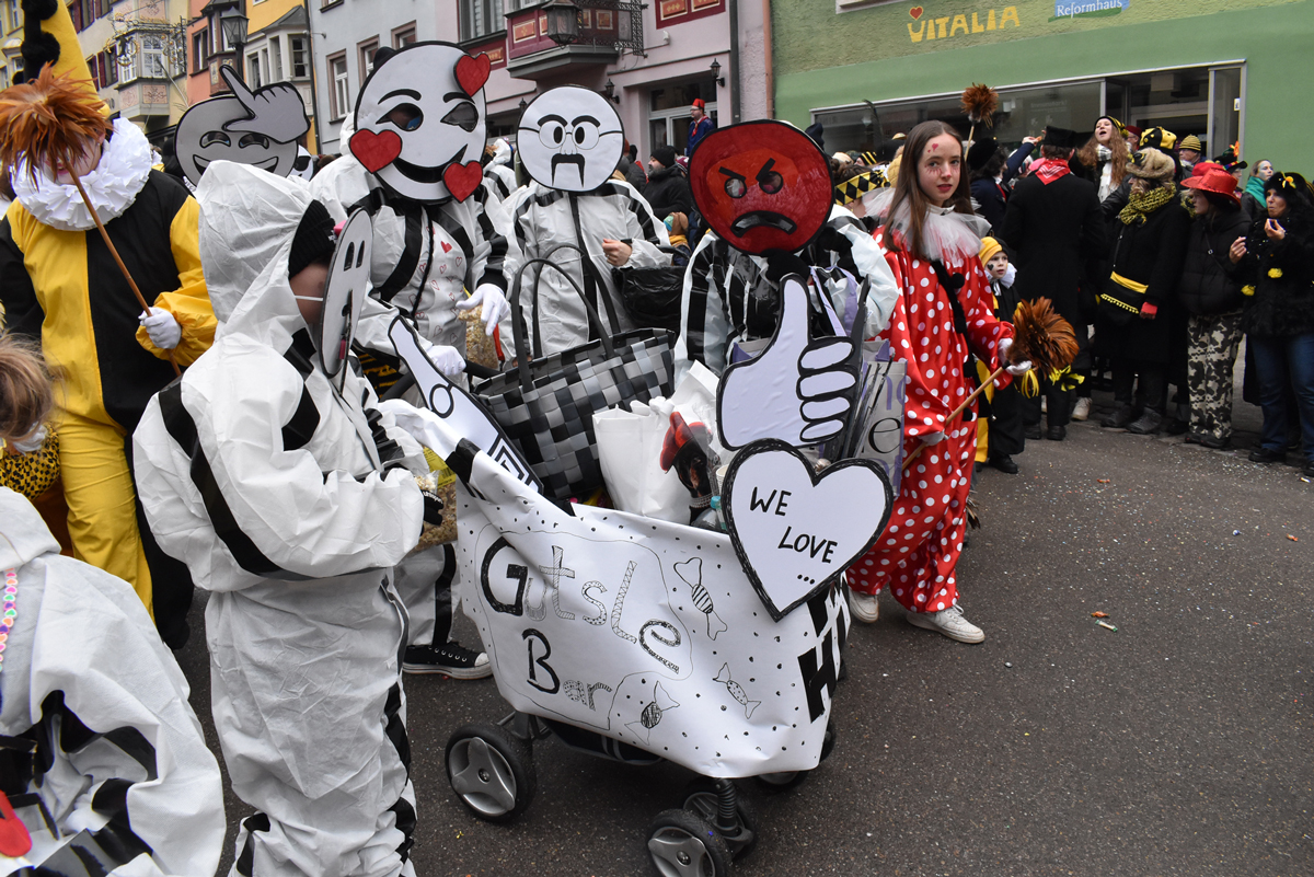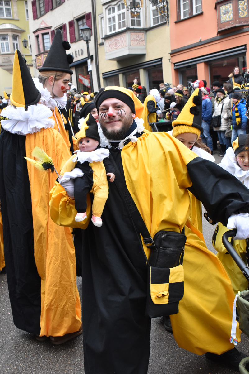 Bajasse, viele Bajasse vor allem. Meist in den „neuen“ Stadtfarben Schwarz-Gelb. Mit Strahlen um Gesicht, wenn schon die Sonnenstrahlen ausblieben. Aber es gab auch Familien und Gruppen, die mit originellen Ideen und viel Fleiß Eigenes erschaffen hatten. Gut besucht war der Umzug allemal. Und nein: Der Name ist zwar offiziell Kinderumzug („mit dem Narrensamen und verschiedener verkleideten Gruppen“, schreibt die Narrenzunft als Veranstalter). Es waren auch zahlreiche Nachwuchs-Narren zu sehen, einschließlich der Kinderrössle. Aber natürlich waren Jugendliche und Erwachsene voll dabei. Wie immer.
