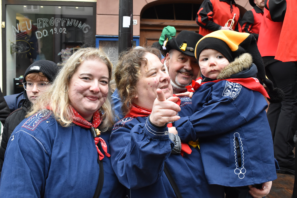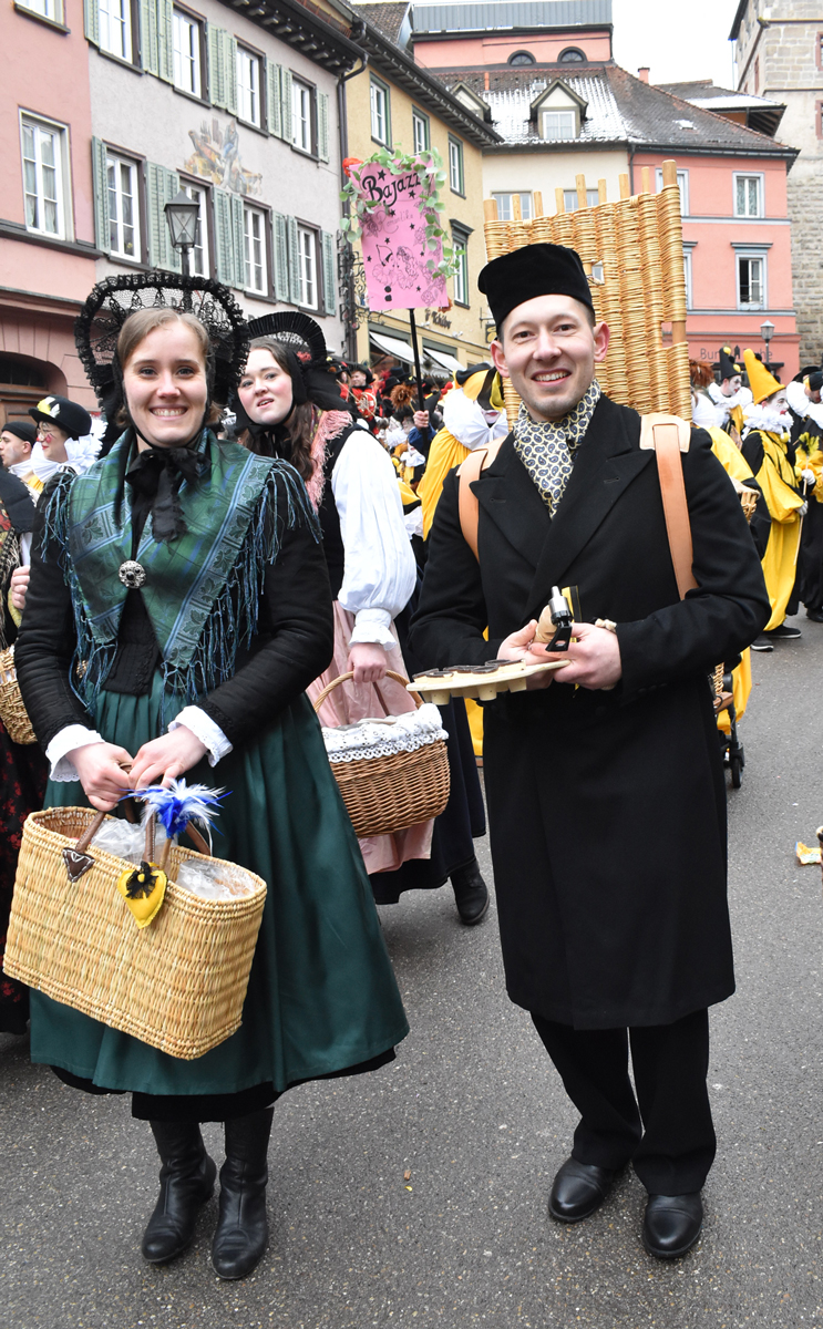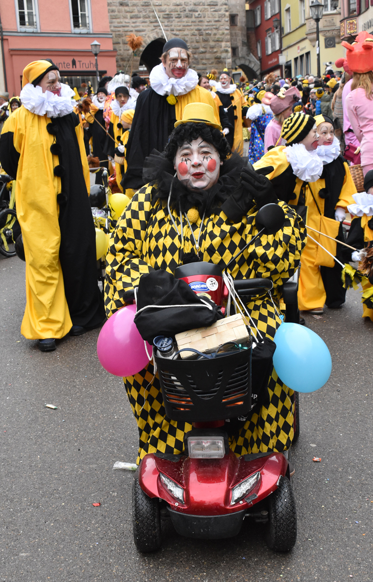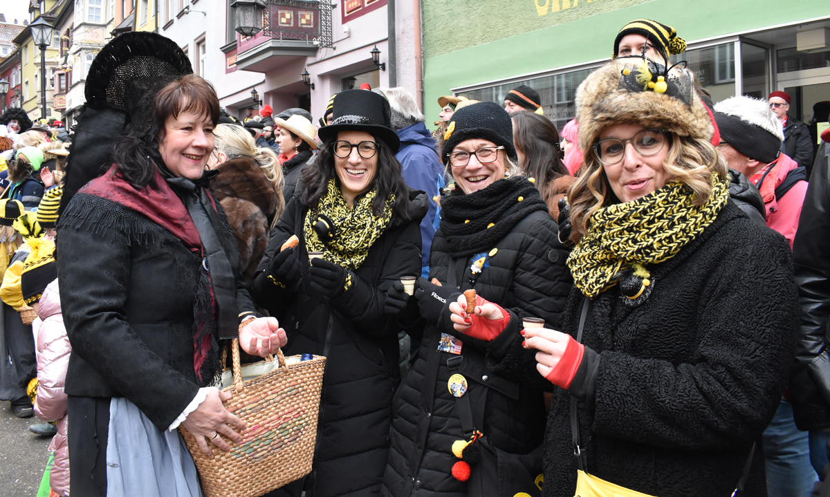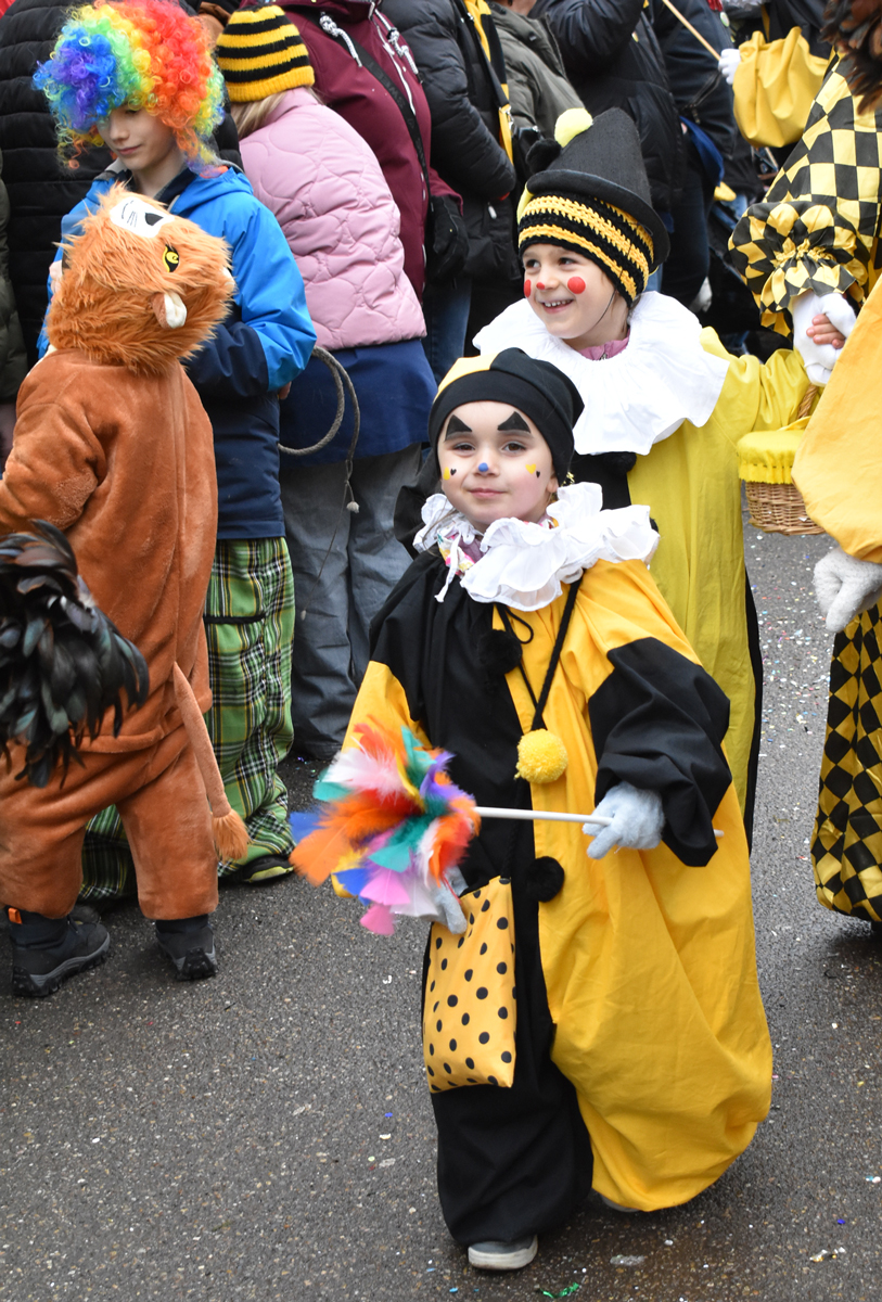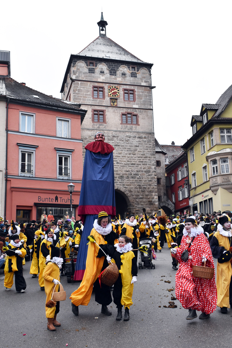 Bajasse, viele Bajasse vor allem. Meist in den „neuen“ Stadtfarben Schwarz-Gelb. Mit Strahlen um Gesicht, wenn schon die Sonnenstrahlen ausblieben. Aber es gab auch Familien und Gruppen, die mit originellen Ideen und viel Fleiß Eigenes erschaffen hatten. Gut besucht war der Umzug allemal. Und nein: Der Name ist zwar offiziell Kinderumzug („mit dem Narrensamen und verschiedener verkleideten Gruppen“, schreibt die Narrenzunft als Veranstalter). Es waren auch zahlreiche Nachwuchs-Narren zu sehen, einschließlich der Kinderrössle. Aber natürlich waren Jugendliche und Erwachsene voll dabei. Wie immer.