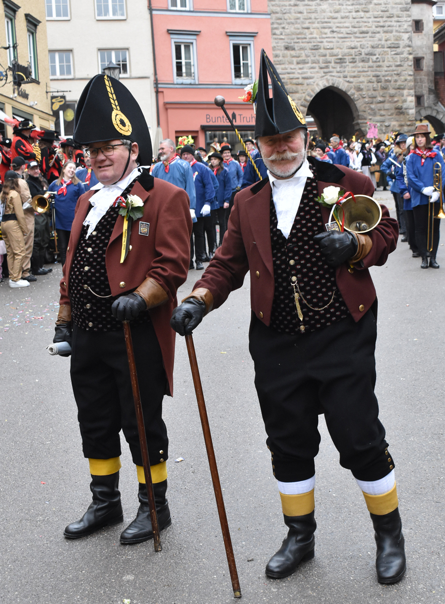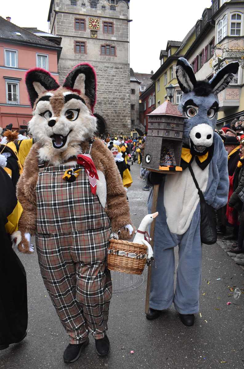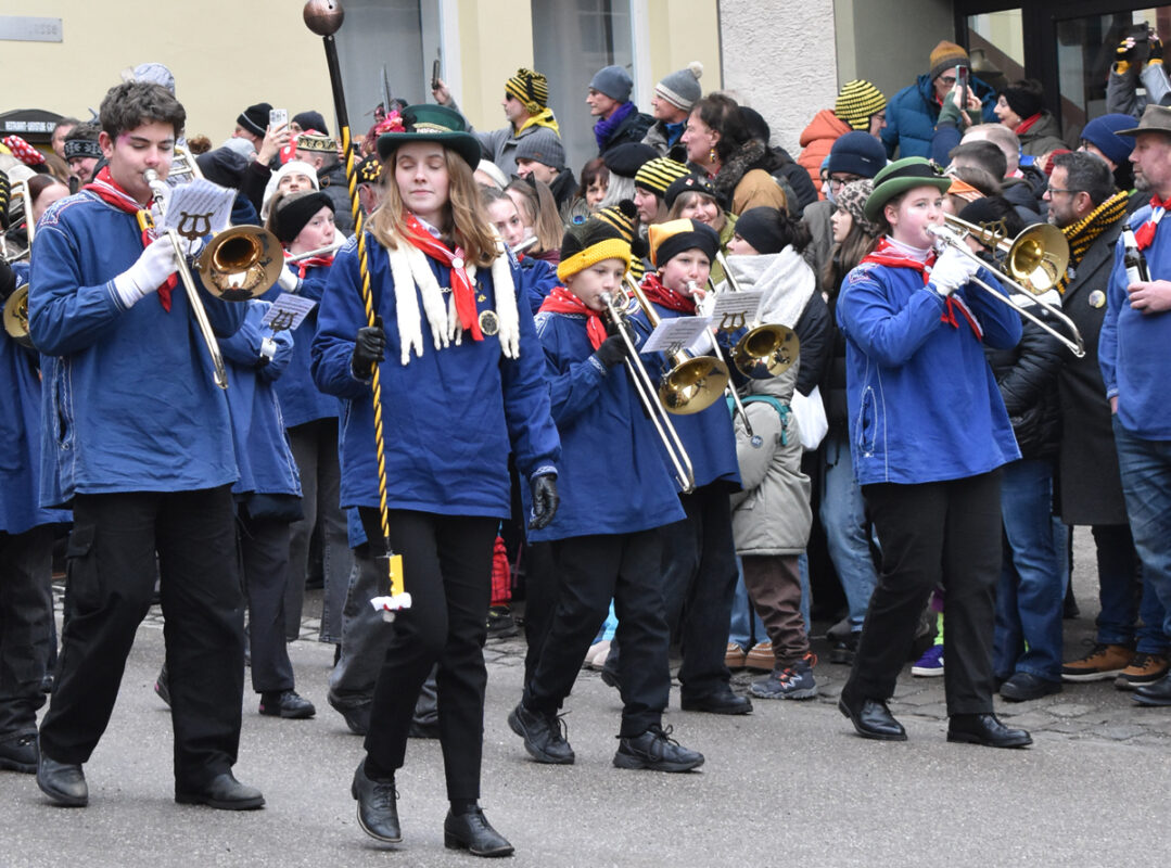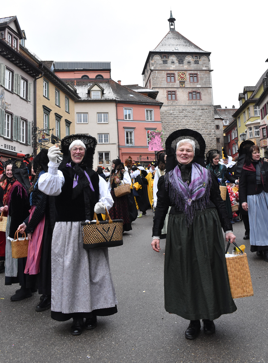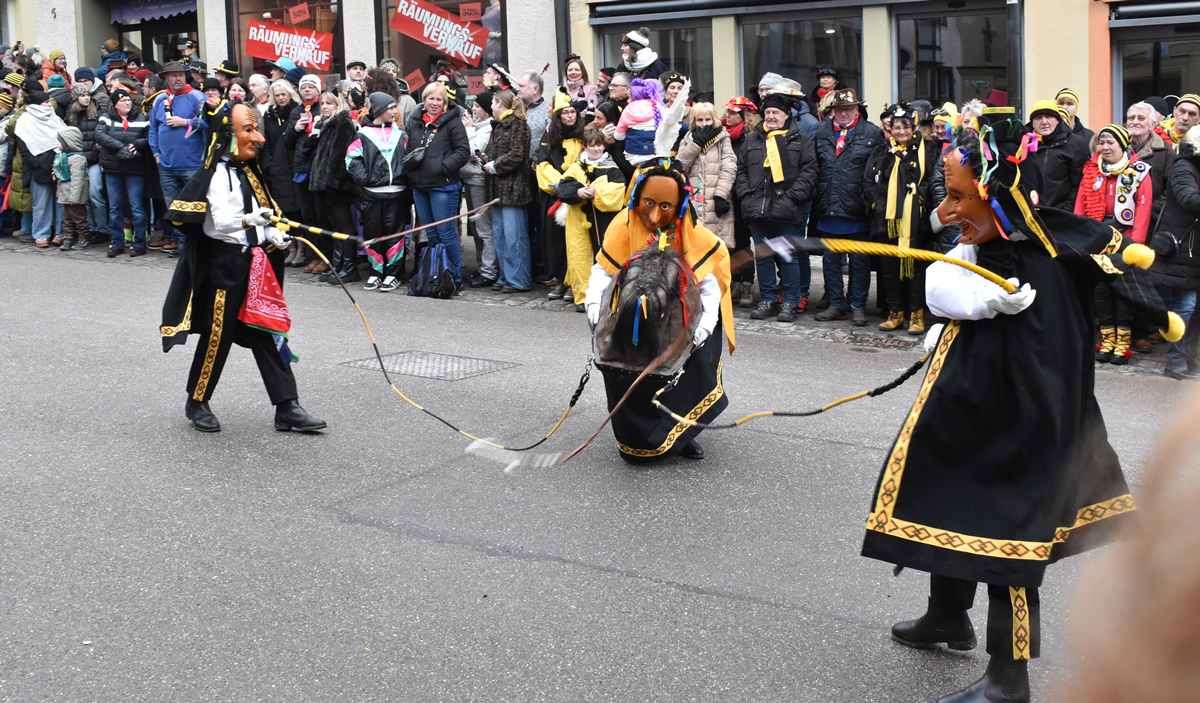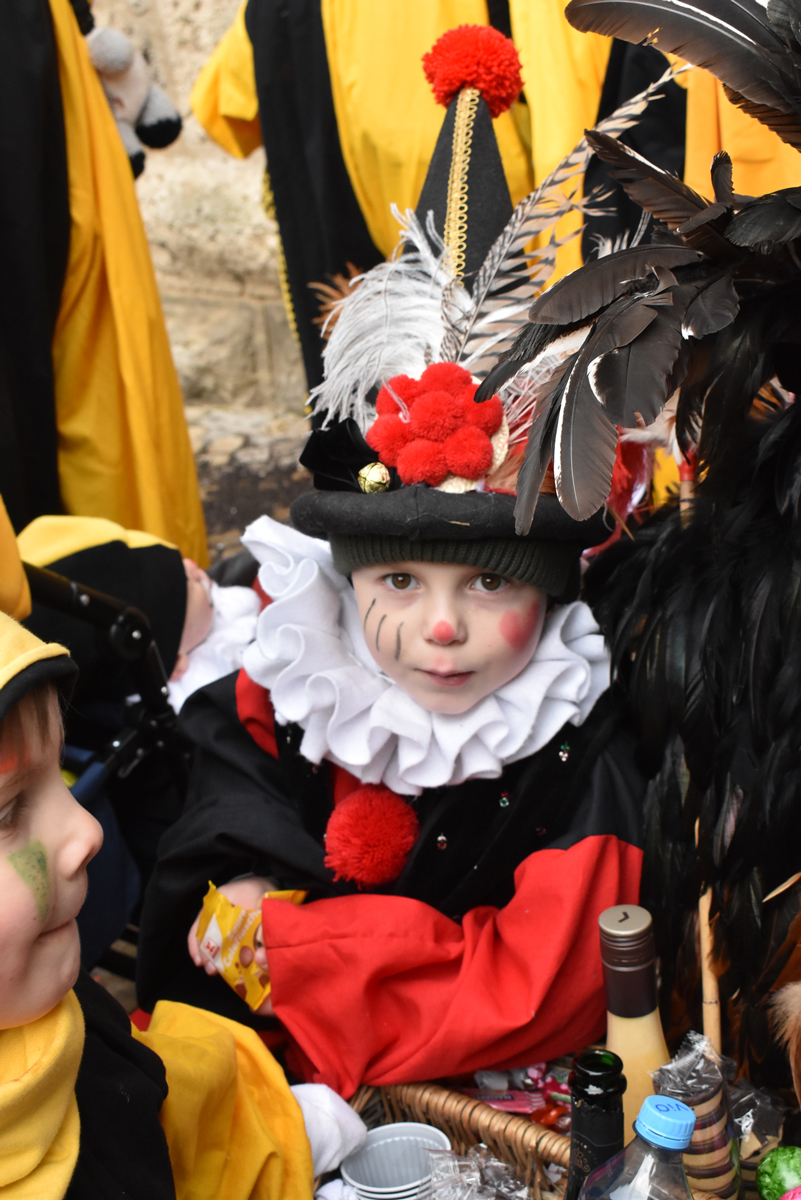Bajasse, viele Bajasse vor allem. Meist in den „neuen“ Stadtfarben Schwarz-Gelb. Mit Strahlen um Gesicht, wenn schon die Sonnenstrahlen ausblieben. Aber es gab auch Familien und Gruppen, die mit originellen Ideen und viel Fleiß Eigenes erschaffen hatten. Gut besucht war der Umzug allemal. Und nein: Der Name ist zwar offiziell Kinderumzug („mit dem Narrensamen und verschiedener verkleideten Gruppen“, schreibt die Narrenzunft als Veranstalter). Es waren auch zahlreiche Nachwuchs-Narren zu sehen, einschließlich der Kinderrössle. Aber natürlich waren Jugendliche und Erwachsene voll dabei. Wie immer.