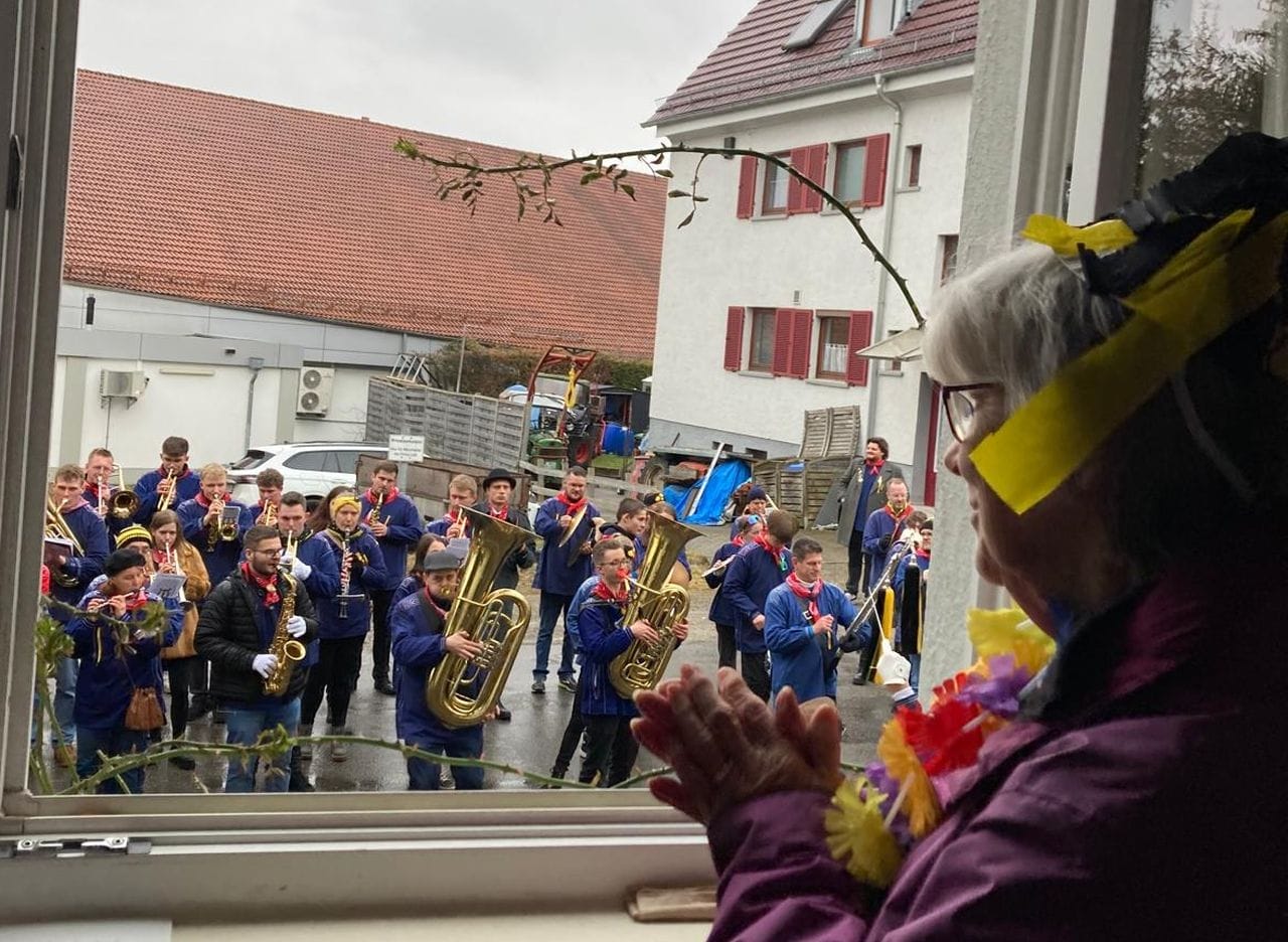 Am Schmotzigen Donnerstag versammelten sich rund 100 Musiker vor der Schützenstraße 12, um die Gäste der Tagespflege für Senioren Mary Kampman mit mitreißenden traditionellen Fasnetslieder zu verwöhnen. Unter dem strahlenden Himmel der Fasnetszeit erfüllten fröhliche Klänge die Luft und zauberten ein Lächeln in die Gesichter aller Zuhörer.