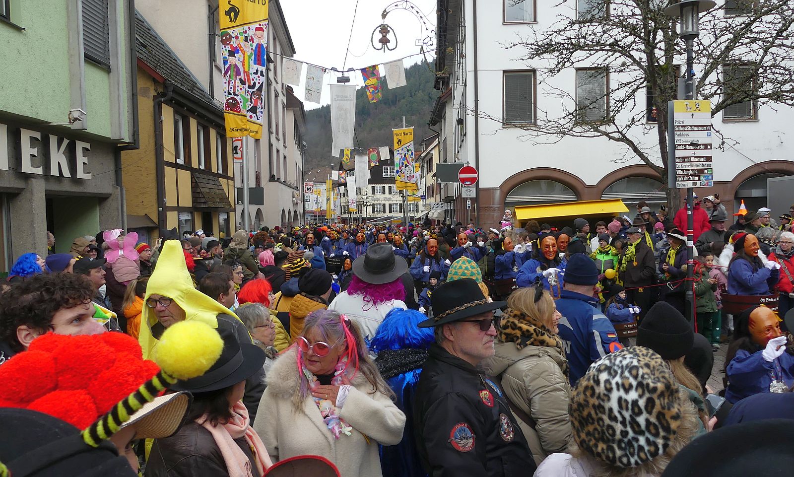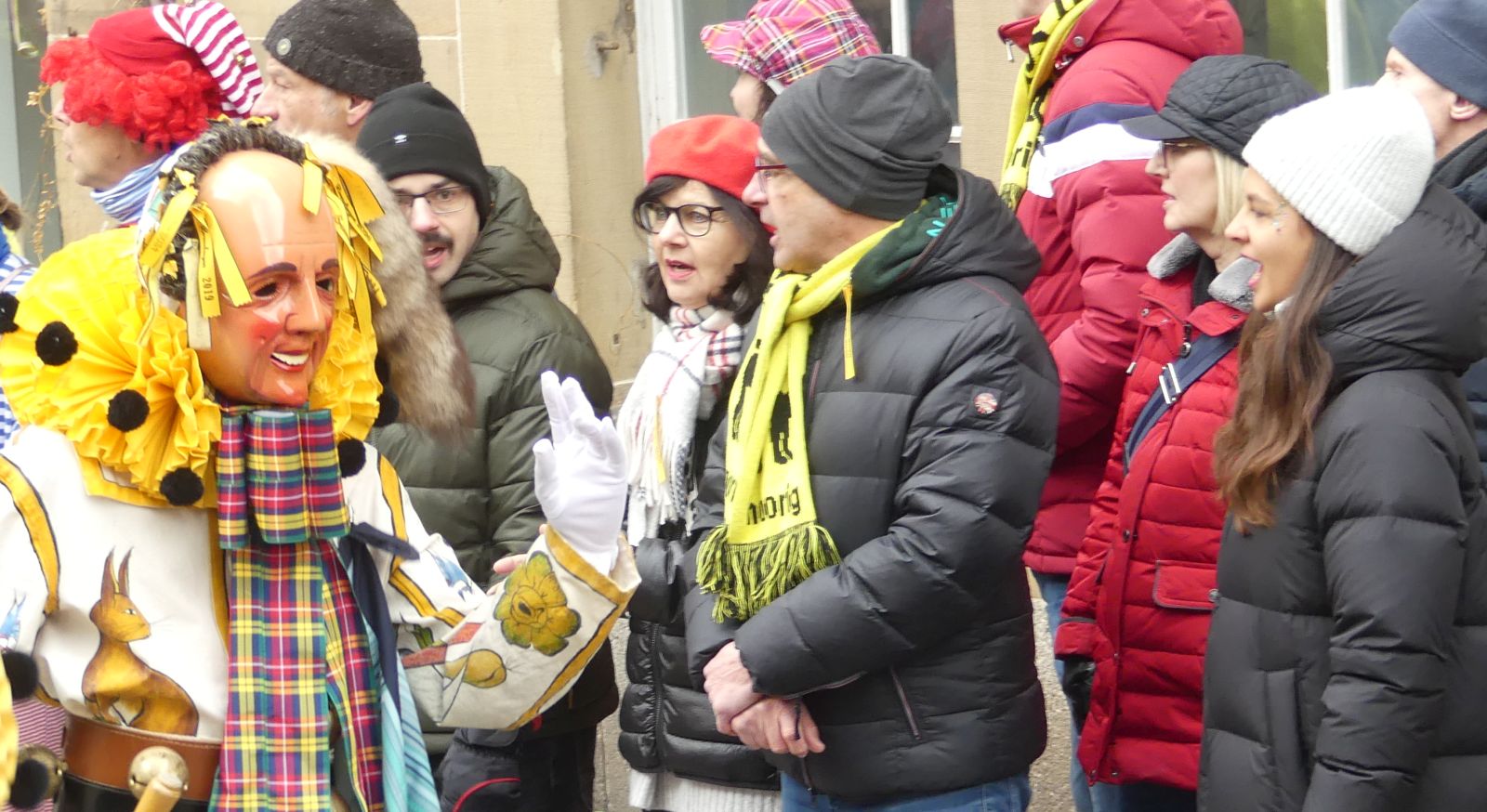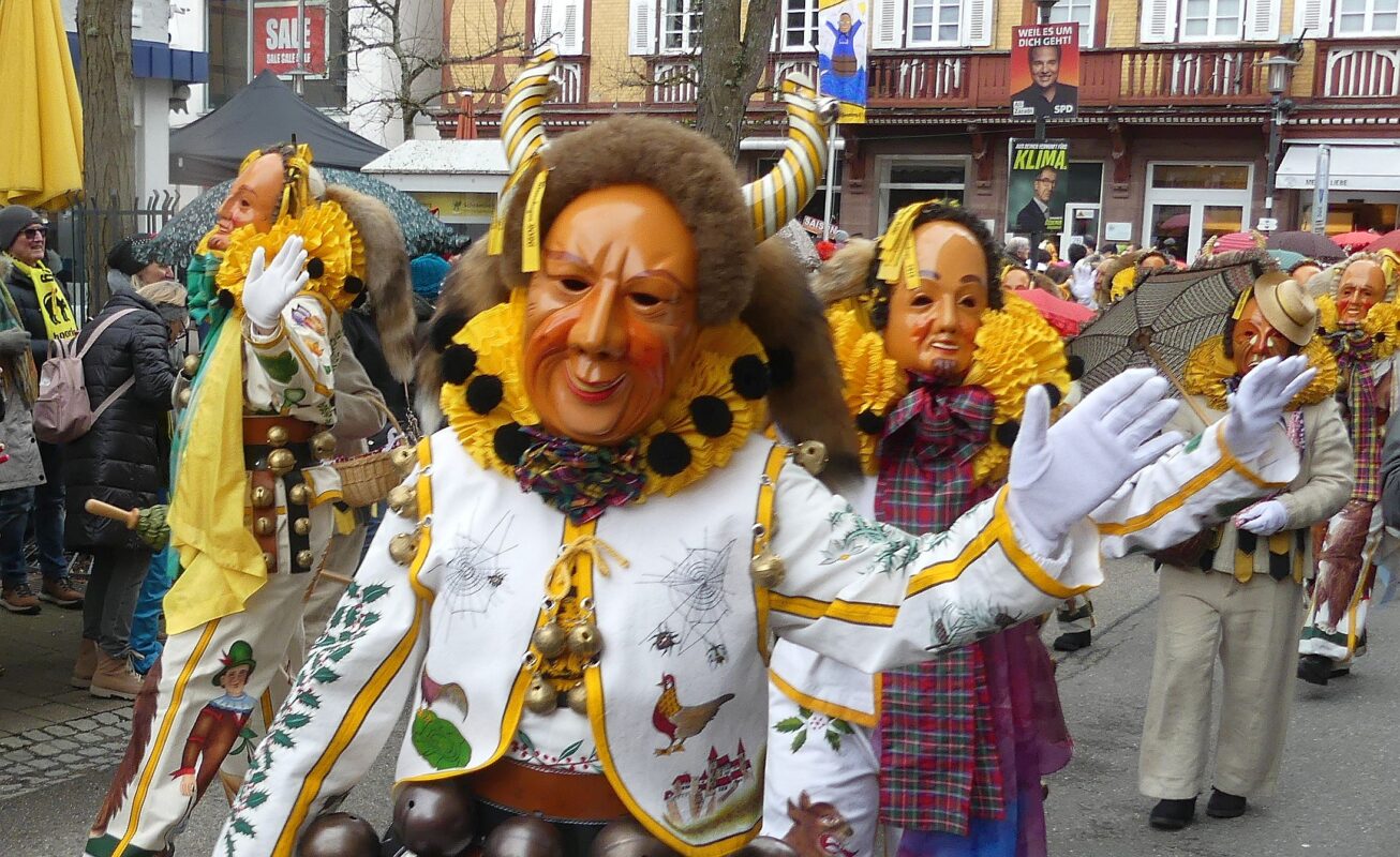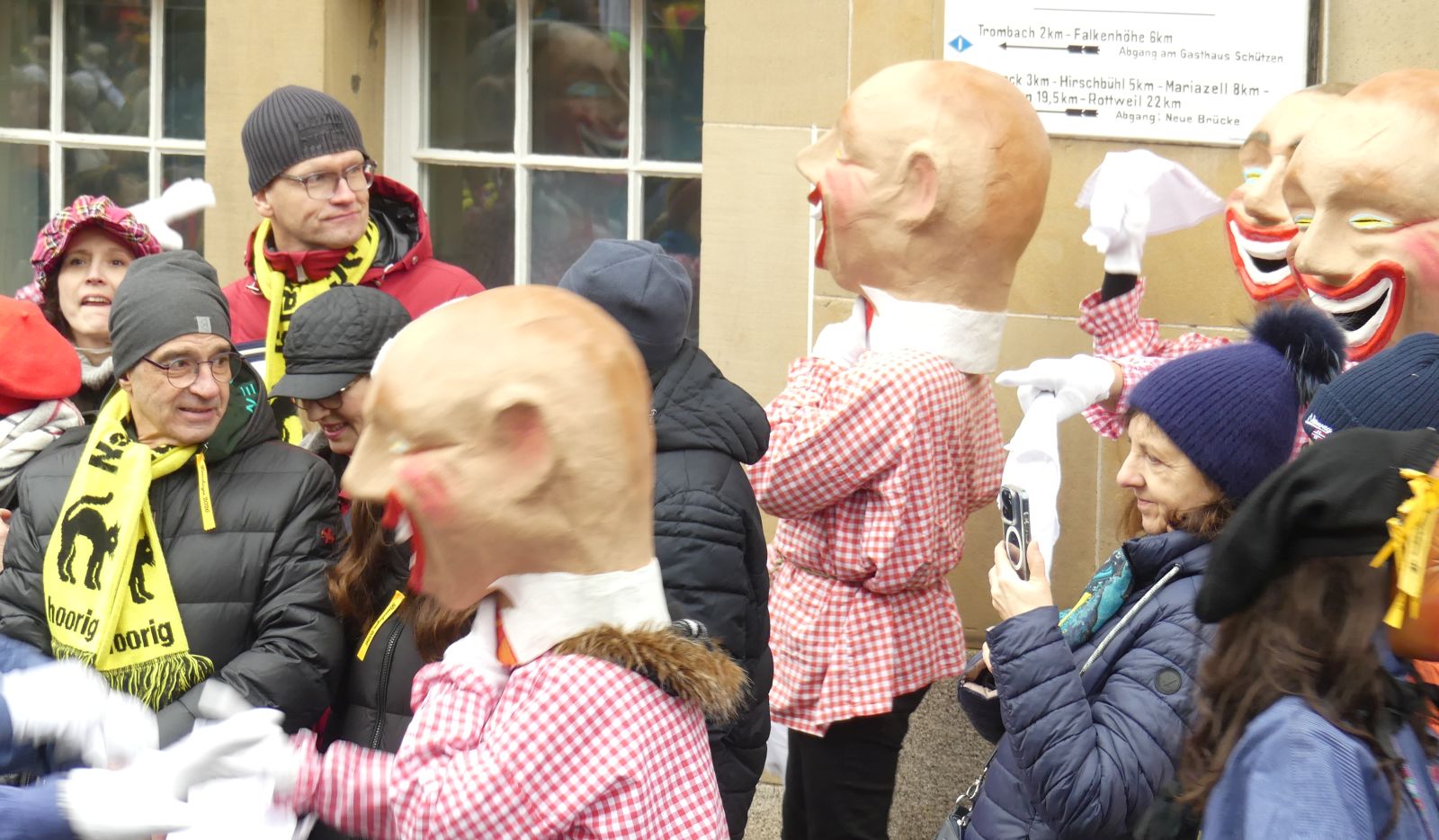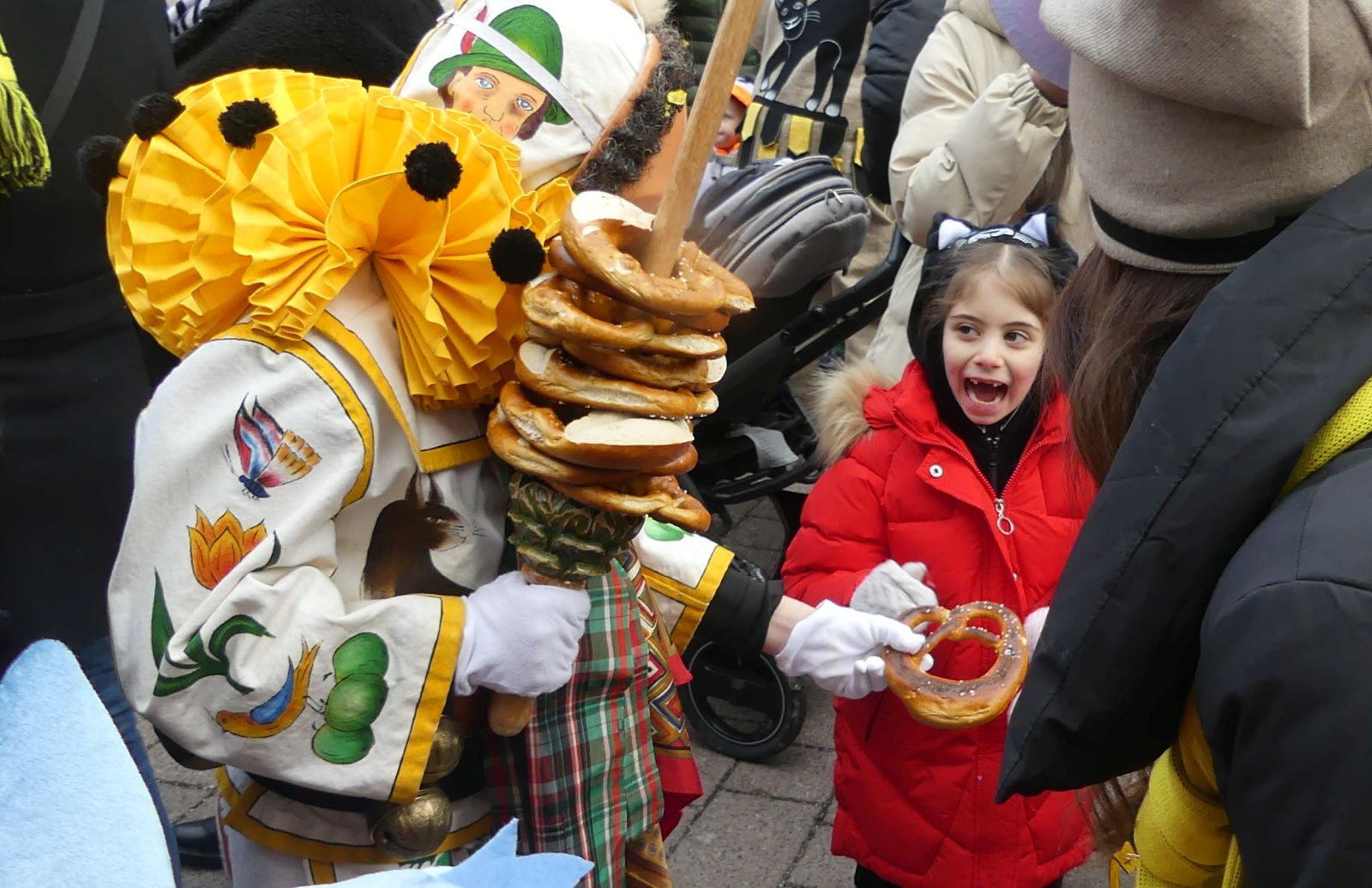 Im Rathaus füllten die Narren im Rathaus ihre Brezelstengel, Täschle und Zuber. Dann ging es hinaus zum wie immer auf die Straßen mit den bunt kostümierten Zuschauerinnen und Zuschauern, die sangen, sprangen und tanzten, und die Narren um Brezeln, Würstle und Schoklädle anbettelte: „Hoorig, hoorig isch dia Katz…“ Das erhörte sogar die Sonne und blinzelte zwischen den Wolken durch.