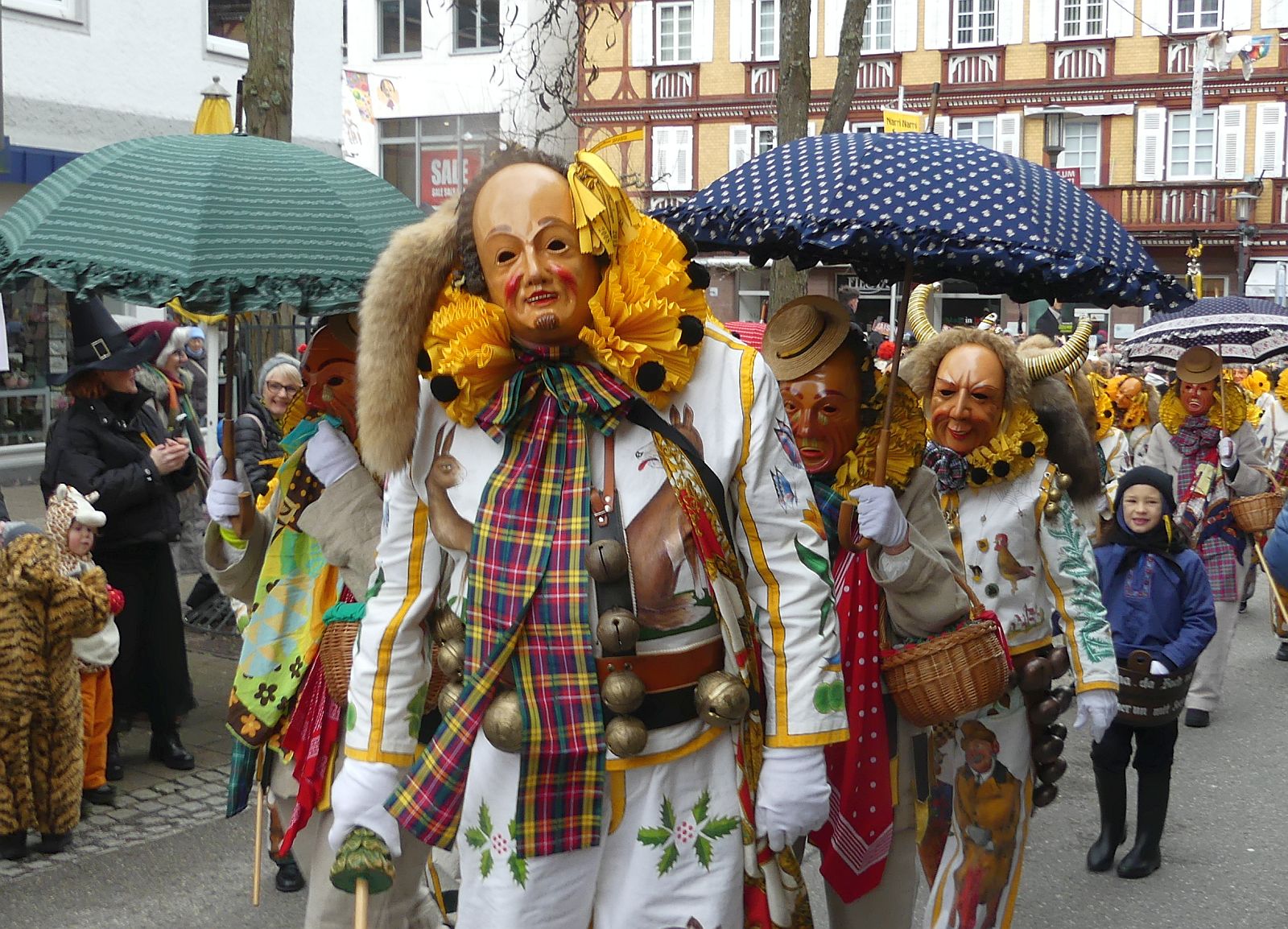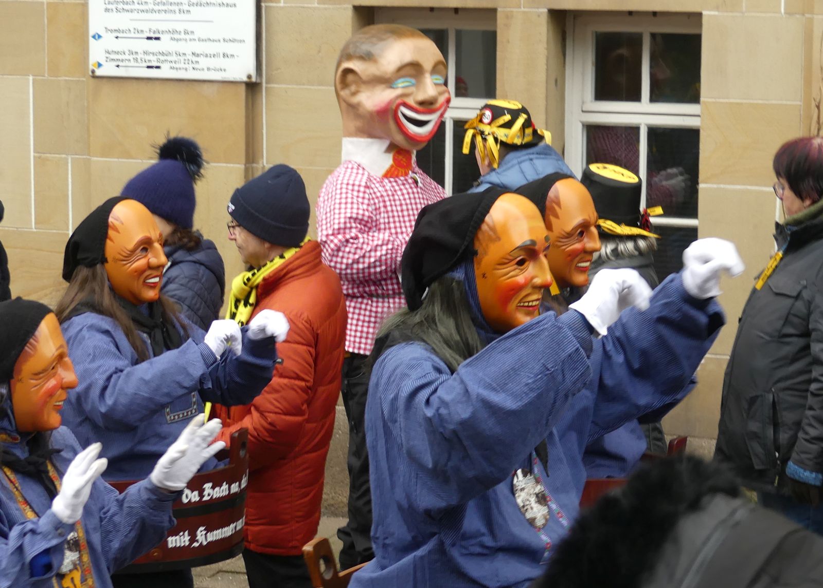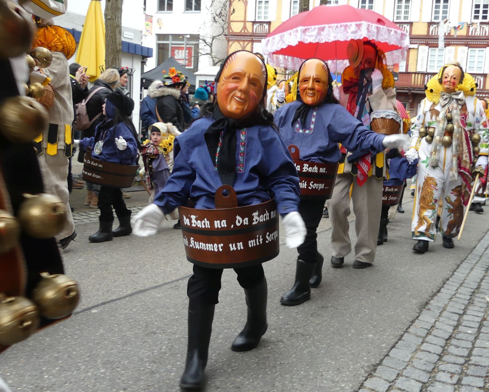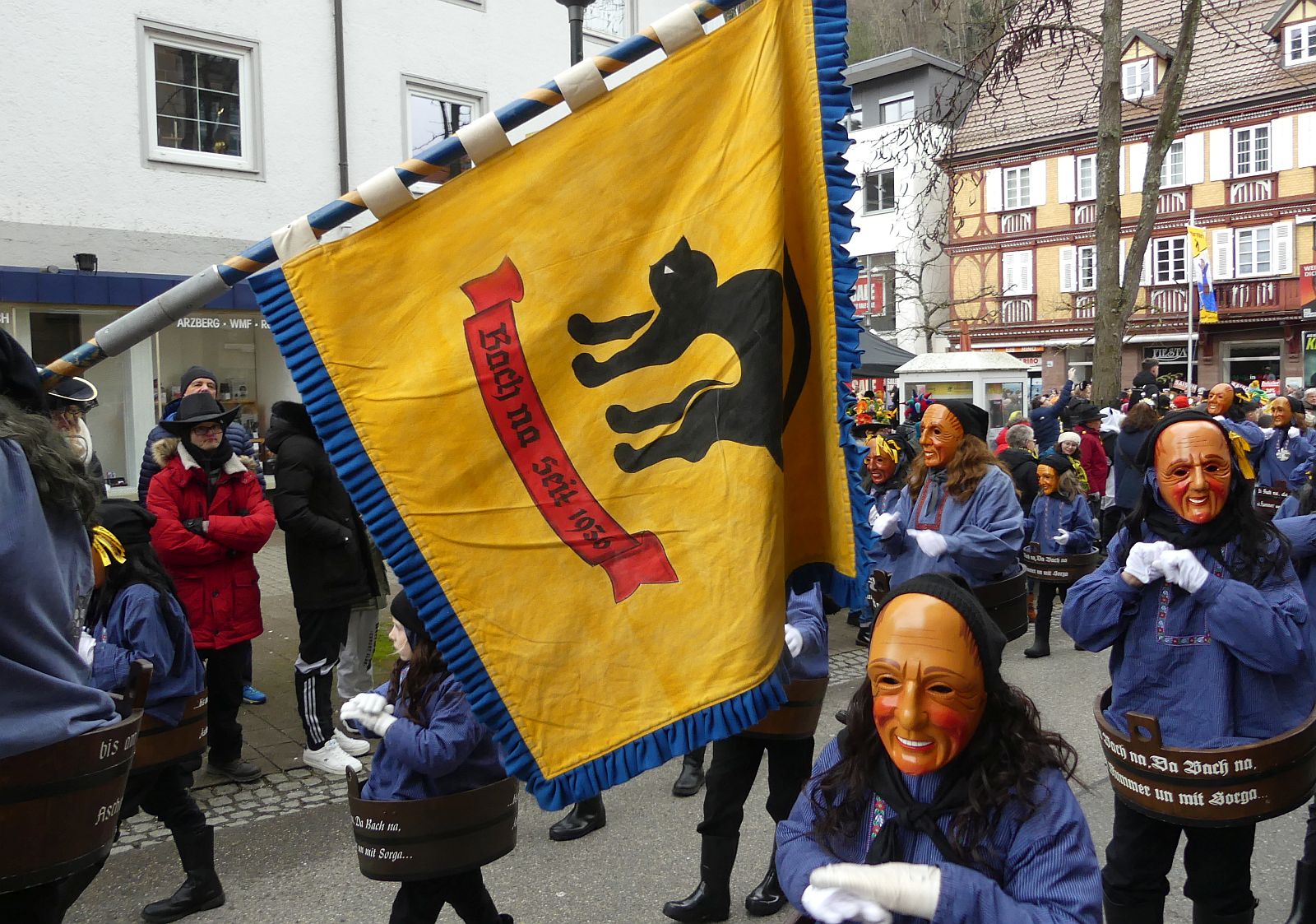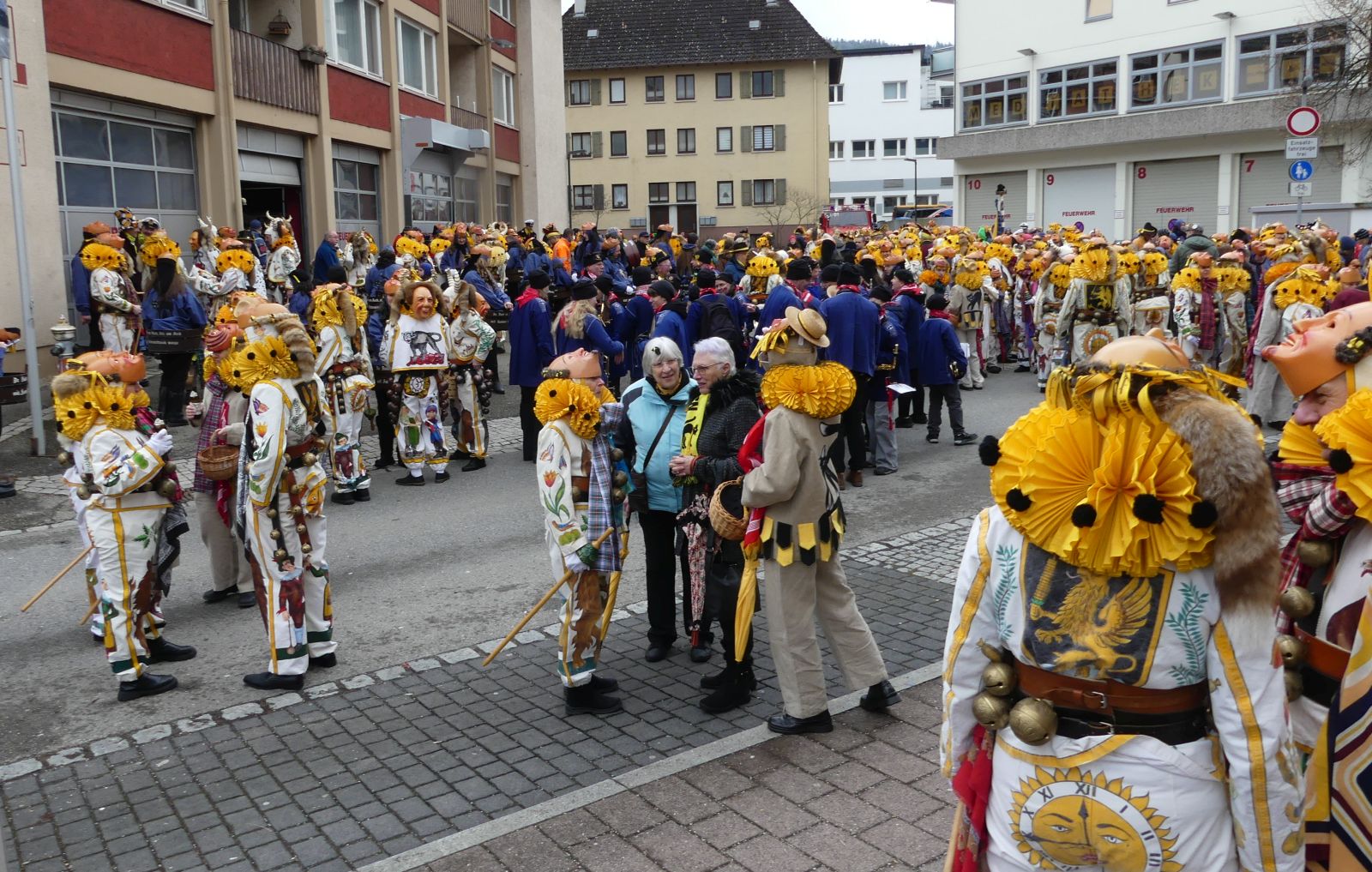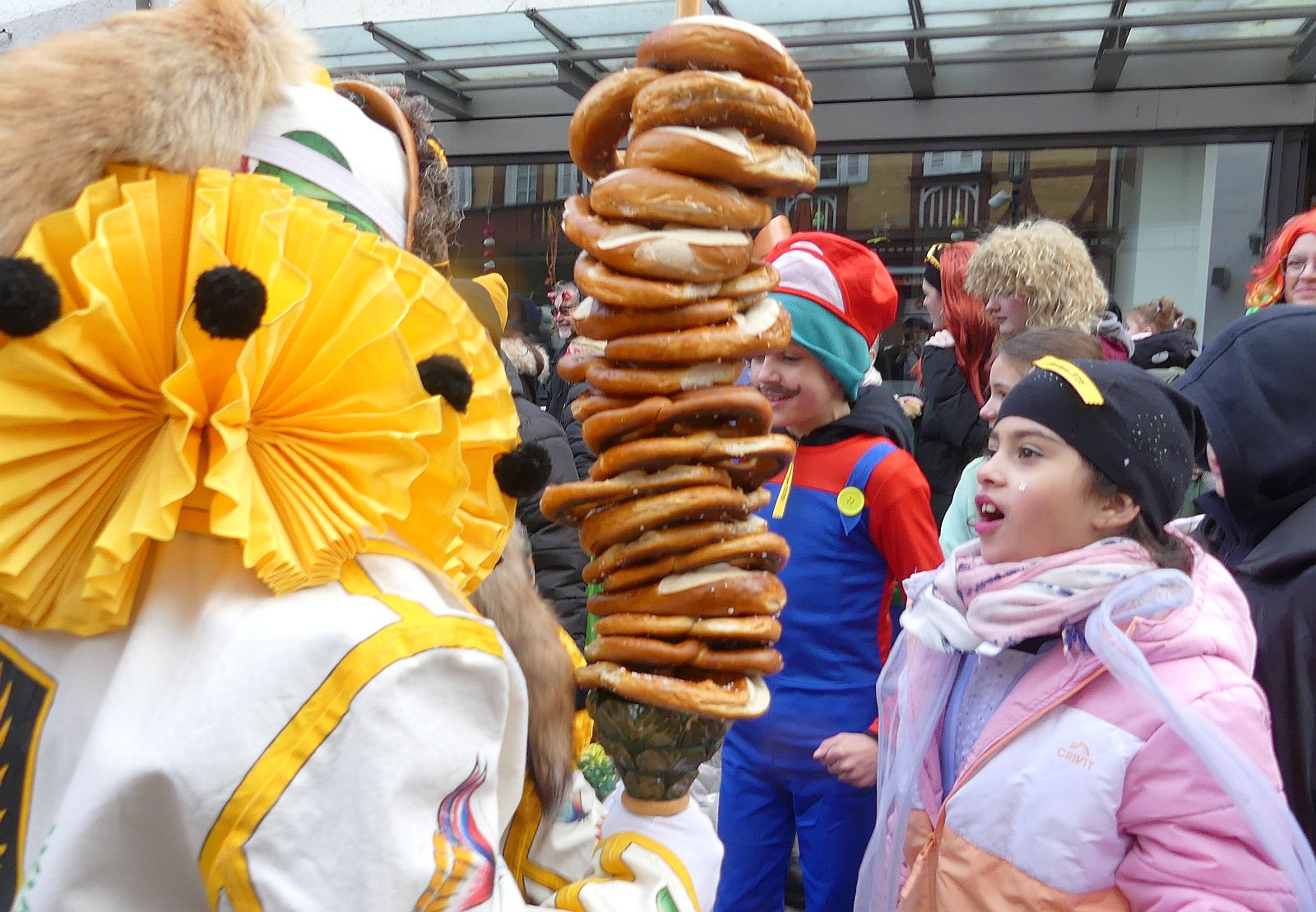 Im Rathaus füllten die Narren im Rathaus ihre Brezelstengel, Täschle und Zuber. Dann ging es hinaus zum wie immer auf die Straßen mit den bunt kostümierten Zuschauerinnen und Zuschauern, die sangen, sprangen und tanzten, und die Narren um Brezeln, Würstle und Schoklädle anbettelte: „Hoorig, hoorig isch dia Katz…“ Das erhörte sogar die Sonne und blinzelte zwischen den Wolken durch.