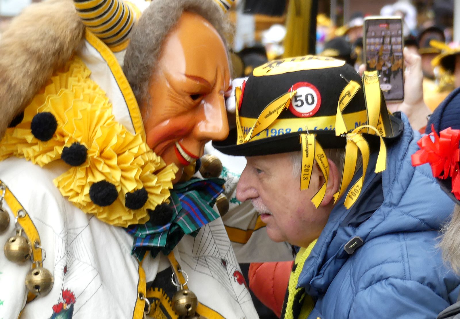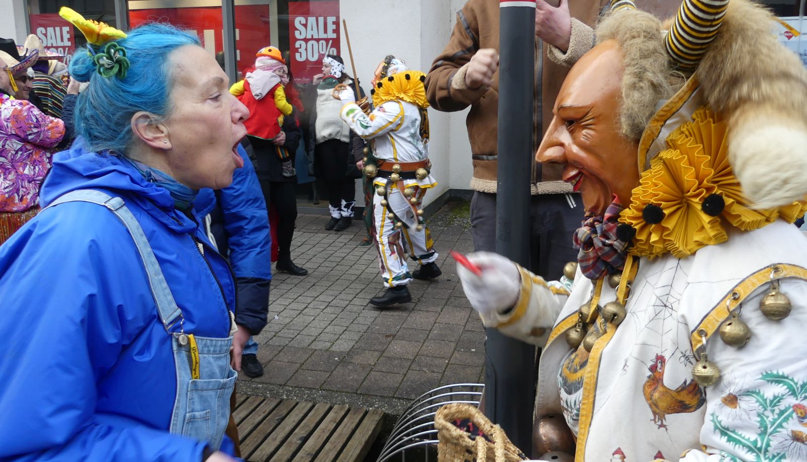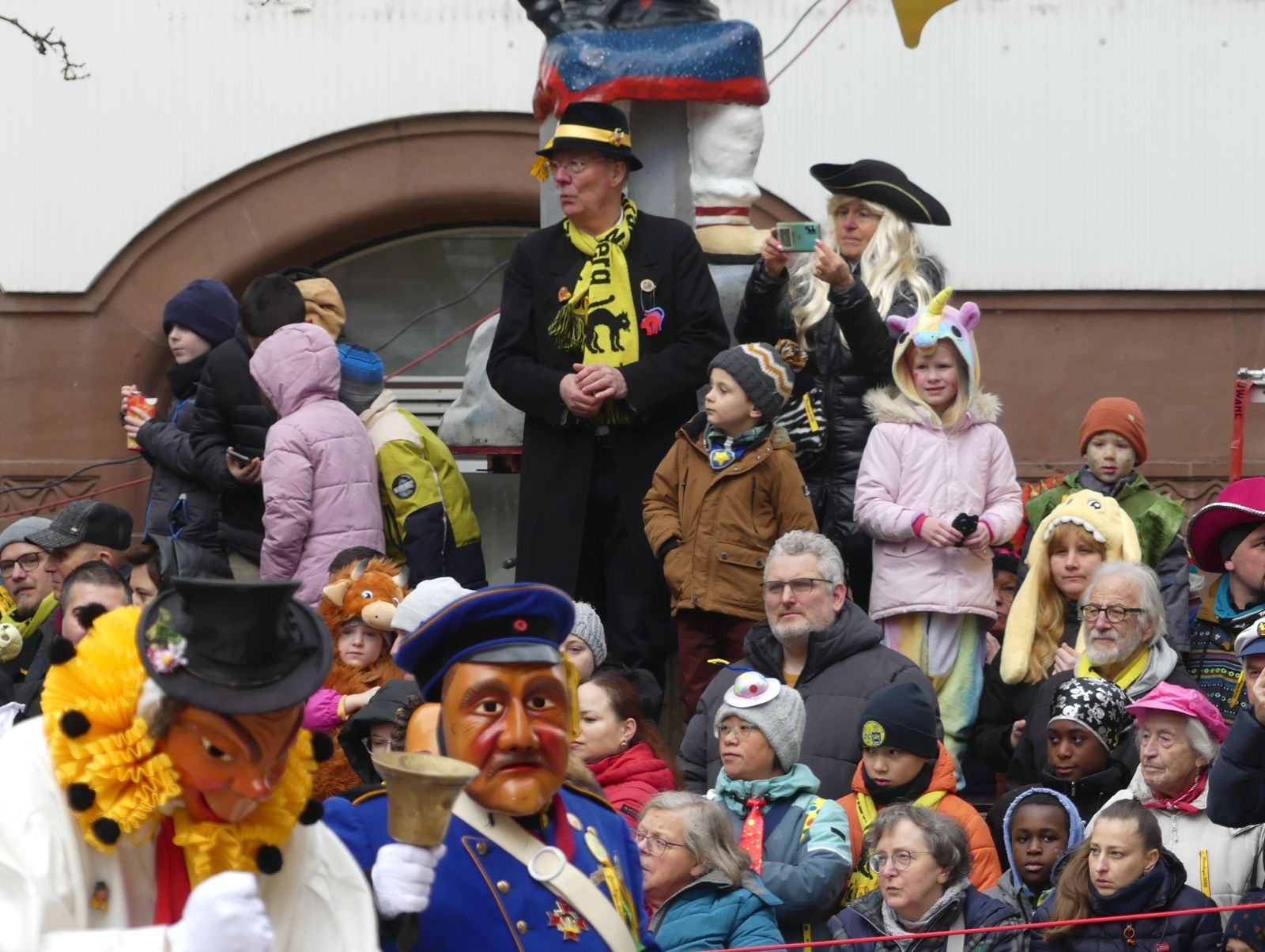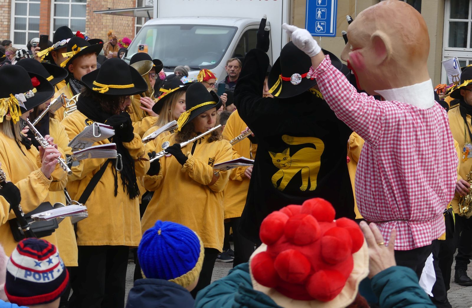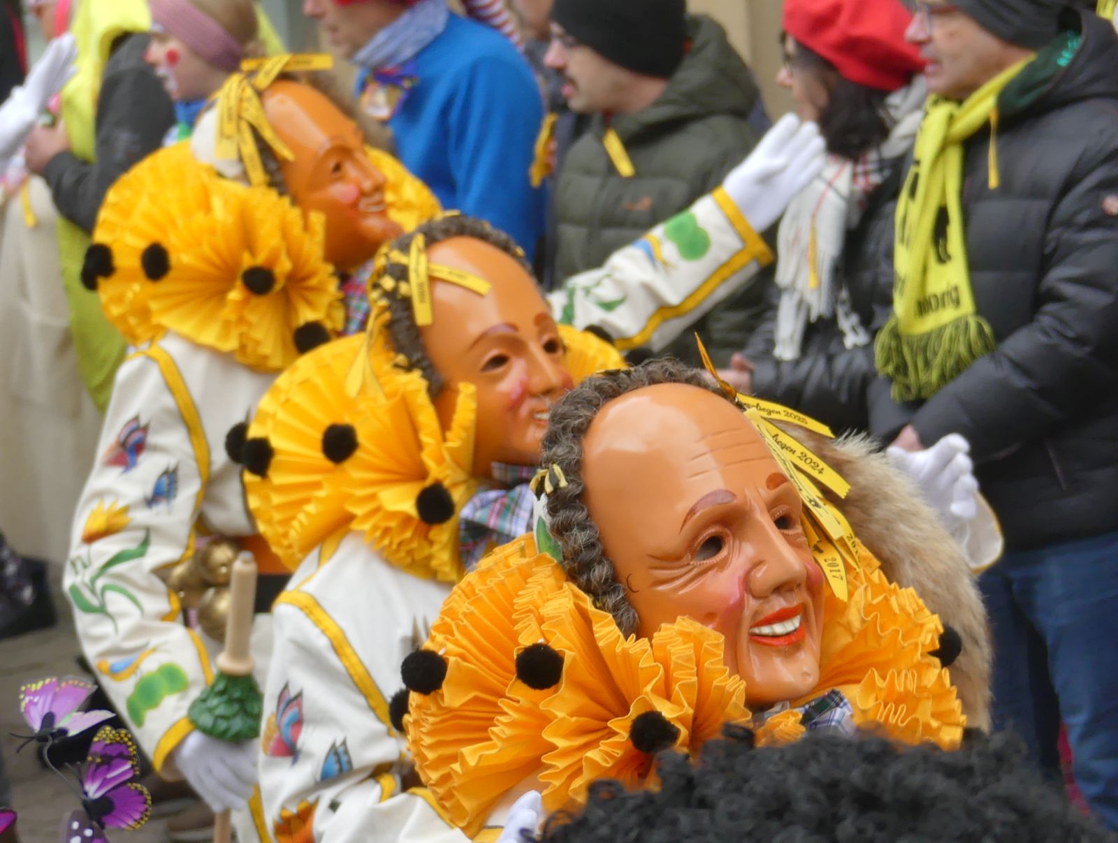 Im Rathaus füllten die Narren im Rathaus ihre Brezelstengel, Täschle und Zuber. Dann ging es hinaus zum wie immer auf die Straßen mit den bunt kostümierten Zuschauerinnen und Zuschauern, die sangen, sprangen und tanzten, und die Narren um Brezeln, Würstle und Schoklädle anbettelte: „Hoorig, hoorig isch dia Katz…“ Das erhörte sogar die Sonne und blinzelte zwischen den Wolken durch.