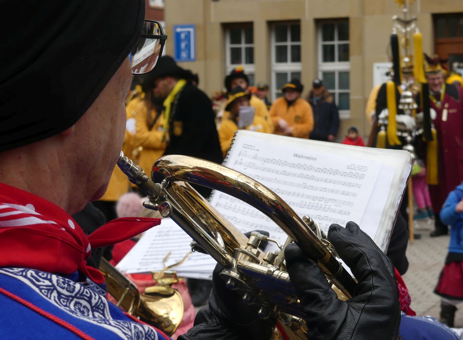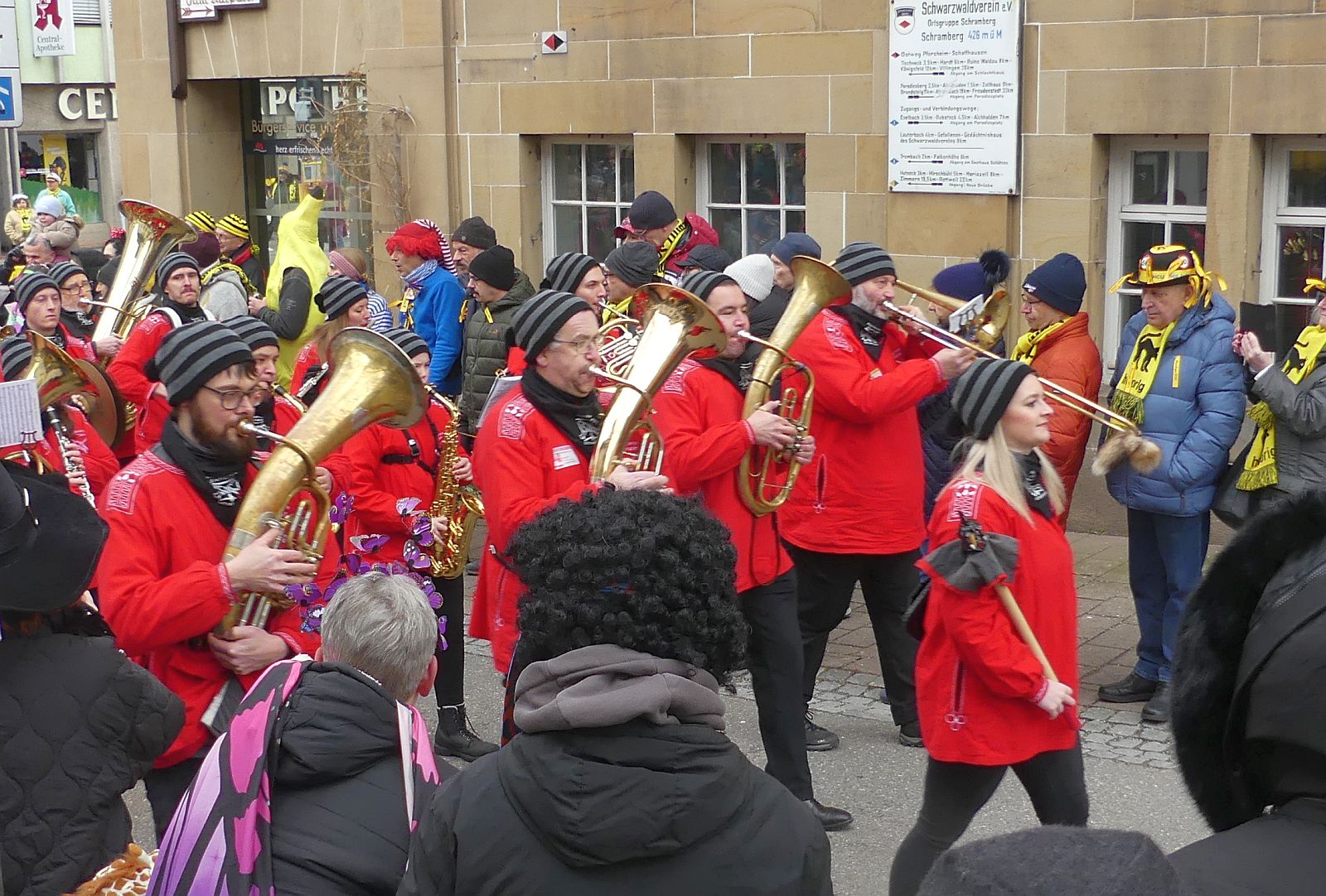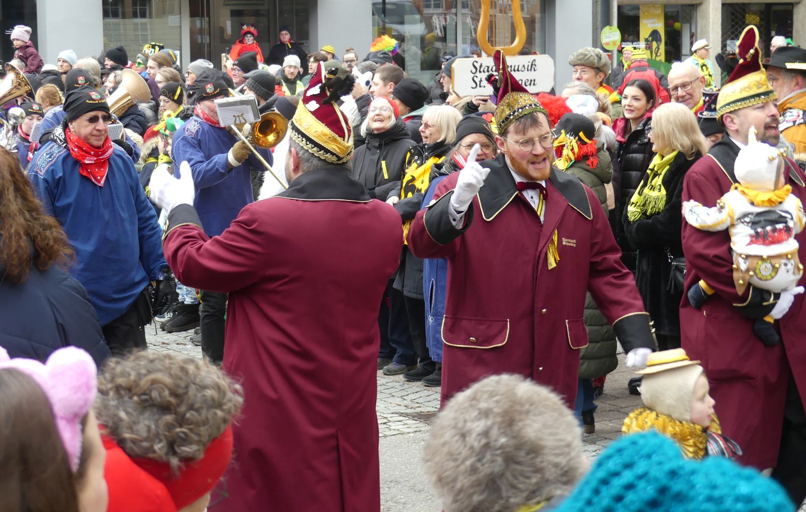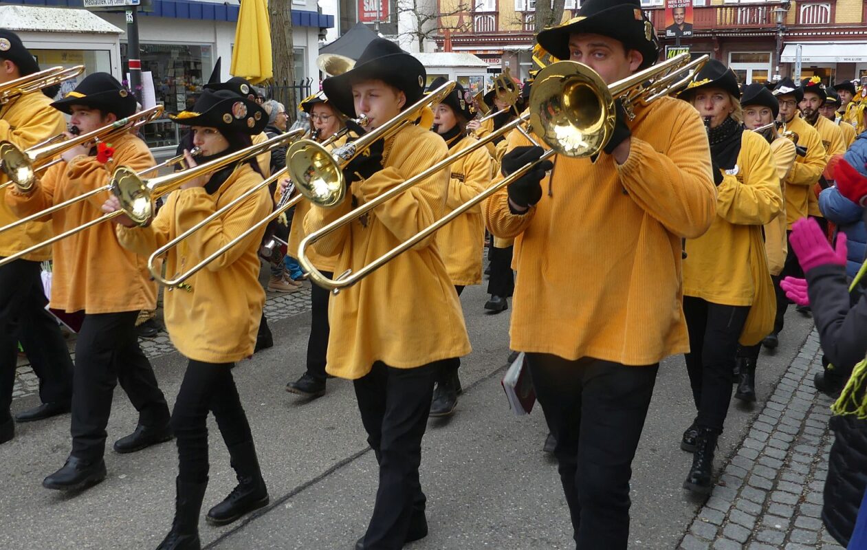 Die Stadtmusik und die befreundeten Kapellen aus Dettingen, Rötenberg und St. Georgen sorgten nach dem Hanselsprung auf dem Rathausplatz für Stimmung. Heuer unterstützt von fünf Lachener „Grind“, Schwellköpfen aus Schrambergs Partnerstadt am Zürichsee. Unter einem Grind steckte sogar der Lachener Gemeindepräsident😊.