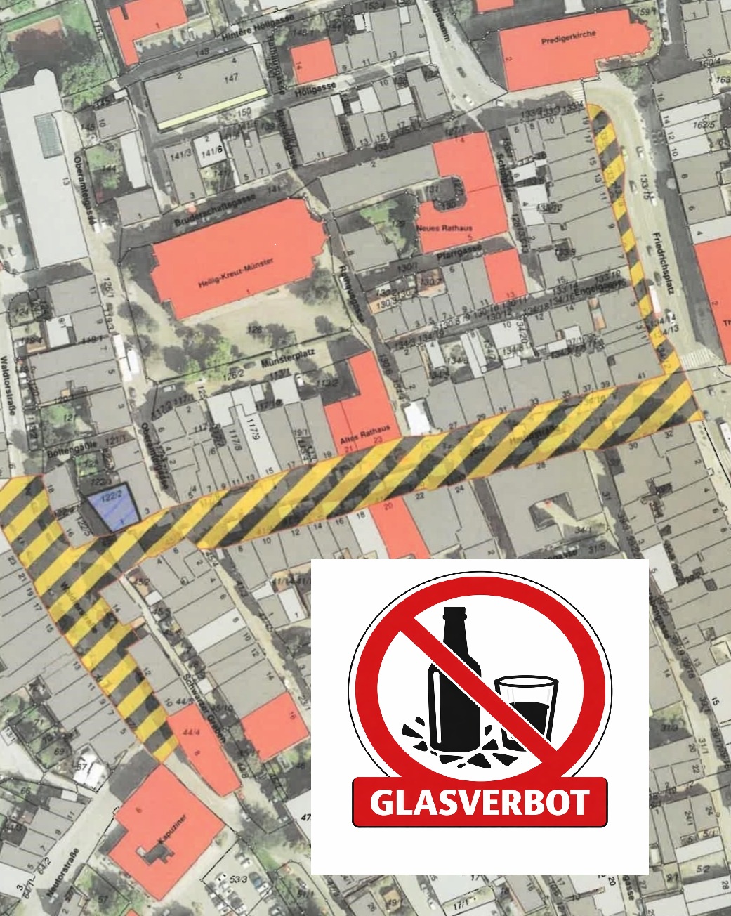 Das Mitführen wie auch die Benutzung von Glasbehältnissen wie beispielsweise Flaschen werden in dieser Zeit nicht erlaubt sein. Das Mitführungs- und Benutzungsverbot wird dabei in der gesamten Oberen Hauptstraße (Fußgängerzone) und der Waldtorstraße sowie am Friedrichsplatz im Fußgängerbereich gelten. Das Verbot gilt ab Ende der Fußgängerzone auf der Seite des ehemaligen Drogeriemarktes „Müller“ bis zum Gebäude Friedrichsplatz 19. Eine entsprechende Verfügung hat die Stadtverwaltung erlassen.