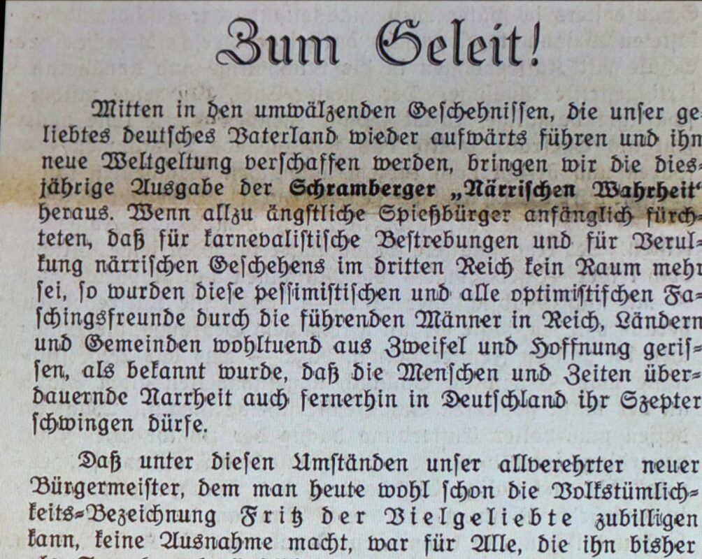 Mit einem wenig beachteten Kapitel der Schramberger Fasnetsgeschichte hat sich Stadtarchivar und Museumsleiter Carsten Kohlmann am Mittwochabend beschäftigt. In seinem Vortrag „Närrische Wahrheit unter dem Hakenkreuz“ beschäftigte er sich mit den Ausgaben der Narrenzeitung „Närrische Wahrheit in den Jahren 1933 bis 1939.