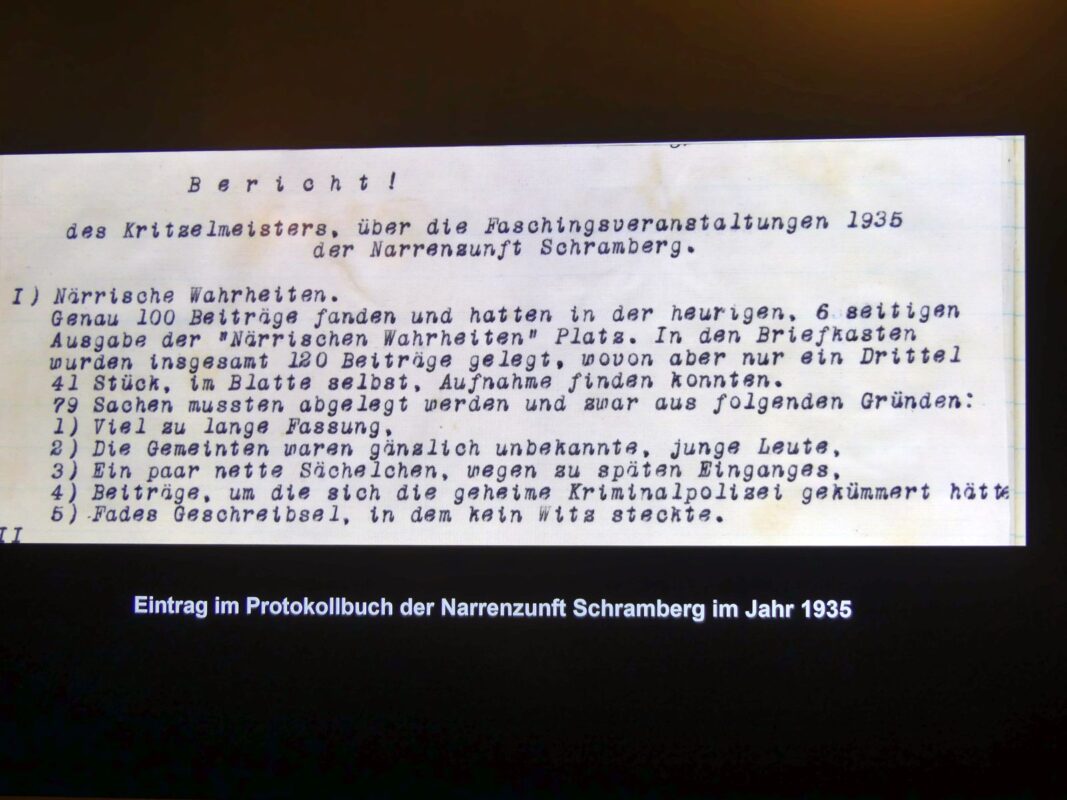Wie sehr die Narrenzunft inzwischen auf die neuen Herrscher Rücksicht nimmt, nehmen muss, um niemanden zu gefährden, geht aus einer Notiz des Kritzelmeisters nach der Fasnet 1935 hervor. Er listet auf, wie viele Geschichten für die “Närrische Wahrheit“ eingingen, nämlich 120. 79 Geschichten habe man abgelehnt, unter anderem „Beiträge, um die sich die Geheime Kriminalpolizei gekümmert hätte“.