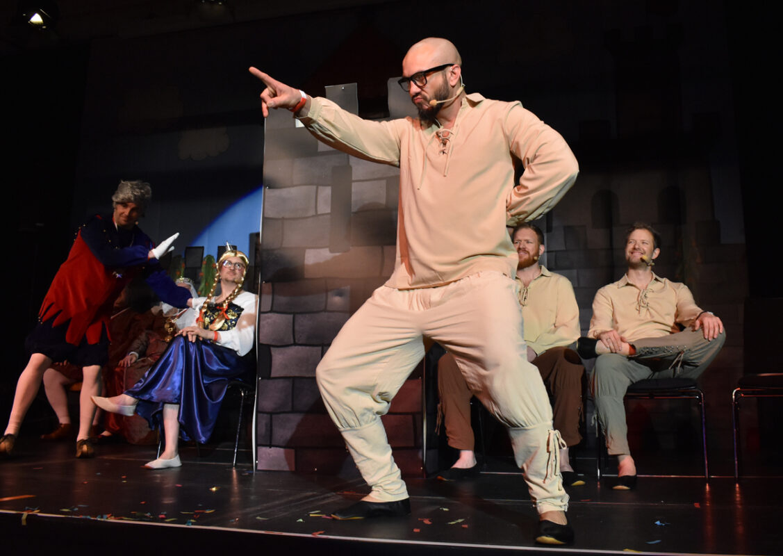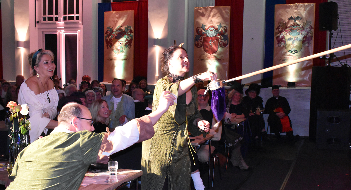 Dann Auftritt des Königspaars Gunter Wilde als König Gunnar und Stephan Drobny als Königin. Dafür hatte er seinen noch zu Beginn des Balls prächtigen Vollbart abrasiert, nur unter der Nase gab es noch einen Damenbart. Es galt, für Prinzessin Simona einen Partner zu finden. Und drei Bewerber gab es – im Fernseh-Spiel „Herzblatt. Hier glänzte Timo Digeser als Moderator mit holländischem Akzent. Aber auch die anderen Mitspieler zeigten sich bestens aufgelegt. So ging es in die Pause – ohne dass sich die Prinzessin für einen Bewerber entschieden hatte.