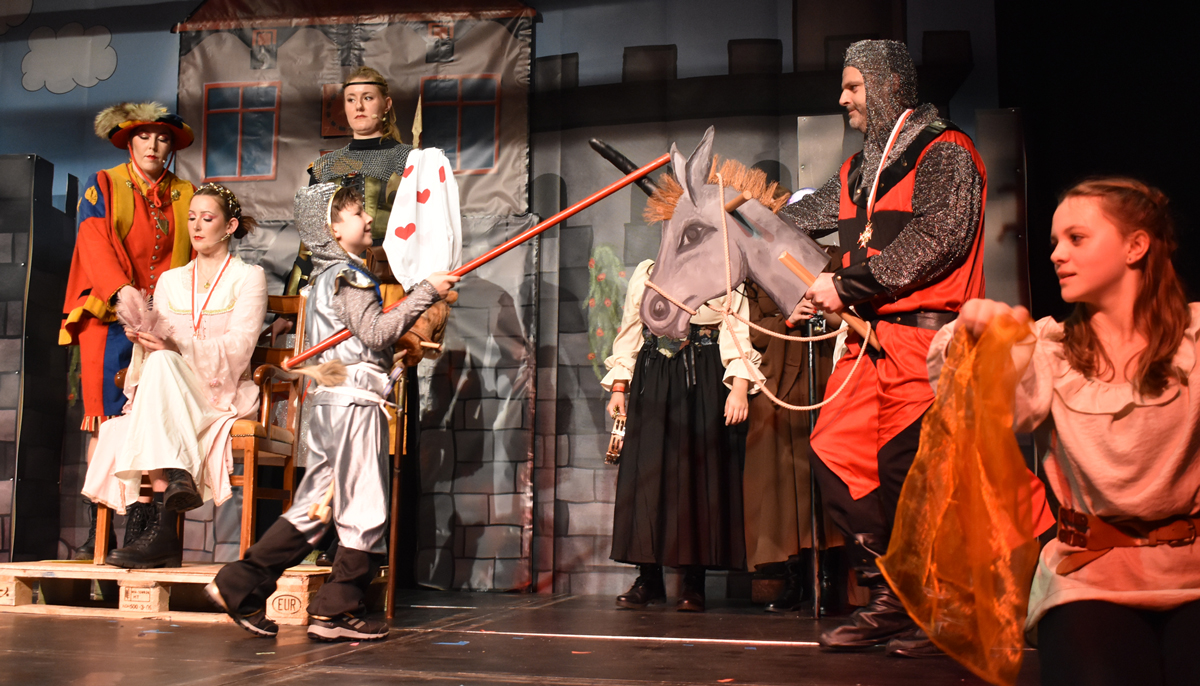 Eine ganze Revue mit Lokalem, Aktion und Musik brachte die Gruppe „Läbtag“ auf die Bühne. Mit Ritterspielen (der Favorit konnte nicht kommen – zu viele Baustellen in der Stadt), Kampf mit einem Drachen, Gauklern – und der Ankündigung der Prinzessin, beim Abstellen des Pferdes einen Gulden für jede angefangene Stunde zu verlangen. Der verbliebene Ritter musste sich dem Knappen (Julius Lang) geschlagen geben – und drei Frauen machten mit dem bösen Drachen kurzen Prozess. OB Ruf und die Gemeinderäte musste sich dann auch noch den Vers anhören: „Und die Moral von der Geschicht, mit den Vereinen versch… man es besser nicht“.