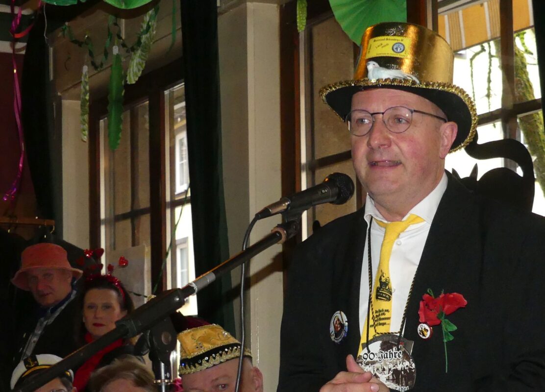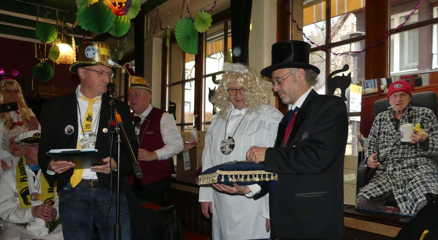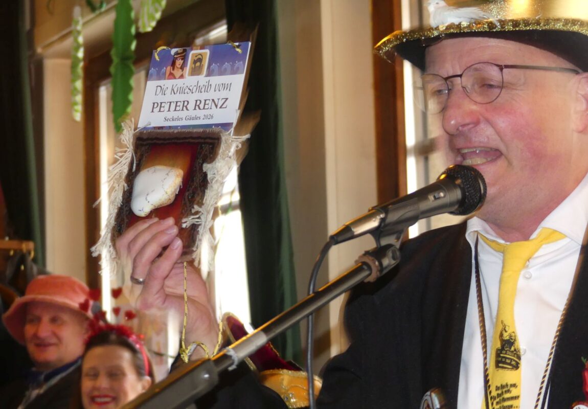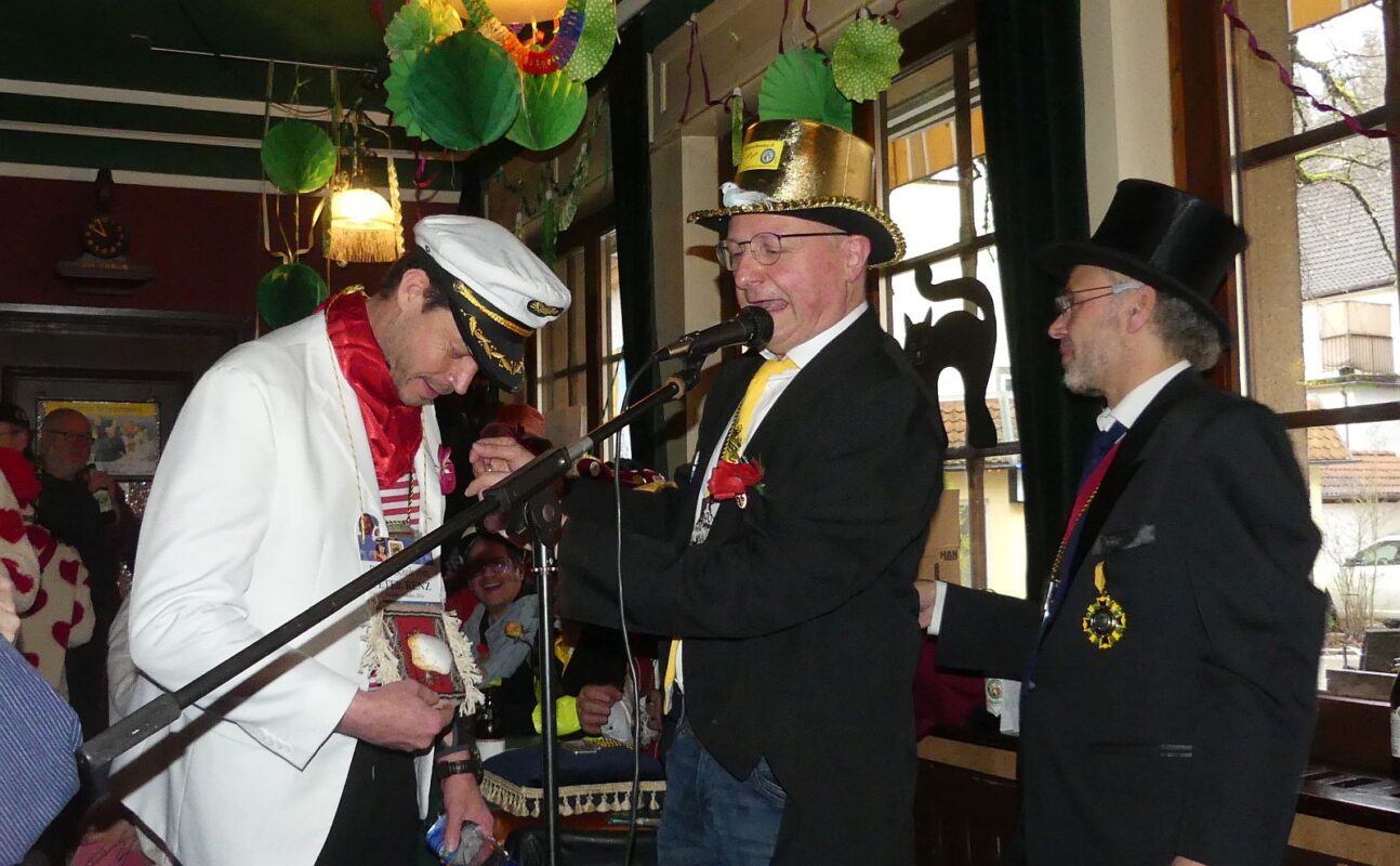 Doch bevor es zur Ordensverleihung kam, waren noch alle möglichen Regularien abzuwickeln. „Worte, Weisheiten und ein geschönter Jahresrückblick“ standen auf der umfangreichen Tagesordnung. “Oberseckel“ Peter Renz und seine Ute seien im Krankenhaus. „Die beiden haben jetzt Stahl im Körper“, verkündete Hasenmaile: Er im Knie, sie im Rücken.