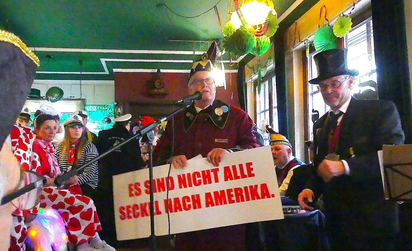 Dann unterbrach Uli Bauknecht die Sitzung und hatte eine traurige Botschaft: Ein amerikanischer Abkömmling vom Schreiner Fuss habe die Rechte am Spruch: “Es sind nicht alle Seckel nach Amerika“ für seine Narrenzunft in Minnesota reklamiert. Ein Gericht in Düsseldorf habe den Amis Recht gegeben, und er müsse nun alle Orden mit dem Spruch einsammeln.