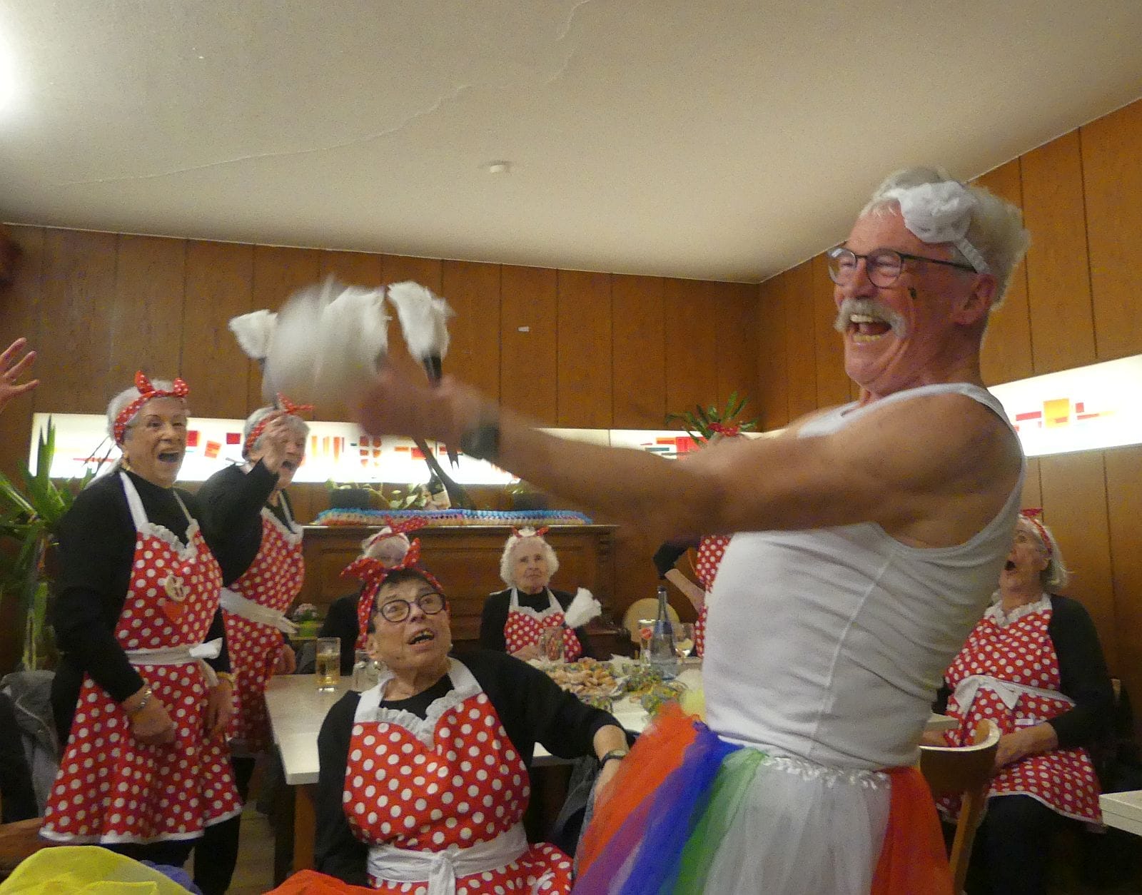 Schramberg. In acht Lokalen von der Majolika im Norden übers (für die Fasnet geöffneten) “Napo“ an der Steige bis zum „Roma“ an der Berneckstraße im Süden boten die Akteure ein quietschvergnügtes Programm. Im Roma tauchte zunächst der Hafner Sigger als Ballerina auf und jonglierte mit bunten Tülltüchern. Und weil die Staubwedel der ergrauten Putztruppe am Roma-Stammtisch sich ebenfalls jonglieren ließen, auch mit diesen.