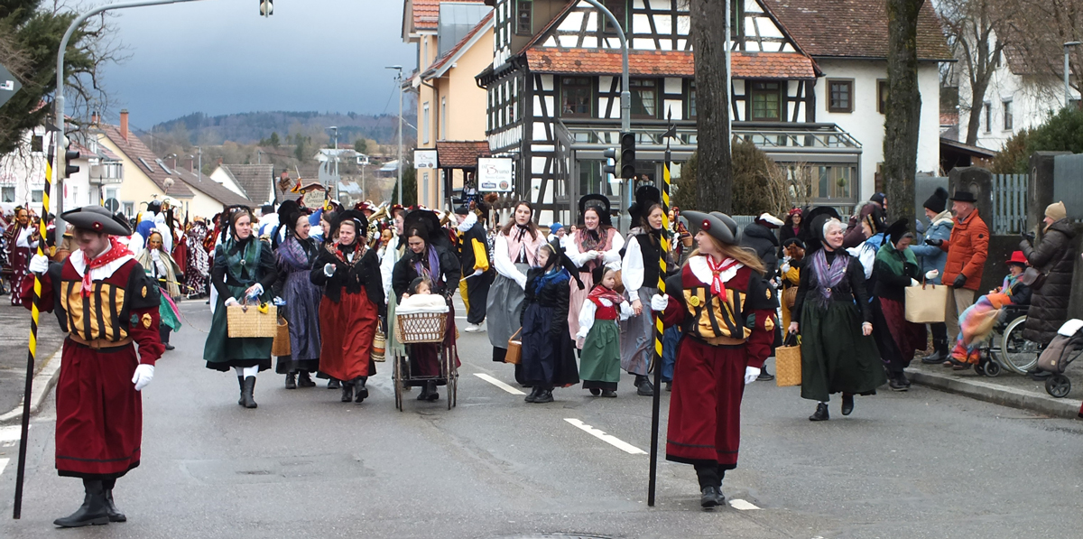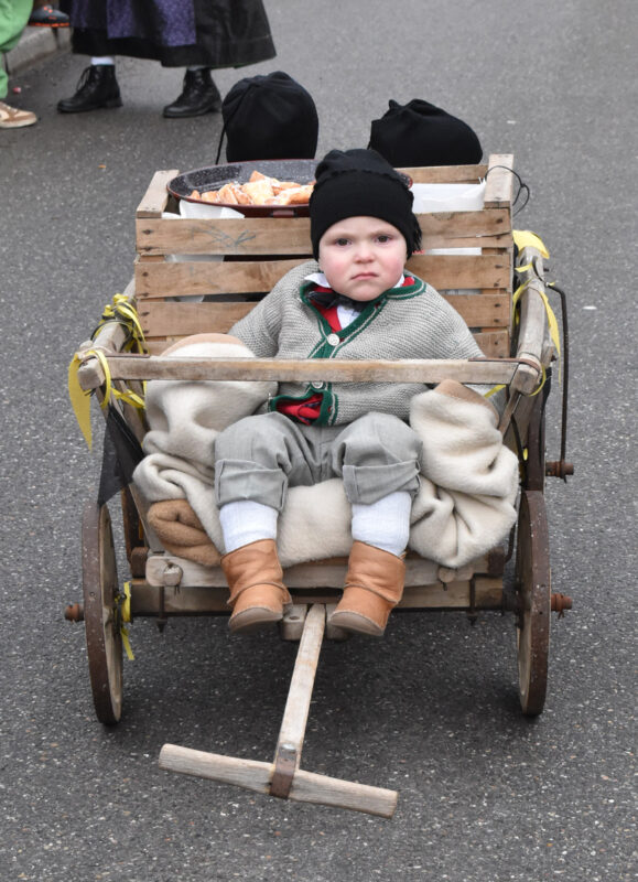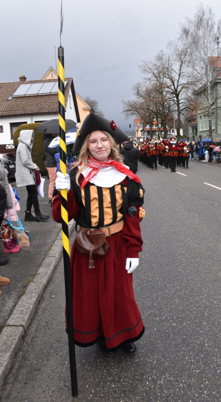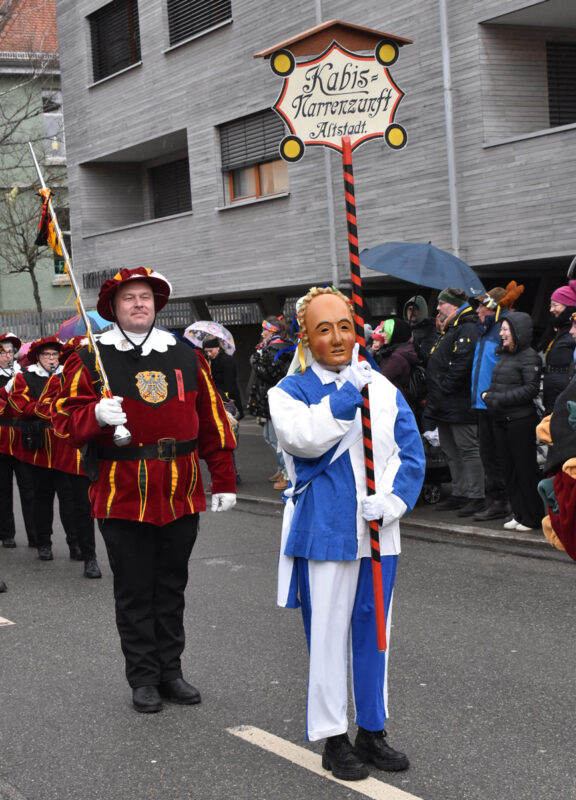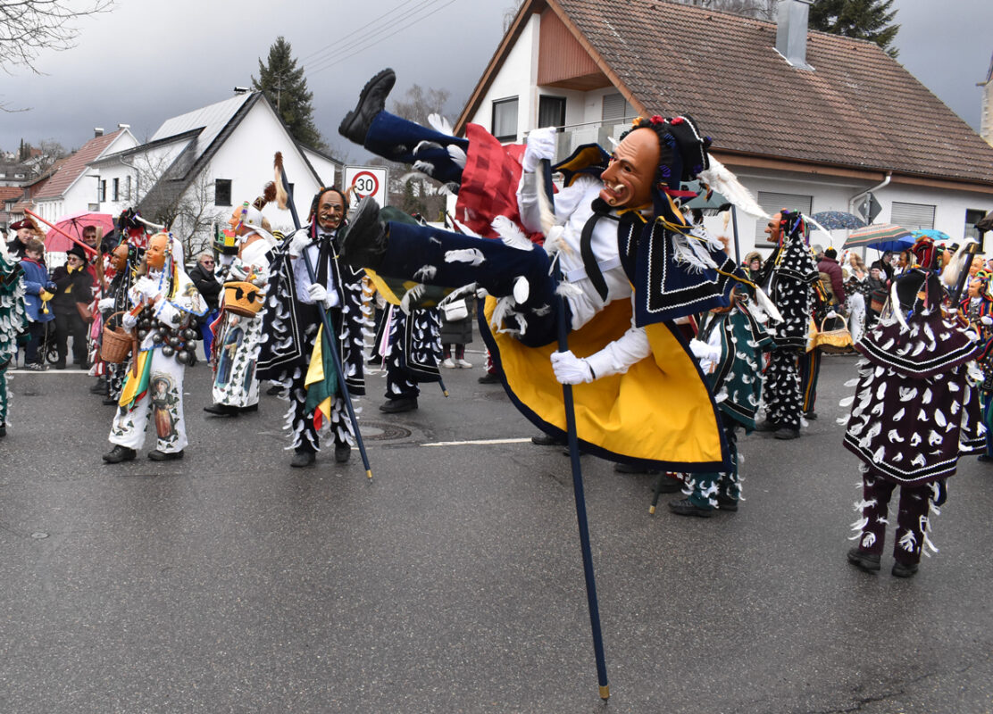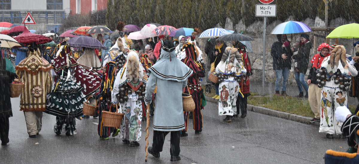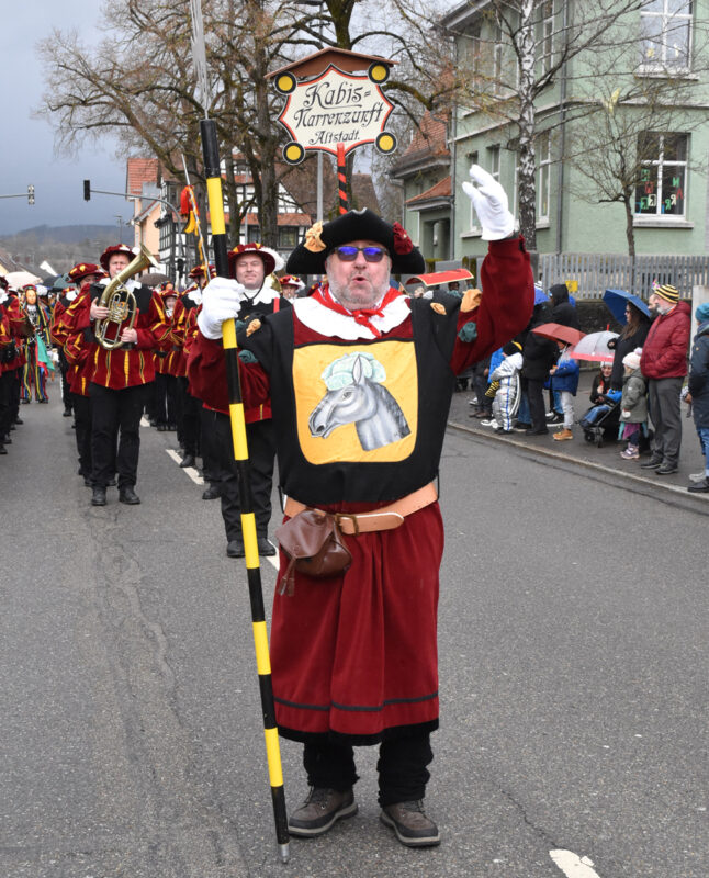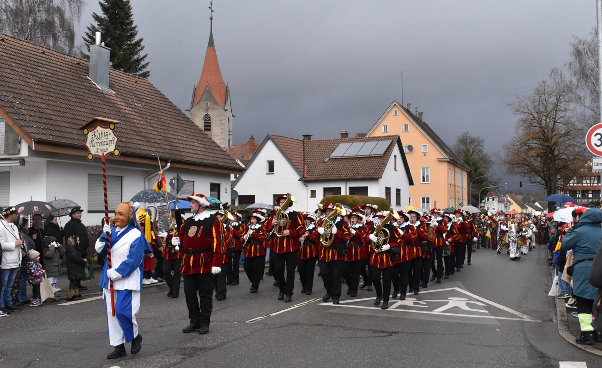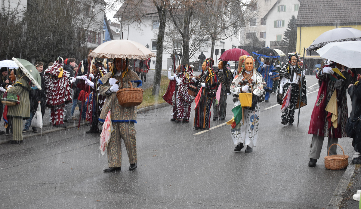 Rottweil-Altstadt – Da waren nicht nur die Schantle froh an ihrem Schirm. Wobei der Umzug schön harmonisch angefangen hatte, mit Kinderrössle, Narrensamen, Trachtenträgerinnen und Bajassen. Der Musikverein Frohsinn lieferte die Musik dazu. Und dann die große Schar an Rottweiler Narren, am Ende die Rössle. Die wurden dann pudelnass, der Regen ließ sich von den knallenden Peitschen nicht vertreiben.