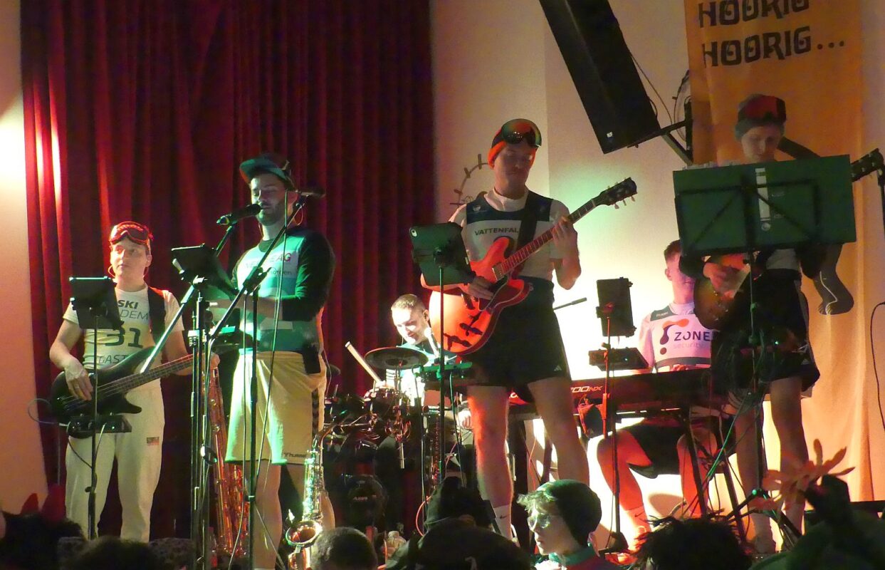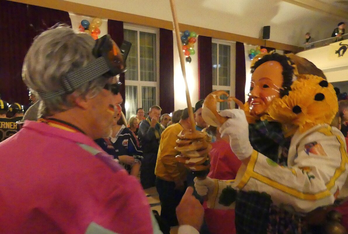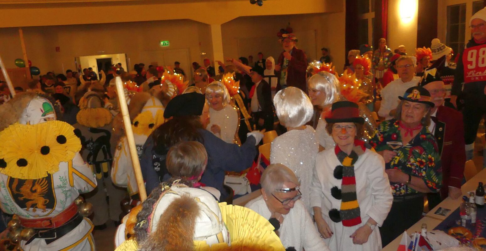 Nach dem Schlussbild im Olympiastadion mit allen Beteiligten führte Tobse Dold die Polonaise durch den Saal an. Die „Saure Kuttla“ spielten noch bis tief in die Nacht für das närrisch tanzende Olympiapublikum. Das olympische Feuer loderte noch lang …