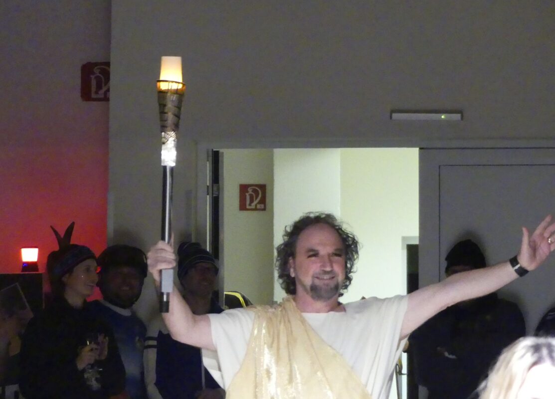 Das olympische Feuer holte sich Vizezunftmeister Udo Neudeck an historischer Stätte am abgebrannten Dolomiti, um es dann durch aller Herren Länder bis in den Bärensaal zu tragen. Die Olympische Flamme entzündete dann sein Kollege Jürgen Bihlmaier.