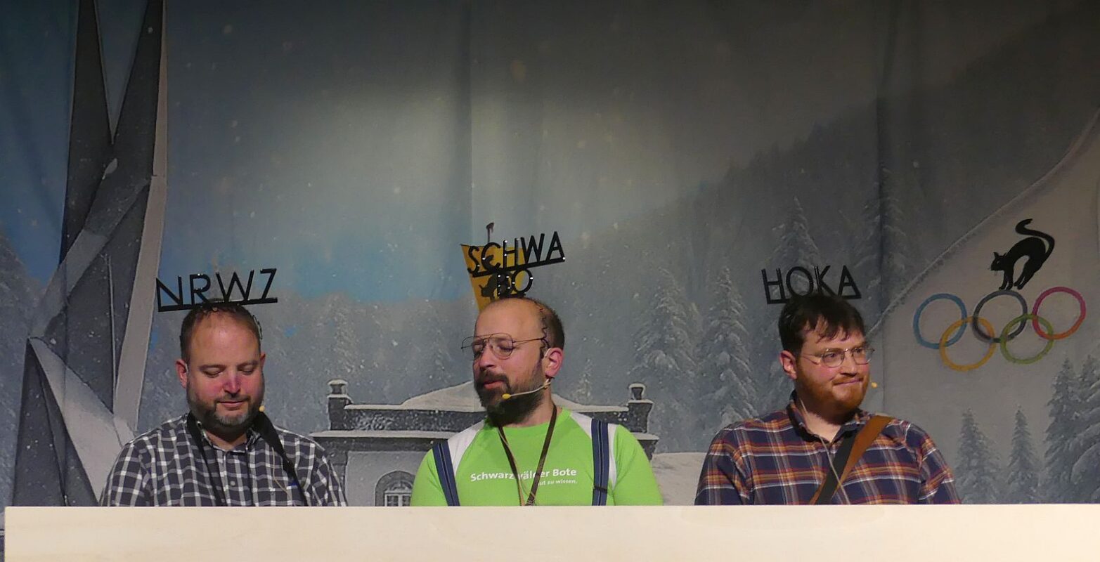 In ihrer „Brunsnummer“ nahmen die Reporter der drei Schramberger Zeitungen Schwabo, NRWZ und Hoorig Katz‘, Fabi, Max und Basti die große und die Lokalpolitik gehörig auf die Schippe. Besonders bös: Trump komme zu den Olympischen Spielen nur, um zu studieren, wie hoch die Mexikaner springen können. Zur E-Mail-Affäre, stellten die Lokalreporter fest, die Pontius-Pilatus-Methode tauge nichts: „Der Fisch stinkt vom Kopf.“