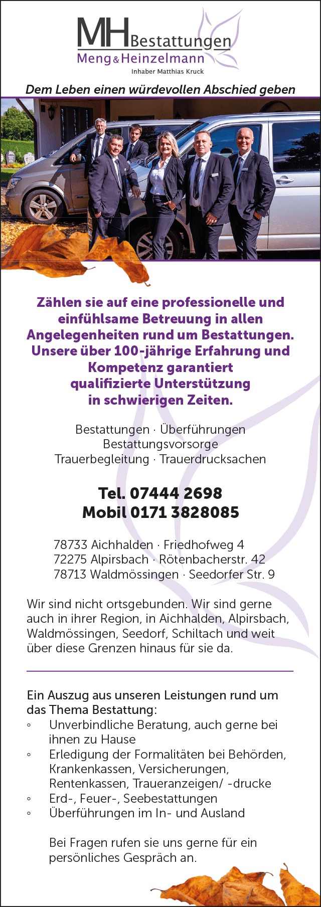 Weitere Informationen für Trauernde liegen in der Regel in den Bestattungsinstituten aus oder man kann sich direkt an Selbsthilfegruppen, Vereine, Wohlfahrtsverbände oder kirchliche Einrichtungen wenden. Auch Psychotherapeuten oder Bildungsträger wie die Volkshochschule bieten Kurse und Hilfen an. Niemand muss in Zeiten der Trauer mit seinem Schmerz alleine bleiben.
