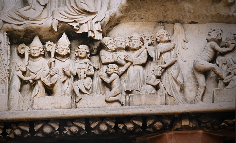 Schelmische Einzelheiten konnte sich der anonyme Meister um 1335 freilich nicht verkneifen: So schickt er frech auch kirchliche Würdenträger ins Höllenverderben – während ein braver Steinmetz in den Himmel kommt.