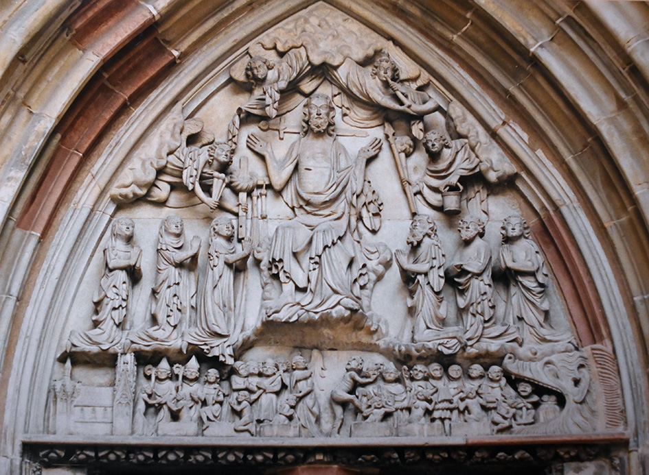 Zu Füßen Christi richtet sich der Blick auf das Jüngste Gericht. Detailreich ist zu sehen, wie Engel und Teufel die Menschen nach Gut und Böse trennen und ihrer Bestimmung zuführen. Rechts mündet der grausige Zug schmerzverzerrter Leiber in einem zahngespickten Höllenschlund. Links lächeln die Betroffenen selig, führt ein schützender Engel sie doch einer an Kirchenportale erinnernde Himmelspforte zu.