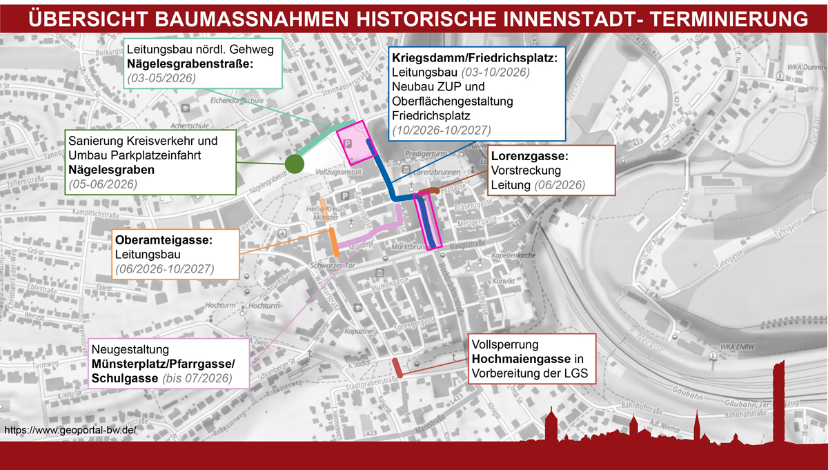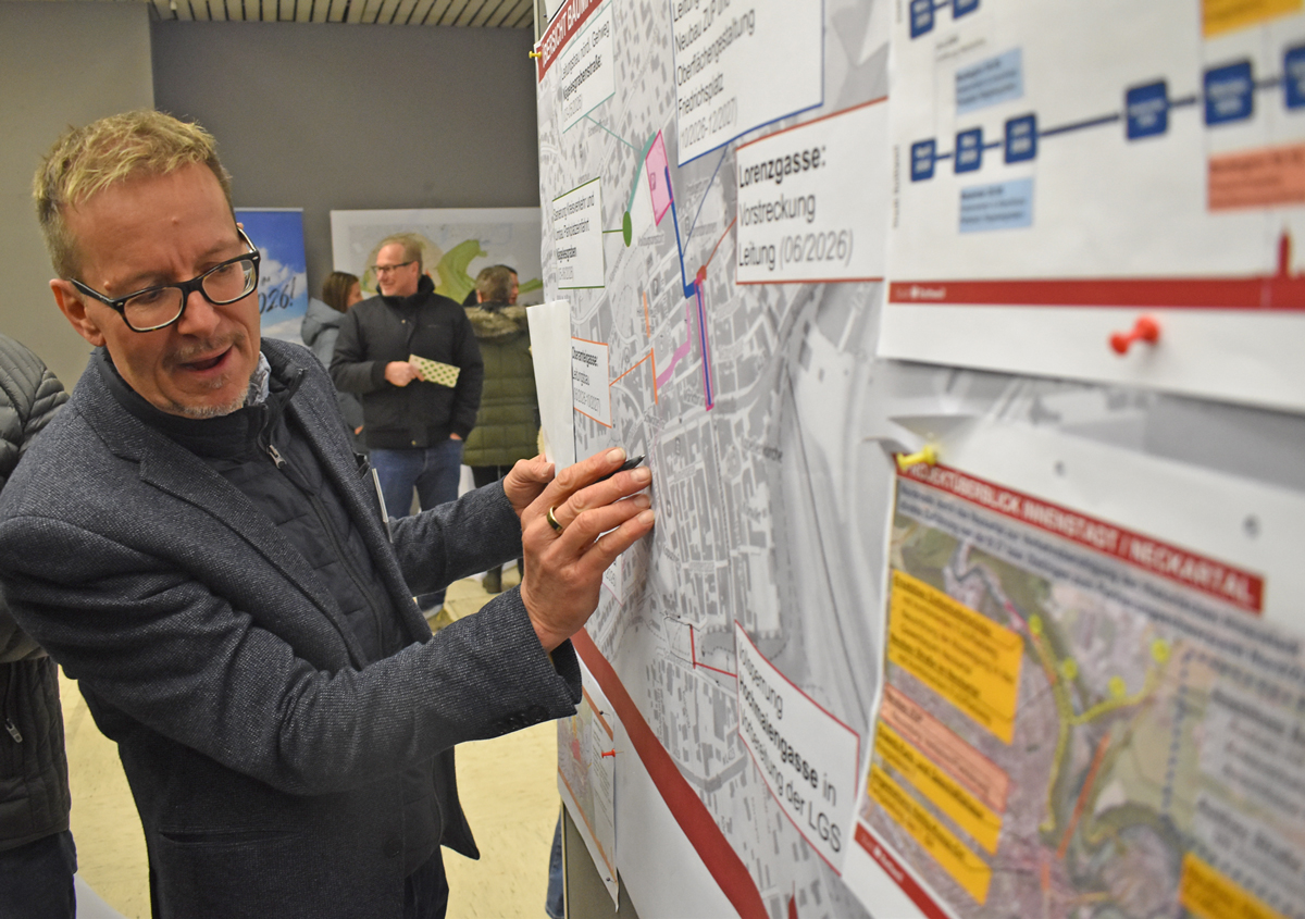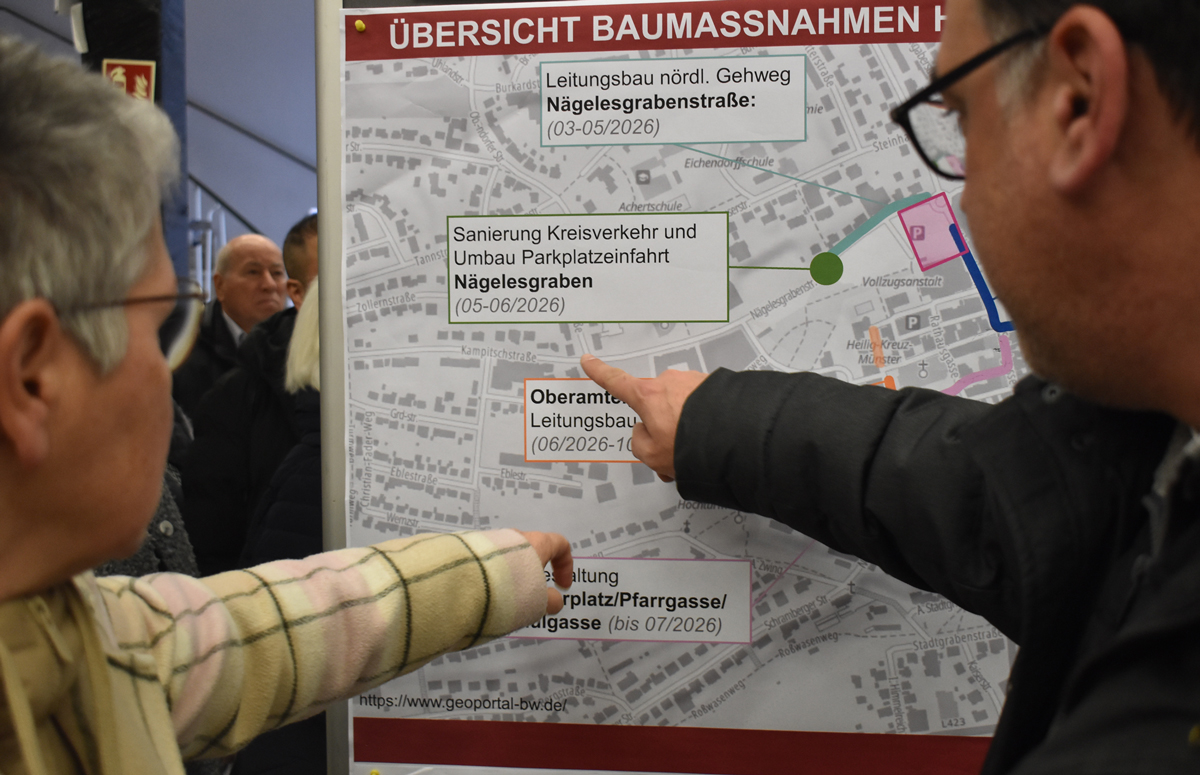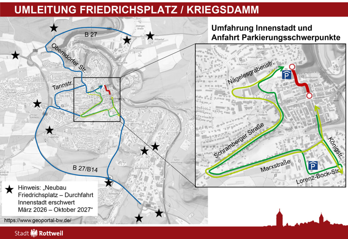 Rottweil – „Das kann gut werden. Aber bis es fertig ist, wird’s hart.“ Diese Feststellung eines Bürgers fand Oberbürgermeister Dr. Christian Ruf sehr treffend. Und in der Tat: Autofahrern und Anliegern der Umleitungsstrecken wird viel, Teilnehmern am öffentlichen Personenverkehr aber auch einiges zugemutet. Bis dann, laut Plan im Herbst 2027, der Friedrichsplatz in neuer Pracht und der bisherige Norma-Parkplatz als Busbahnhof (in der Planer-Sprache „ZUP“, Zentraler Umsteigepunkt genannt) erstrahlen. Die Verbindung zwischen dem Haupt-Straßenkreuz und dem Kreisverkehr Kriegsdamm/Nägelesgraben ist bis dahin aber für den Straßenverkehr nicht befahrbar.