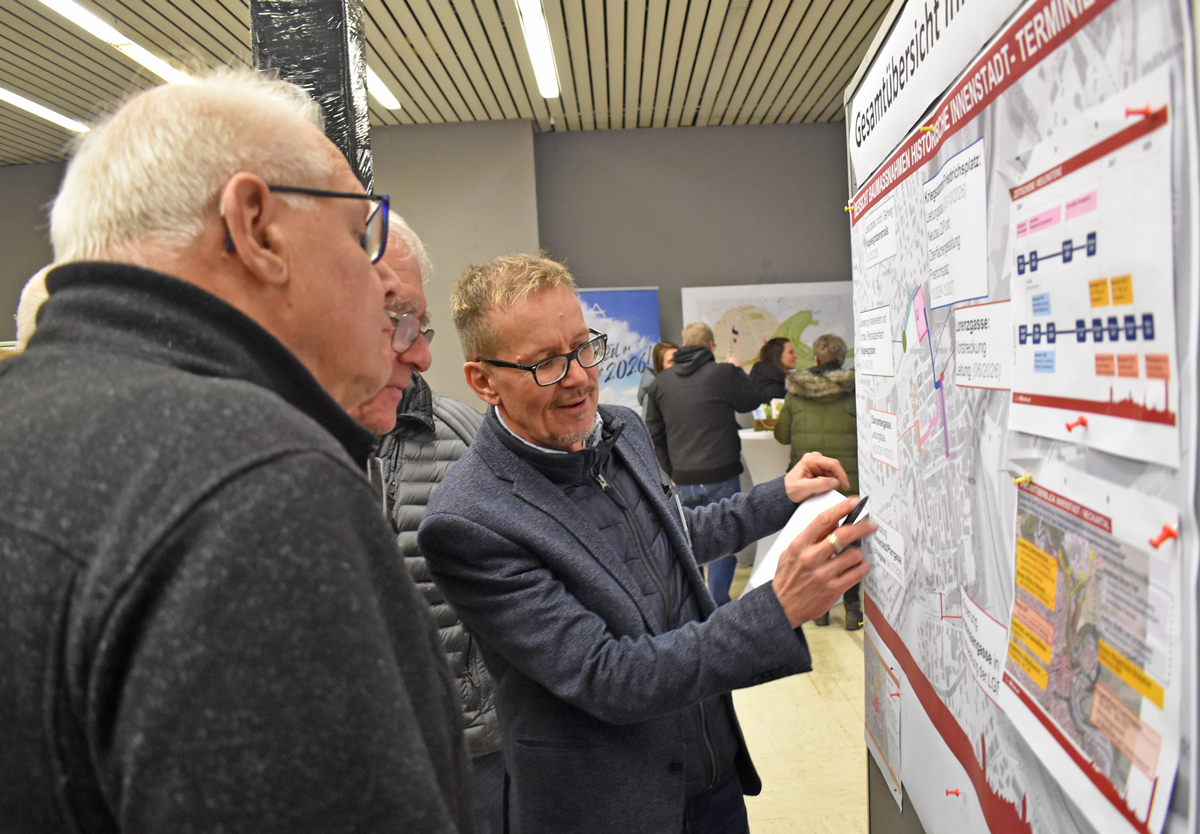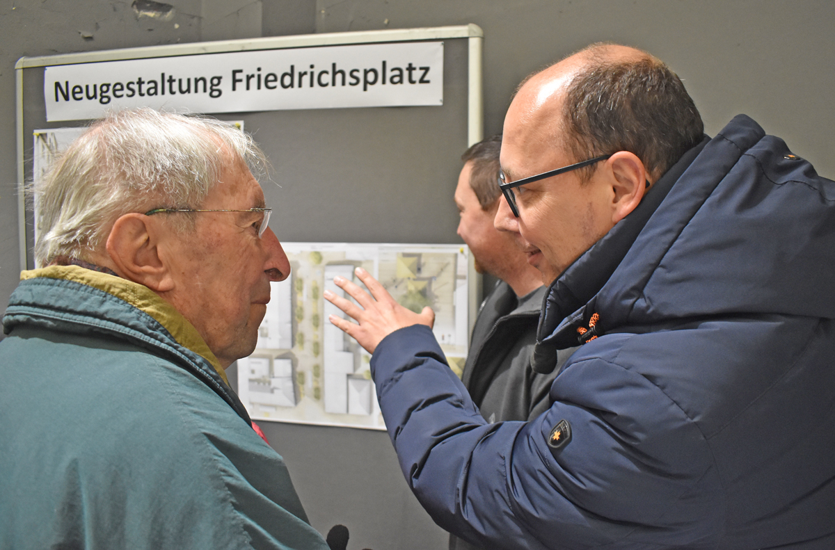 Die Pläne wurden an mehreren Stellen im Raum ausgehängt. Fachkräfte der Stadt wie der Mobilitätsbeauftragte Horst Bisinger standen für Antworten zur Verfügung. Und Fragen gab es reichlich. Auch Feuerwehr-Kommandant Frank Müller stand bereit. Er war sicher, dass der Schutz der Innenstadt auch in der Bauzeit gewährleistet ist: „Ich bin zuversichtlich, dass es klappt“, sagte er auf Frage. Schließlich müsse die Wehr für ihre Einsätze nicht über den Friedrichsplatz fahren.