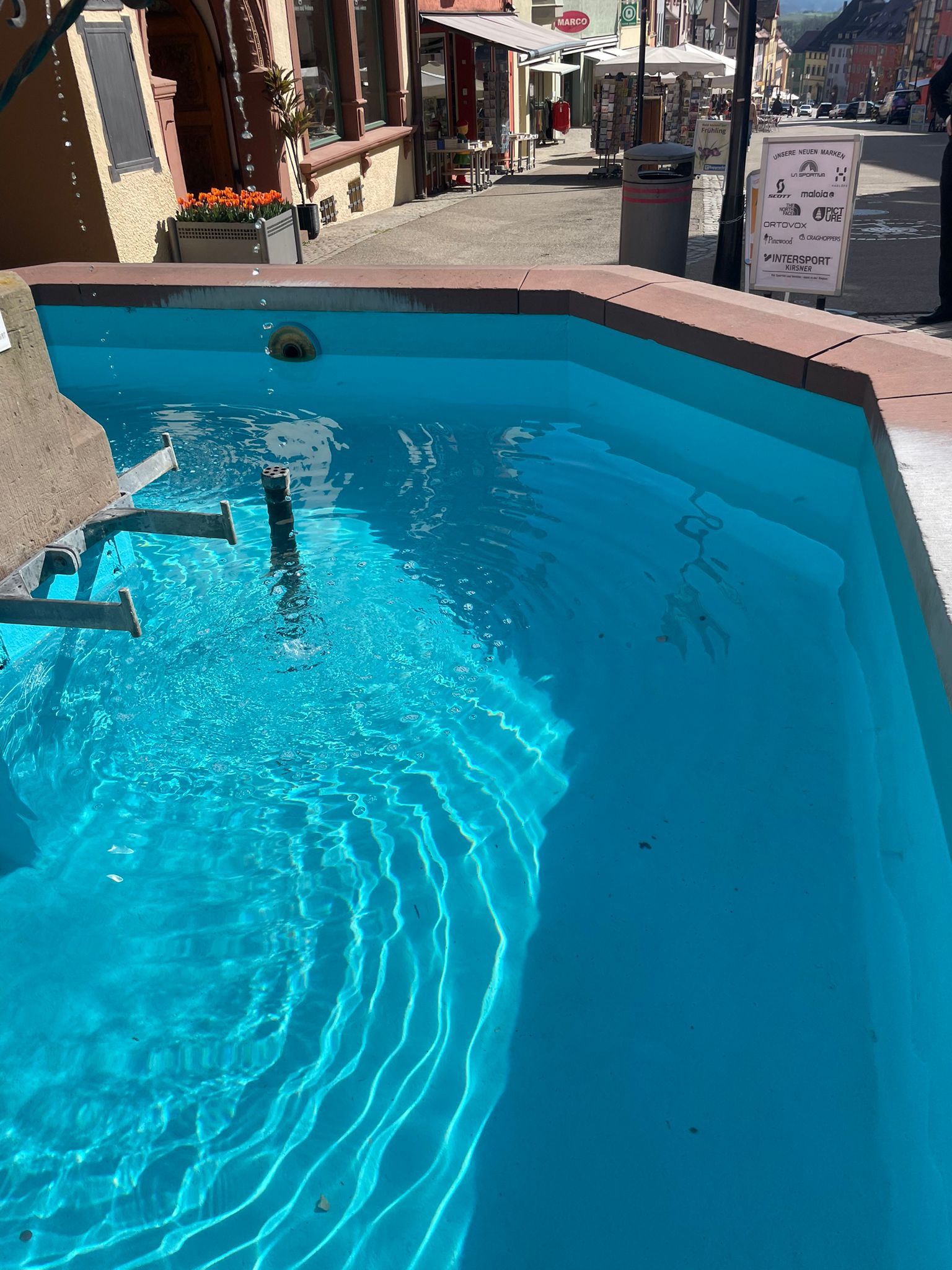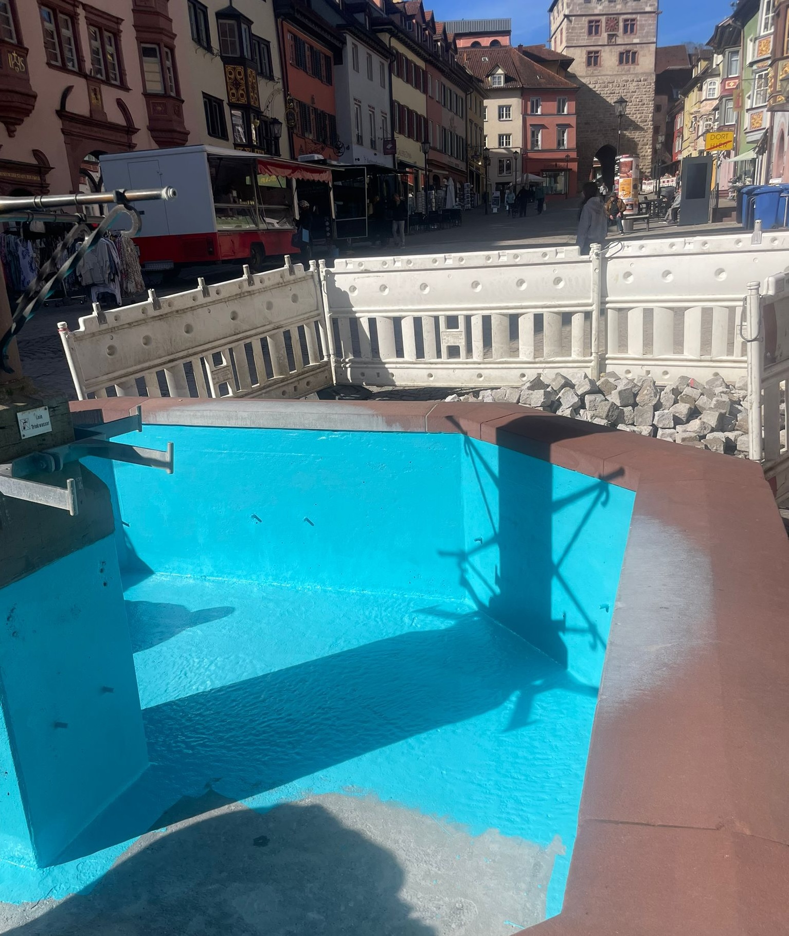 Ein frisch gestrichener Brunnen in der Rottweiler Innenstadt fällt derzeit durch eine ungewöhnlich kräftige Innenfarbe auf. Während die Stadt auf einen optischen Effekt mit Wasser setzt, reagieren einige Bürger irritiert – und stellen Fragen zum Umgang mit historischer Substanz.
