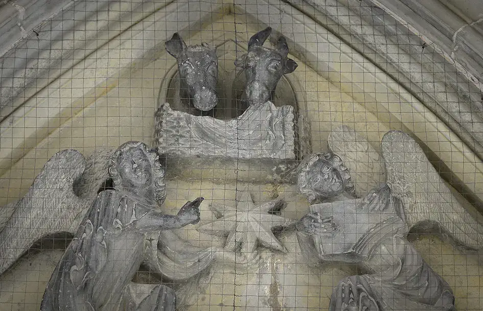 Aufgrund der aktuellen Instandsetzungsarbeiten kann man es nicht sehen, aber einander gegenüber knien dort zwei Engel. Der eine musiziert auf einer Zither, der andere präsentiert in der Bildmitte einen achtzackigen Stern. Fröhlich sehen sie aus, die beiden, mit ihren Lockenköpfen und detailreich gemeißelten Flügeln. Was allerdings fehlt: Das Christkind.