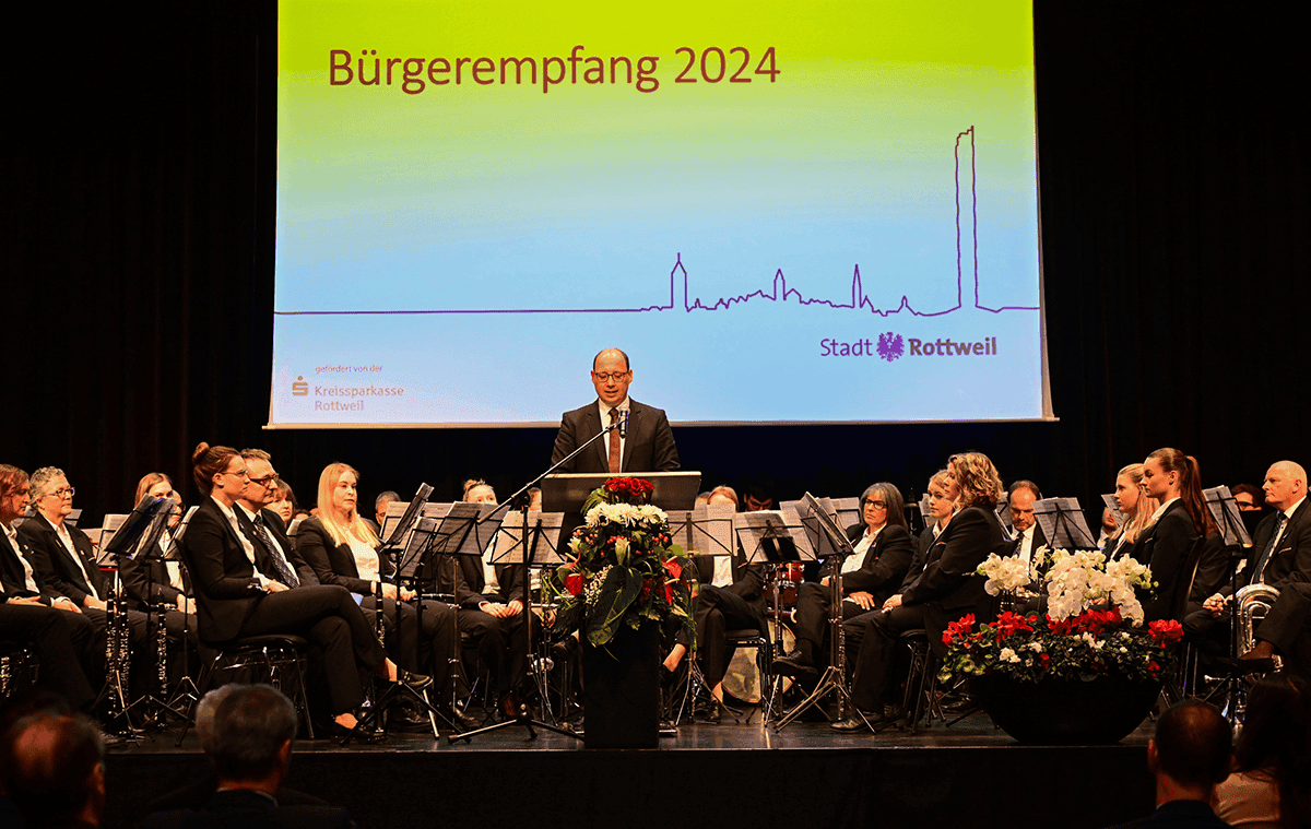Mein besonderer Dank geht gleich zu Beginn an die Stadtkapelle Rottweil unter der Leitung von Herrn Johannes Nikol, die uns musikalisch bereits begrüßt und in den Abend eingestimmt hat. Die korrekte Bezeichnung lautet Stadtmusikdirektor Johannes Nikol – diesen Titel hat der Gemeinderat Ihnen im vergangenen Jahr verliehen, um Ihre herausragenden Leistungen für die Stadtkapelle zu würdigen. Wir freuen uns noch auf weitere musikalische Beiträge im Laufe des Abends.