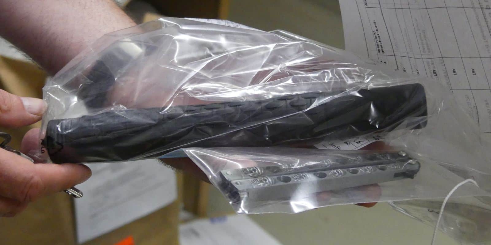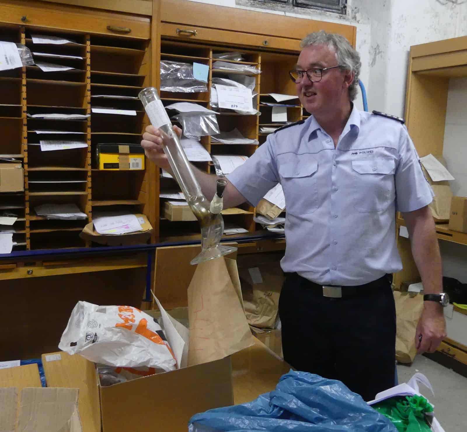 Nach einer Aussprache zu einigen lokalen Themen zeigte Lederer den Pressevertretern die Asservatenkammer im Untergeschoss des Reviers. Hier liegen fein säuberlich verpackt Gegenstände, die die Polizei im Zusammenhang Straftaten beschlagnahmt hat: Von einem klapprigen Damenfahrrad, Brecheisen oder Butterflymessern über eine gläserne Haschischpfeife, einen blauen Müllsack mit geschmuggelten Zigaretten bis hin zu Nuntchakos und einen echten asiatischen Schwert.