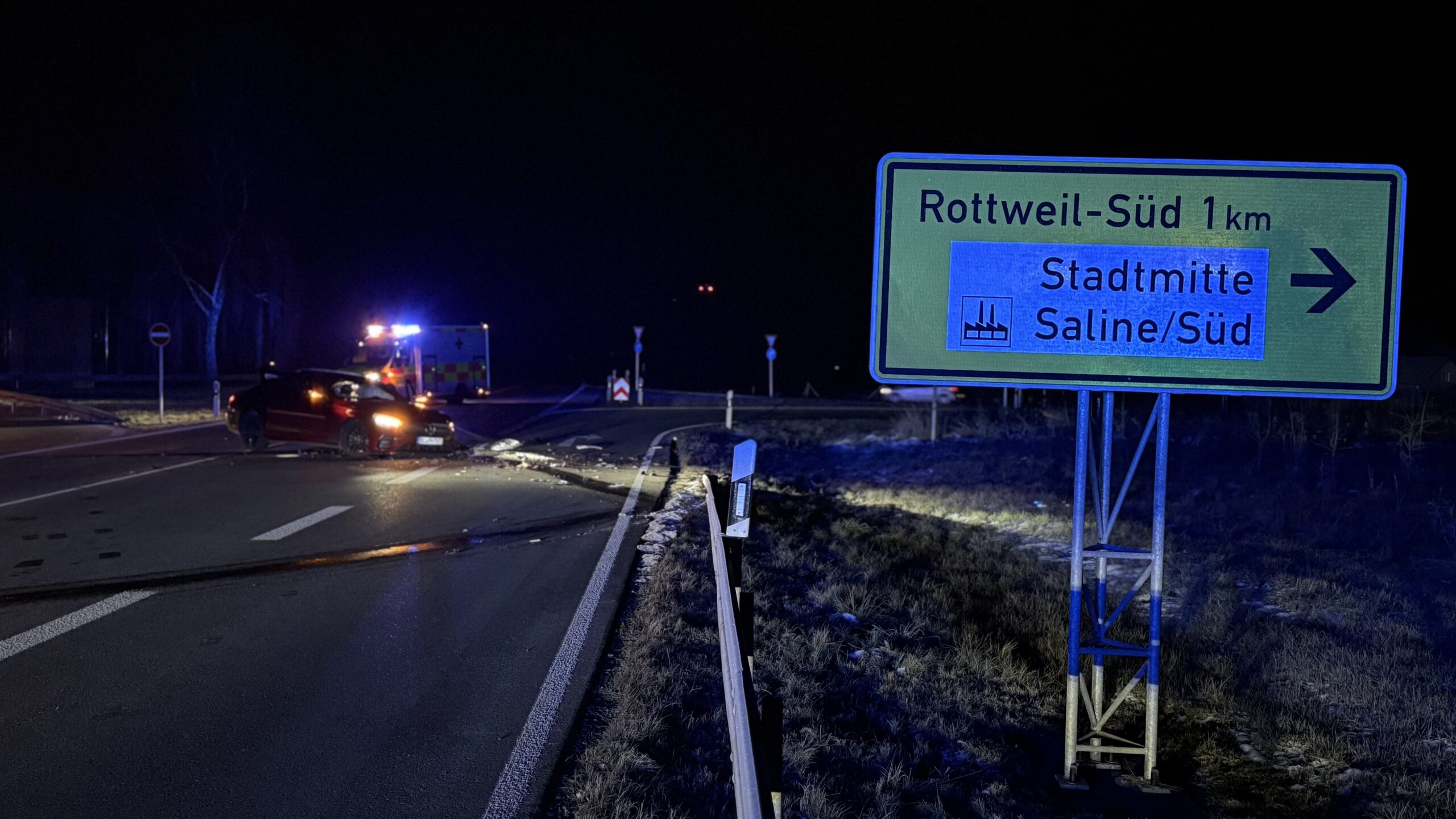 Der Unfall ereignete sich im Bereich des Kreuzes der Bundesstraßen 14 und 27 nahe Rottweil-Süd. Damit ist die Überleitung von Rottweil Richtung Tuttlingen beziehungsweise Schramberg in diesem Bereich nicht mehr passierbar.