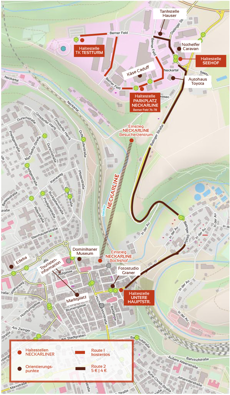 Eine zentrale Rolle spielt dabei ein sogenanntes „Bähnle“, das unter dem Namen „Neckarliner“ zwischen dem Berner Feld und der historischen Innenstadt pendelt. Die Strecke führt von der Haltestelle „Testturm“ über den Parkplatz der Hängebrücke zur Station „Seehof“ und weiter in die Untere Hauptstraße.