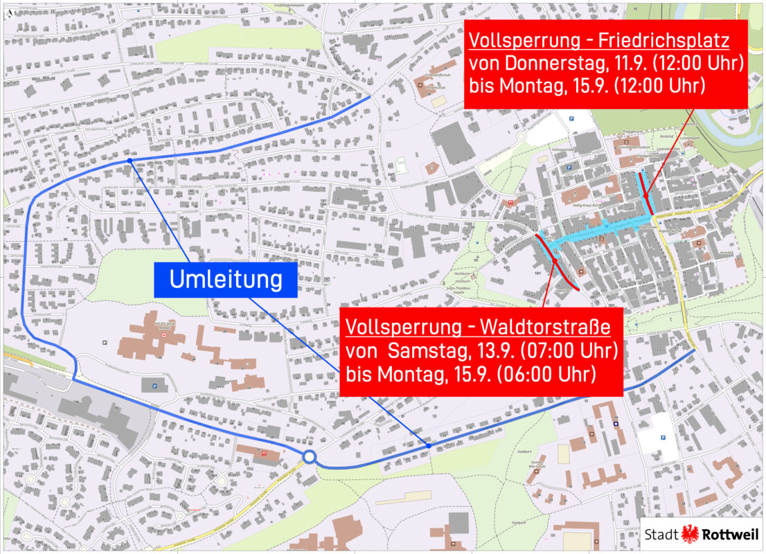 Wegen des Rottweiler Stadtfest am kommenden Wochenende, 13. und 14. September, weist die Stadtverwaltung auf Straßensperrungen in der historischen Innenstadt hin. Los geht es bereits am Donnerstag, 11. September, mit einer Sperrung des Friedrichsplatzes ab 12 Uhr. Dort wird wegen der Bauarbeiten auf dem Münsterplatz diesmal die große Stadtfest-Bühne für das musikalische Live-Programm aufgebaut.
