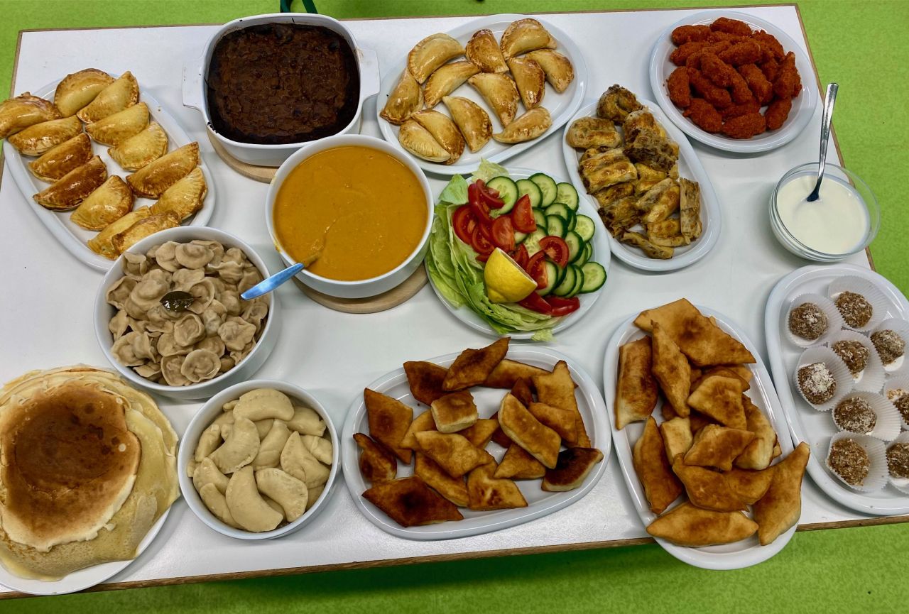 Nach drei Schulstunden in der Schulküche waren alle vom Ergebnis begeistert und genossen die leckeren Gerichte Wareniki, Cig Köfte, Türkische Linsensuppe, Schokobrownies, Pfannkuchen, Pite, Bombice, Pelimeni und Postlitos.